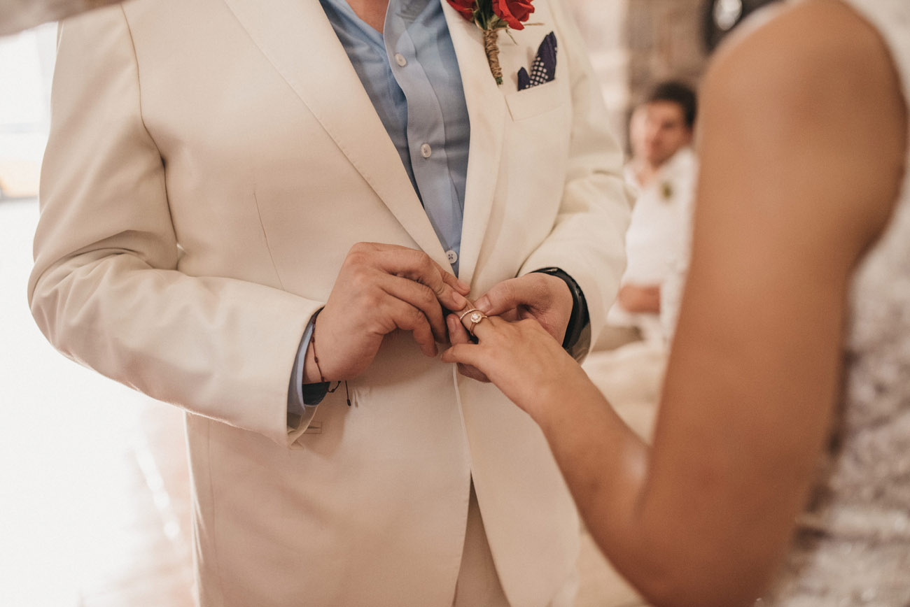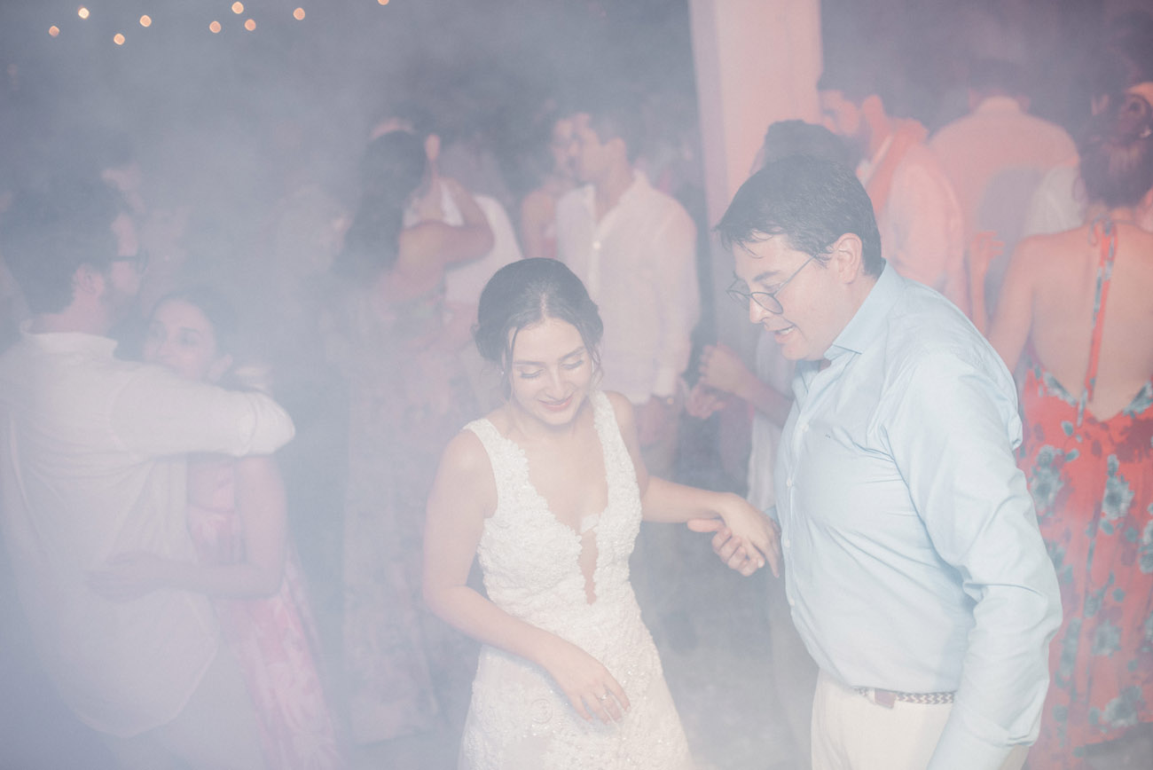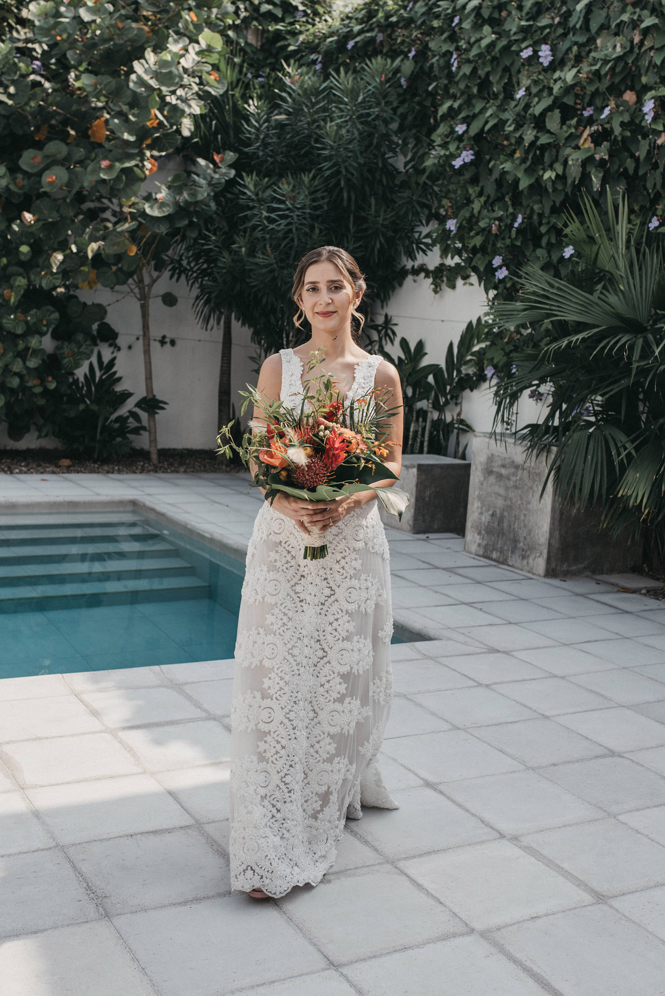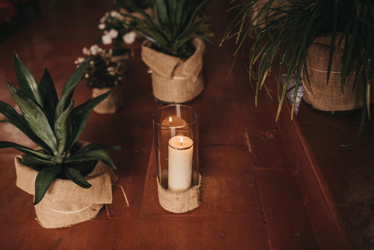 Soñaba con que su vestido de novia lo hiciera su tía Jenny Amador. Fue la que diseñó su vestido de bautizo, cuando aún no era consciente del cariño que le tiene ahora, el de la primera comunión, sus quince años, su grado… Lo quería bordado, después liso completamente, luego con flores de colores. Cuando supo que sería en Honda, se antojó de algo ligero, romántico y cómodo, un vestido para bailar y fluir. Entonces viajaron a Cartagena, al taller de Jenny, y al llegar, Camila se enamoró de una tela que después se convirtió en su vestido: hecho a mano cien por ciento, con pedrería, de escote profundo adelante y atrás y manga sisa. Sencillo, con la sutileza de los detalles bien pensados. Alrededor de su vestido (que se lo regaló su papá) hubo un montón de significados más; desde el maquillaje y el peinado, realizados por sus estilistas-amigos de toda la vida; el yugo, hecho por Don Eloy, empresa que quiere mucho y en la que trabajó, hasta las joyas: un anillo que su mamá le prestó y las aretas que su suegra le regaló.