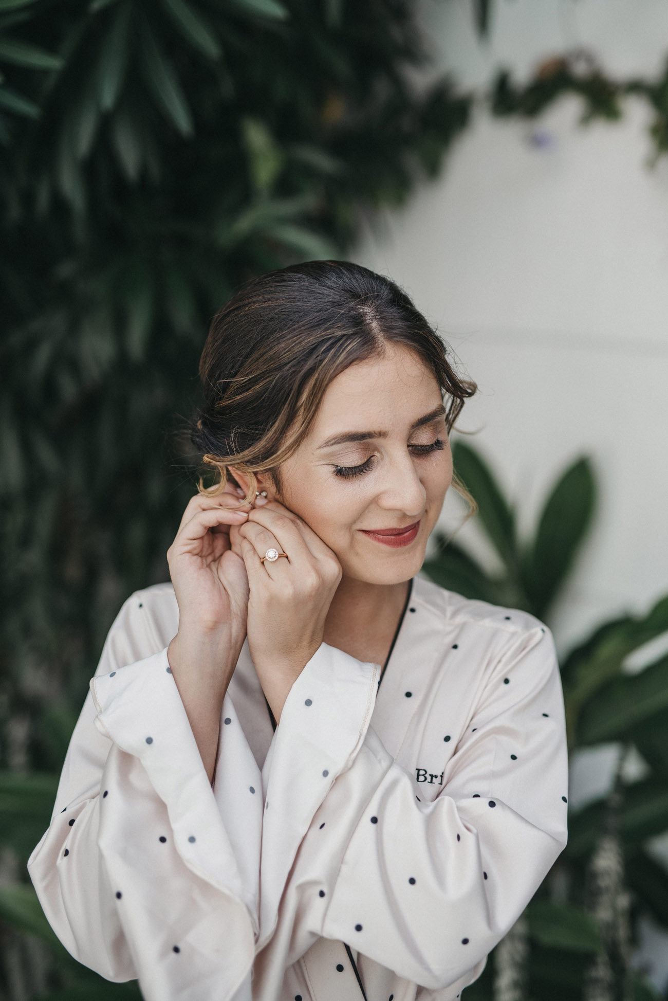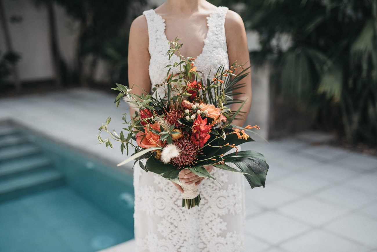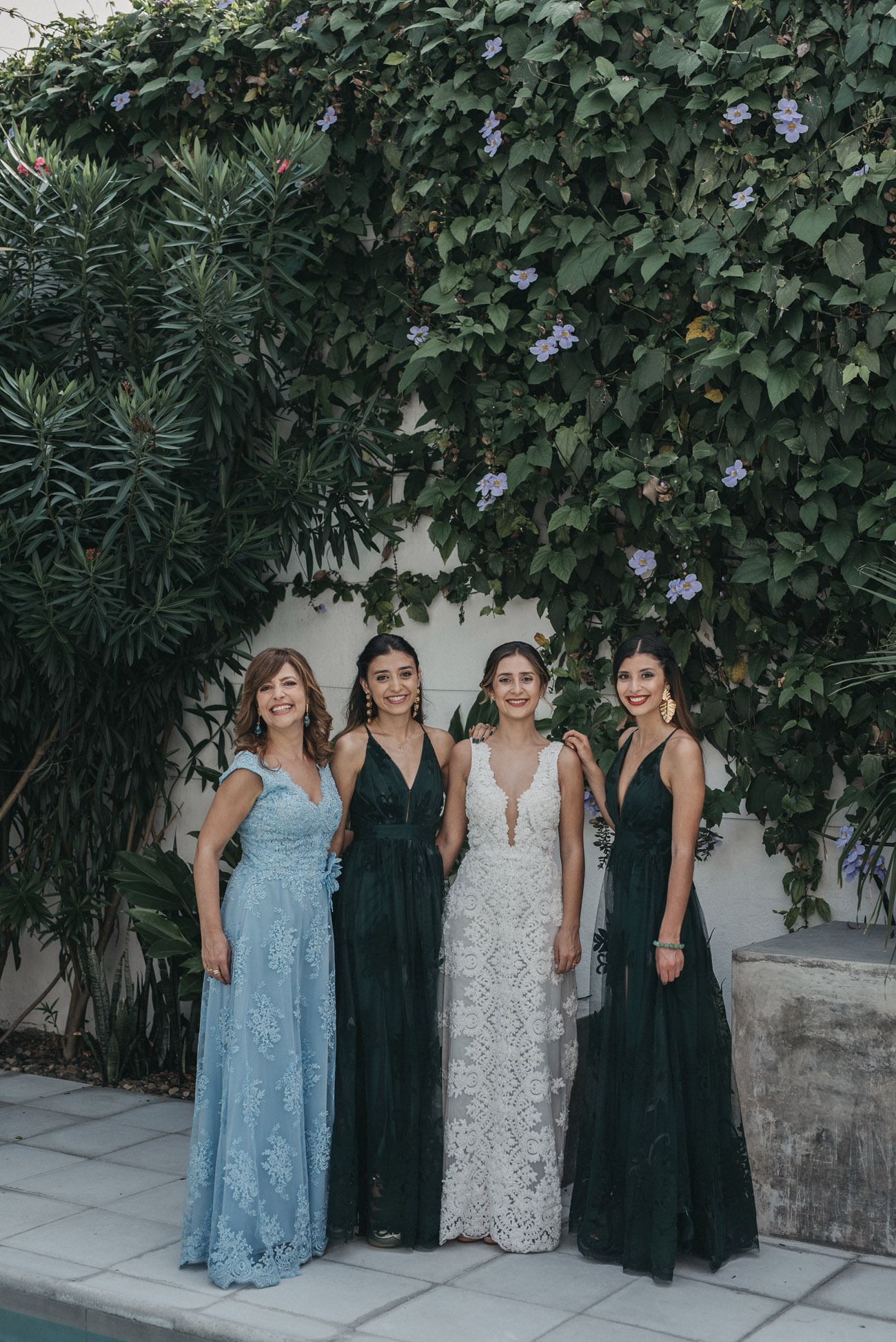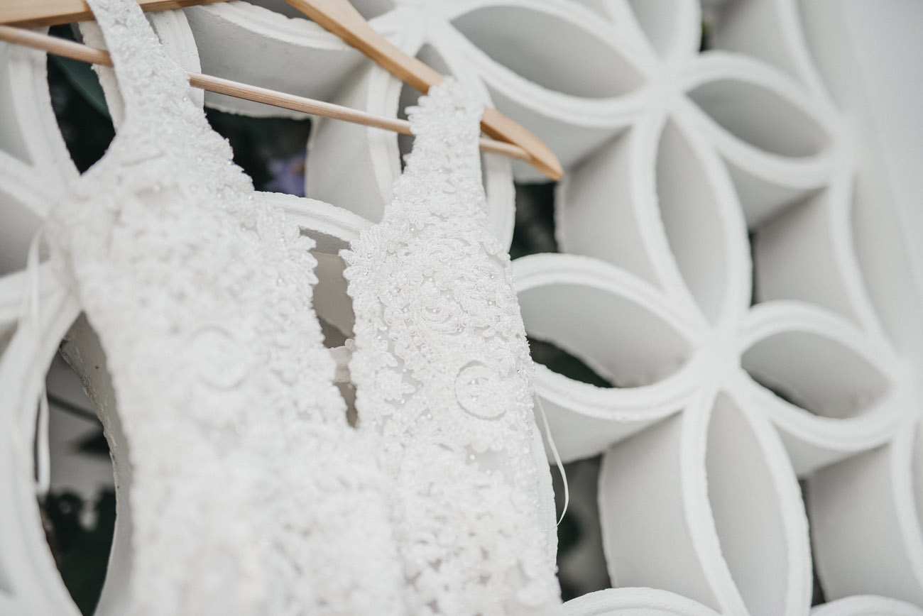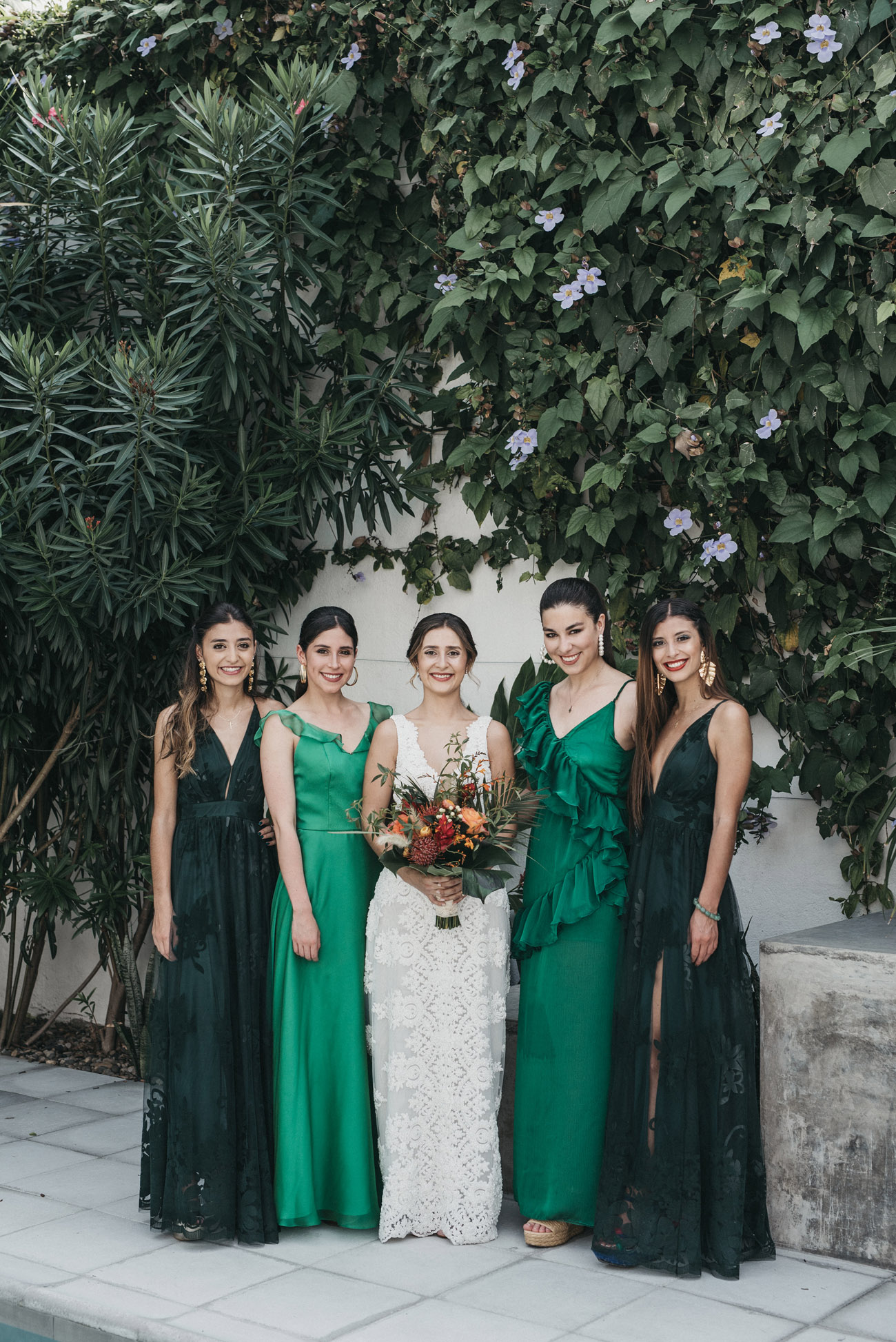 Soñaba con que su vestido de novia lo hiciera su tía Jenny Amador. Fue la que diseñó su vestido de bautizo, cuando aún no era consciente del cariño que le tiene ahora, el de la primera comunión, sus quince años, su grado… Lo quería bordado, después liso completamente, luego con flores de colores. Cuando supo que sería en Honda, se antojó de algo ligero, romántico y cómodo, un vestido para bailar y fluir. Entonces viajaron a Cartagena, al taller de Jenny, y al llegar, Camila se enamoró de una tela que después se convirtió en su vestido: hecho a mano cien por ciento, con pedrería, de escote profundo adelante y atrás y manga sisa. Sencillo, con la sutileza de los detalles bien pensados. Alrededor de su vestido (que se lo regaló su papá) hubo un montón de significados más; desde el maquillaje y el peinado, realizados por sus estilistas-amigos de toda la vida; el yugo, hecho por Don Eloy, empresa que quiere mucho y en la que trabajó, hasta las joyas: un anillo que su mamá le prestó y las aretas que su suegra le regaló.