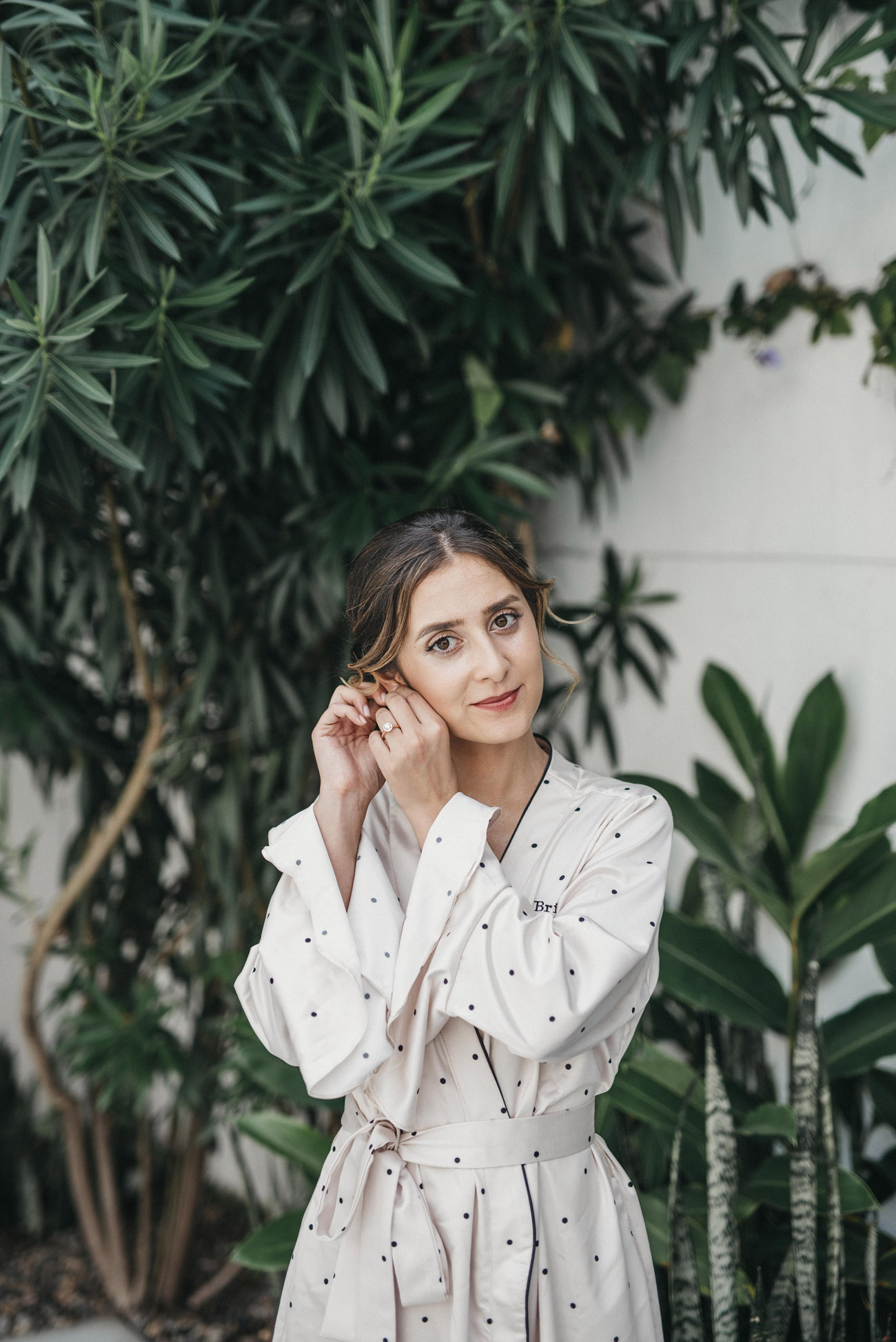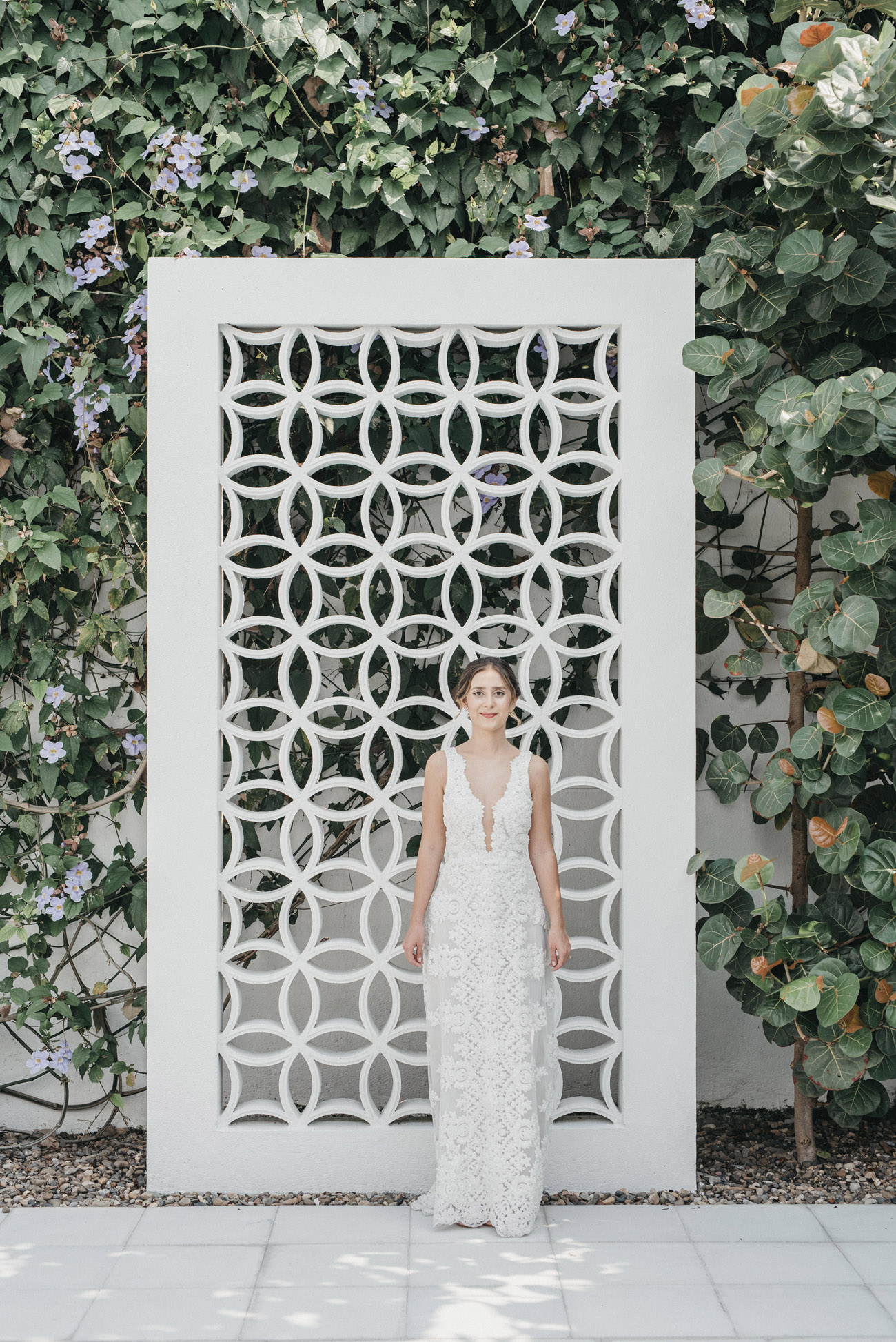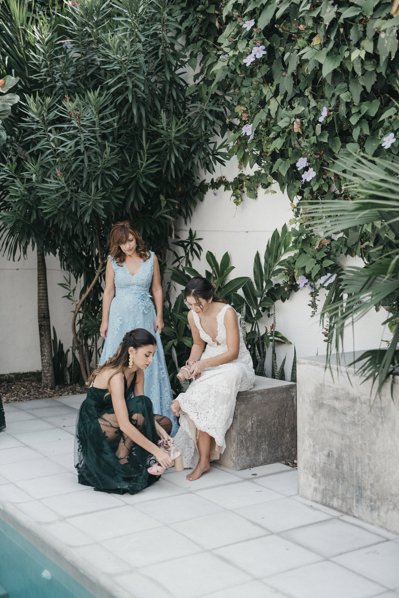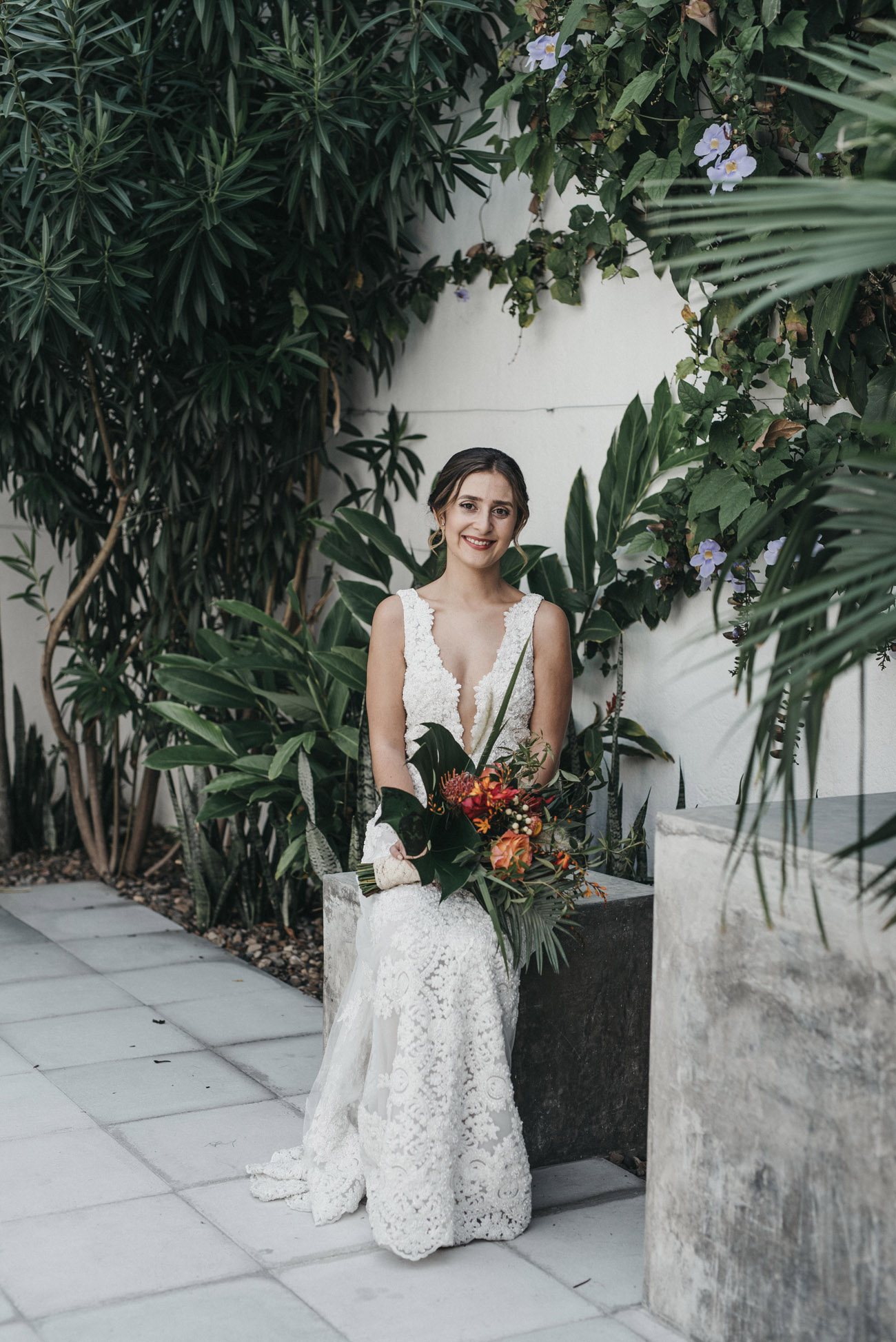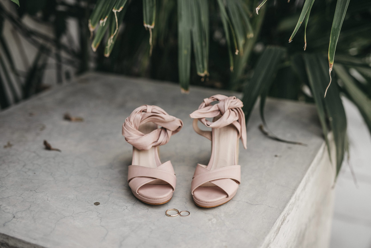Soñaba con que su vestido de novia lo hiciera su tía Jenny Amador. Fue la que diseñó su vestido de bautizo, cuando aún no era consciente del cariño que le tiene ahora, el de la primera comunión, sus quince años, su grado… Lo quería bordado, después liso completamente, luego con flores de colores. Cuando supo que sería en Honda, se antojó de algo ligero, romántico y cómodo, un vestido para bailar y fluir. Entonces viajaron a Cartagena, al taller de Jenny, y al llegar, Camila se enamoró de una tela que después se convirtió en su vestido: hecho a mano cien por ciento, con pedrería, de escote profundo adelante y atrás y manga sisa. Sencillo, con la sutileza de los detalles bien pensados. Alrededor de su vestido (que se lo regaló su papá) hubo un montón de significados más; desde el maquillaje y el peinado, realizados por sus estilistas-amigos de toda la vida; el yugo, hecho por Don Eloy, empresa que quiere mucho y en la que trabajó, hasta las joyas: un anillo que su mamá le prestó y las aretas que su suegra le regaló.