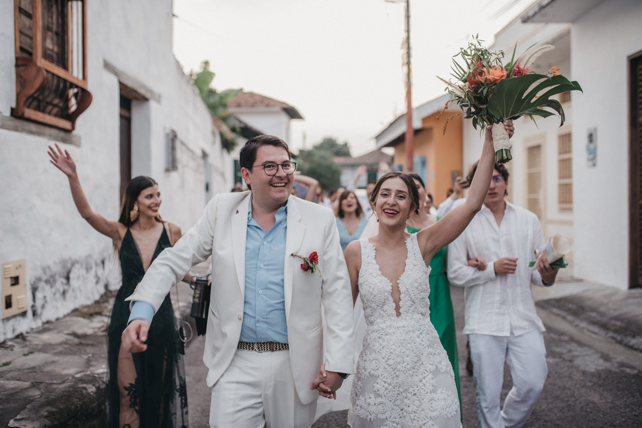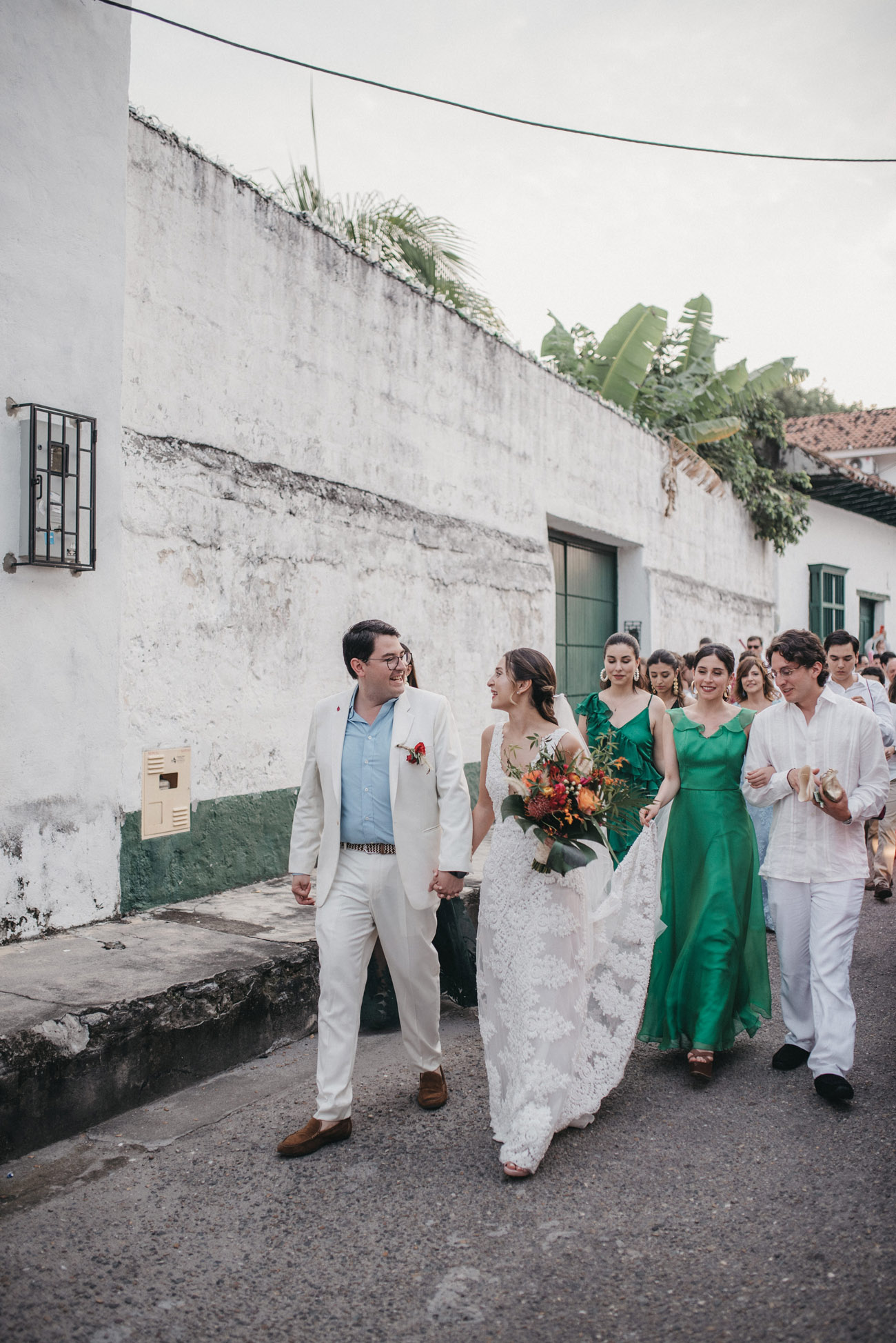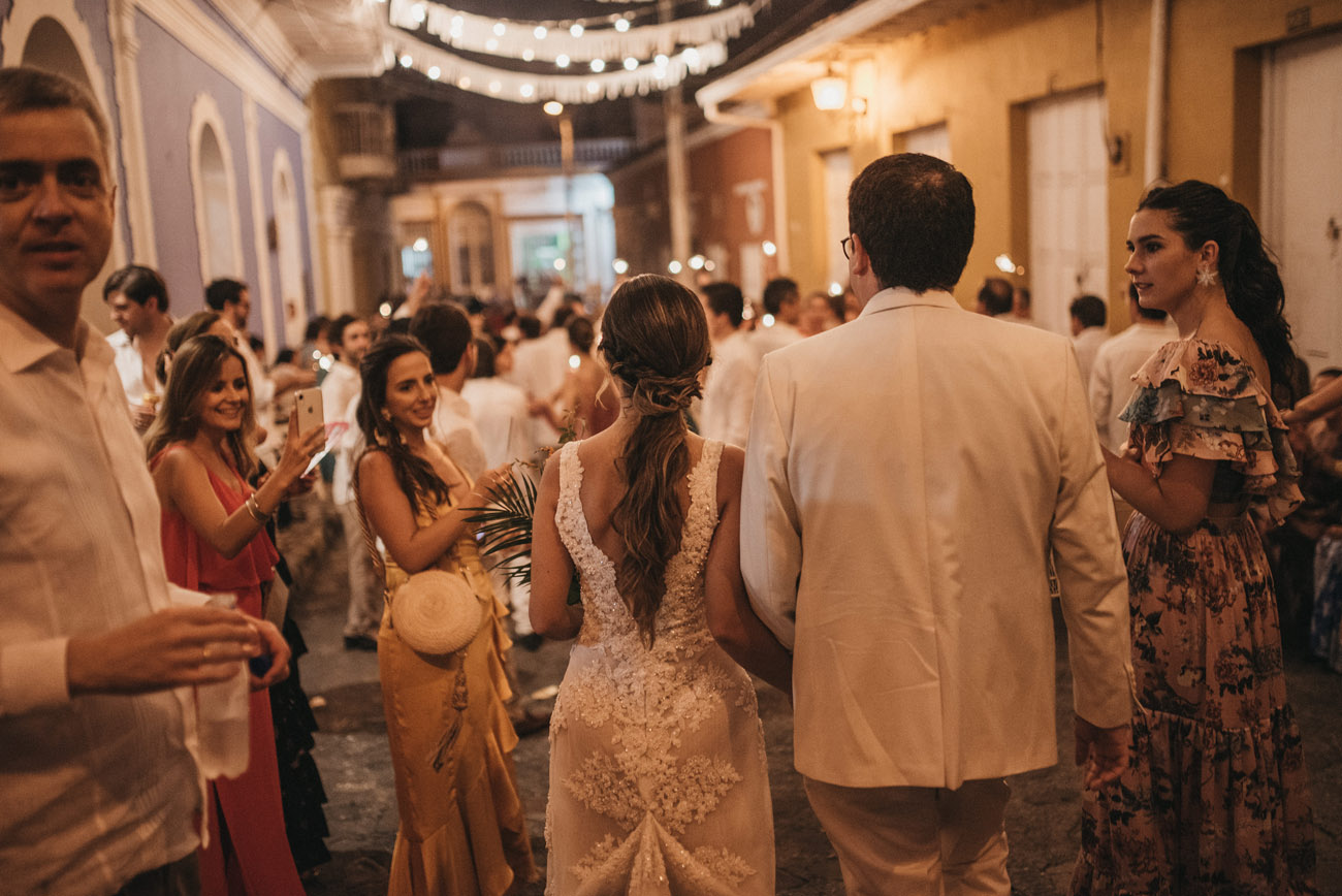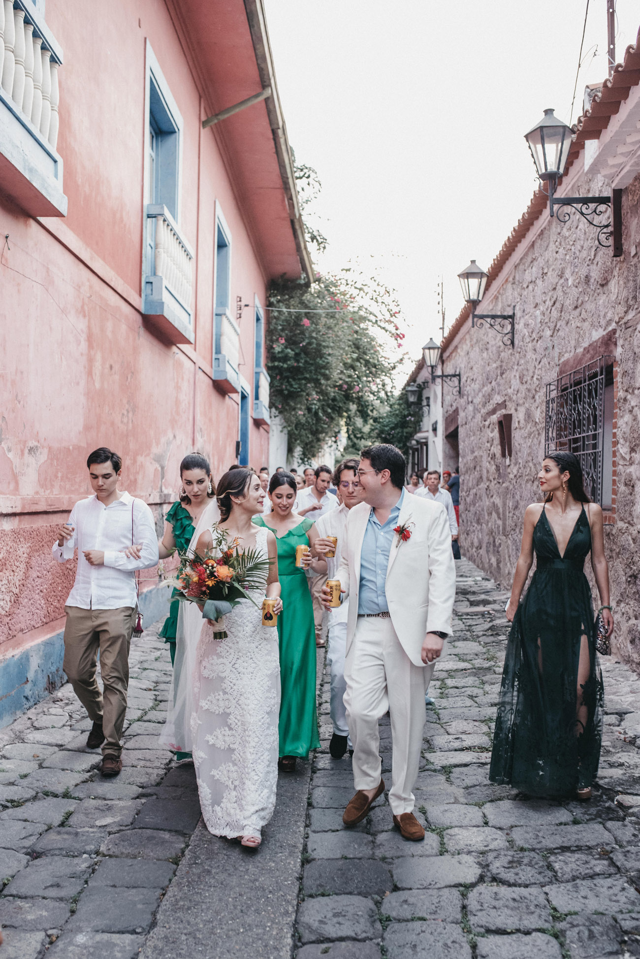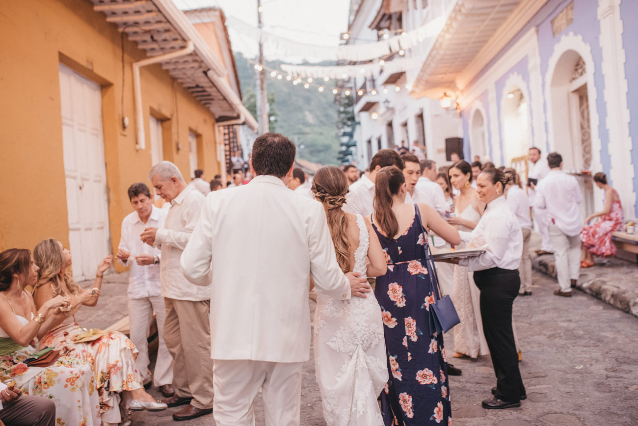 Cuando salieron de la iglesia los recibió una papayera, a ellos, a los invitados y a muchas personas del pueblo que quisieron mirar de cerca ese amor. Y así se fueron, bailando, aplaudiendo, cantando hasta la casona a seguir celebrando, a seguir sonriendo. Antes de entrar a la casa hubo coctel en esa calle empedrada que el sol amarillento hacía lucir más, que decoraron con banderines blancos y bombillitos, que parecía una fiesta de plaza, encantadora, romántica, de otros tiempos.