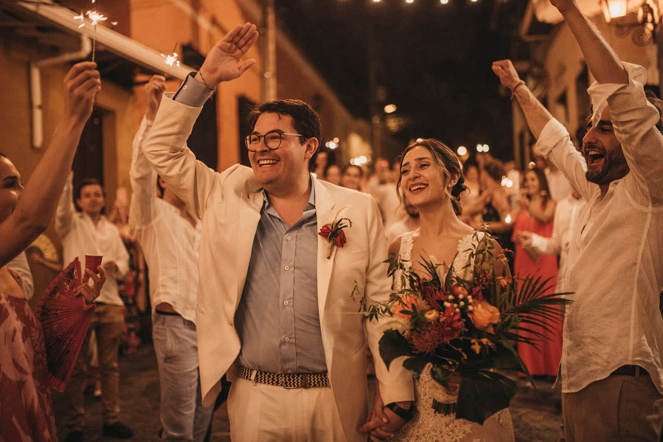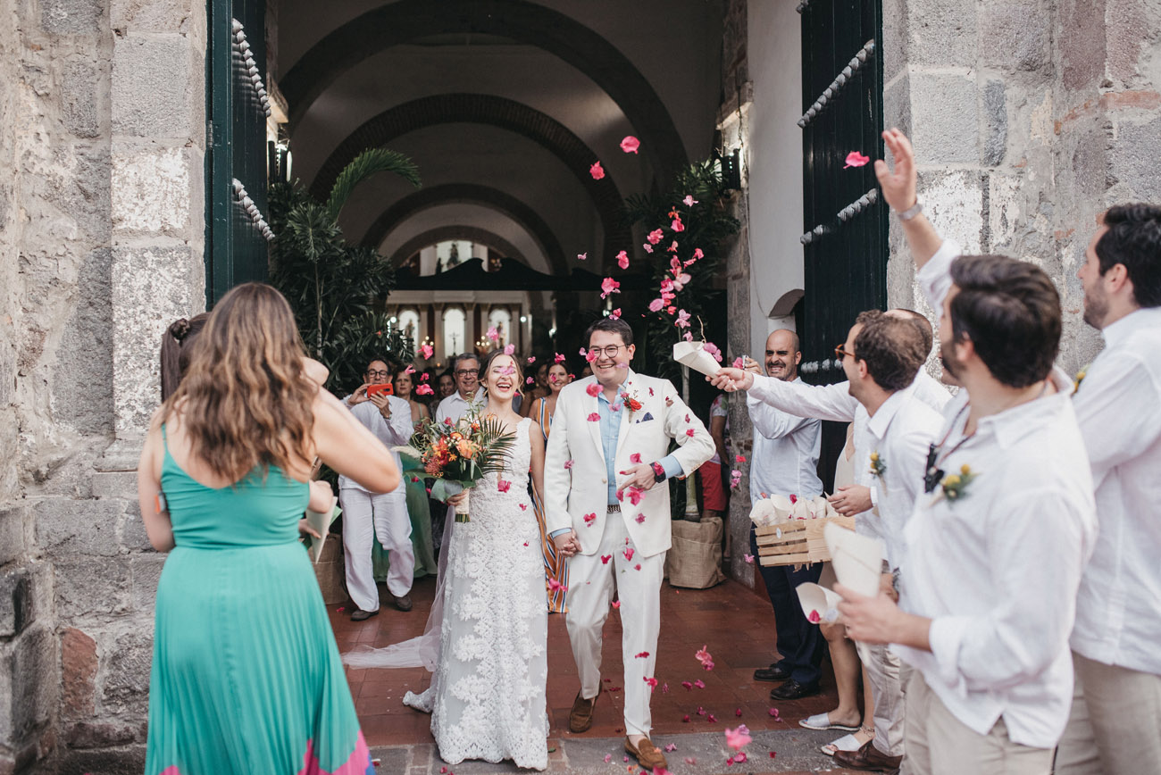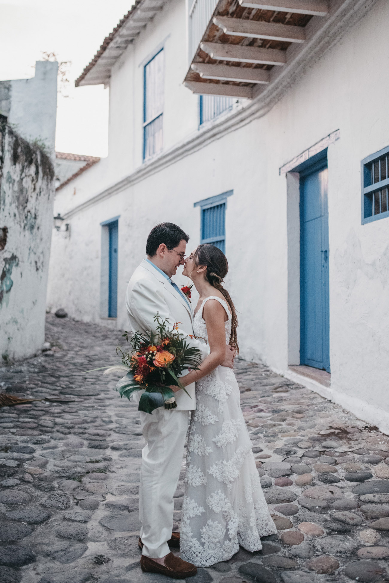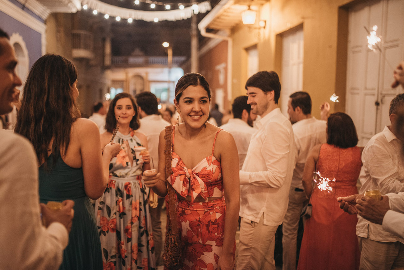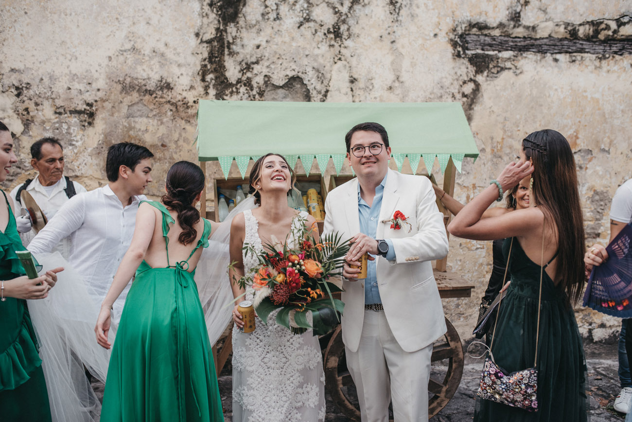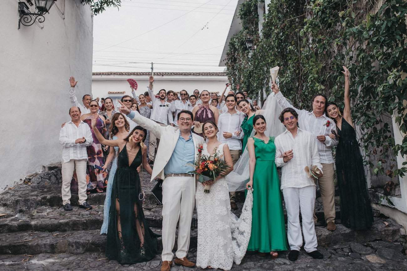 Cuando salieron de la iglesia los recibió una papayera, a ellos, a los invitados y a muchas personas del pueblo que quisieron mirar de cerca ese amor. Y así se fueron, bailando, aplaudiendo, cantando hasta la casona a seguir celebrando, a seguir sonriendo. Antes de entrar a la casa hubo coctel en esa calle empedrada que el sol amarillento hacía lucir más, que decoraron con banderines blancos y bombillitos, que parecía una fiesta de plaza, encantadora, romántica, de otros tiempos.