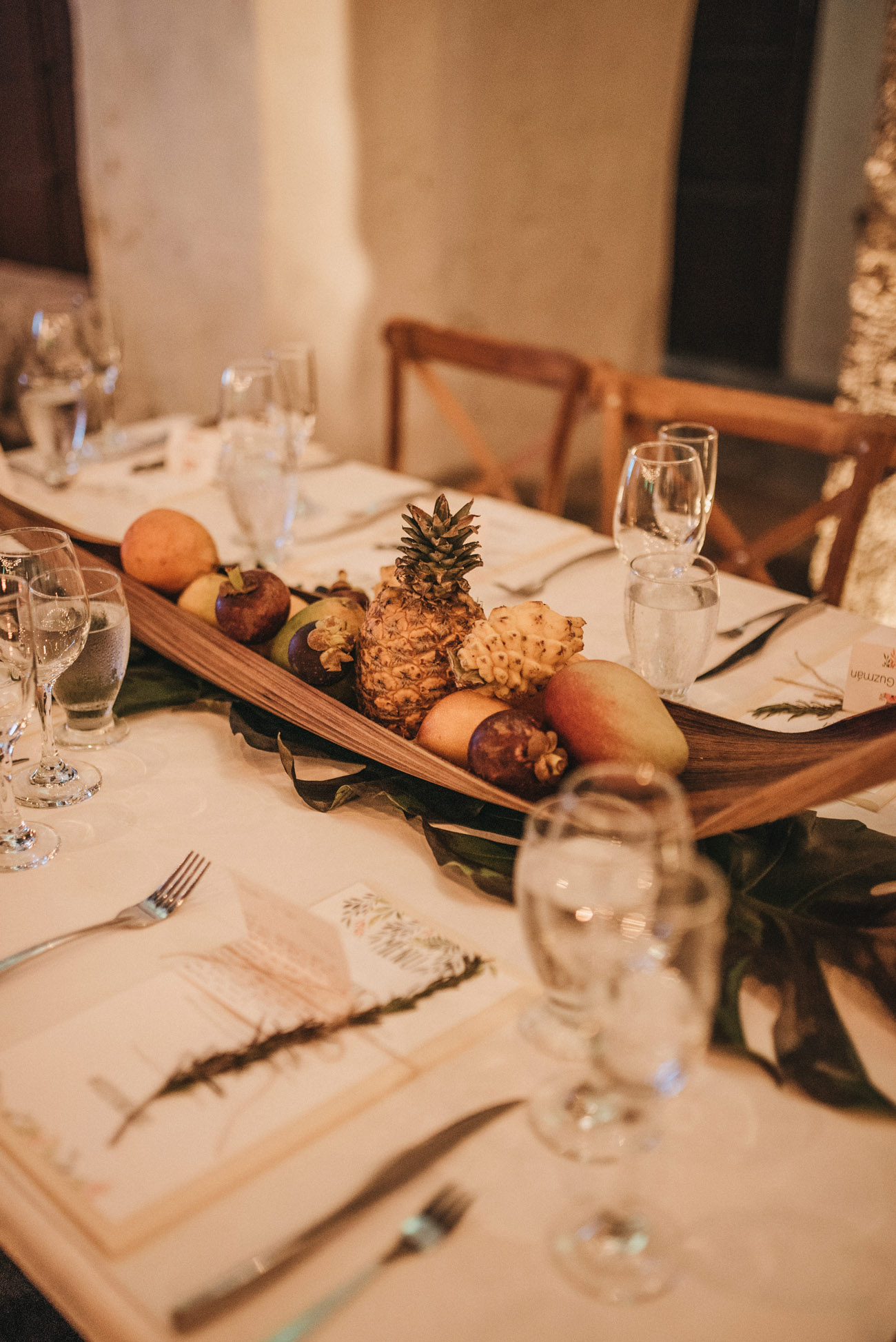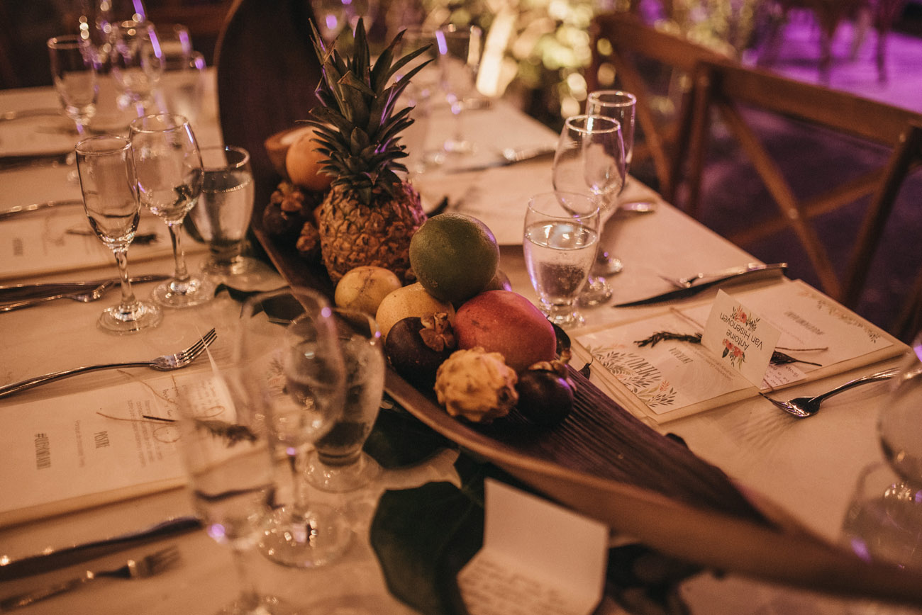 Después del coctel, hubo tiempo para admirar y maravillarse con esa casona, con sus paredes rugosas, con el verde y las luces, con las mini canoas llenas de frutas que estaban en las mesas, con la arquitectura de cielo abierto.