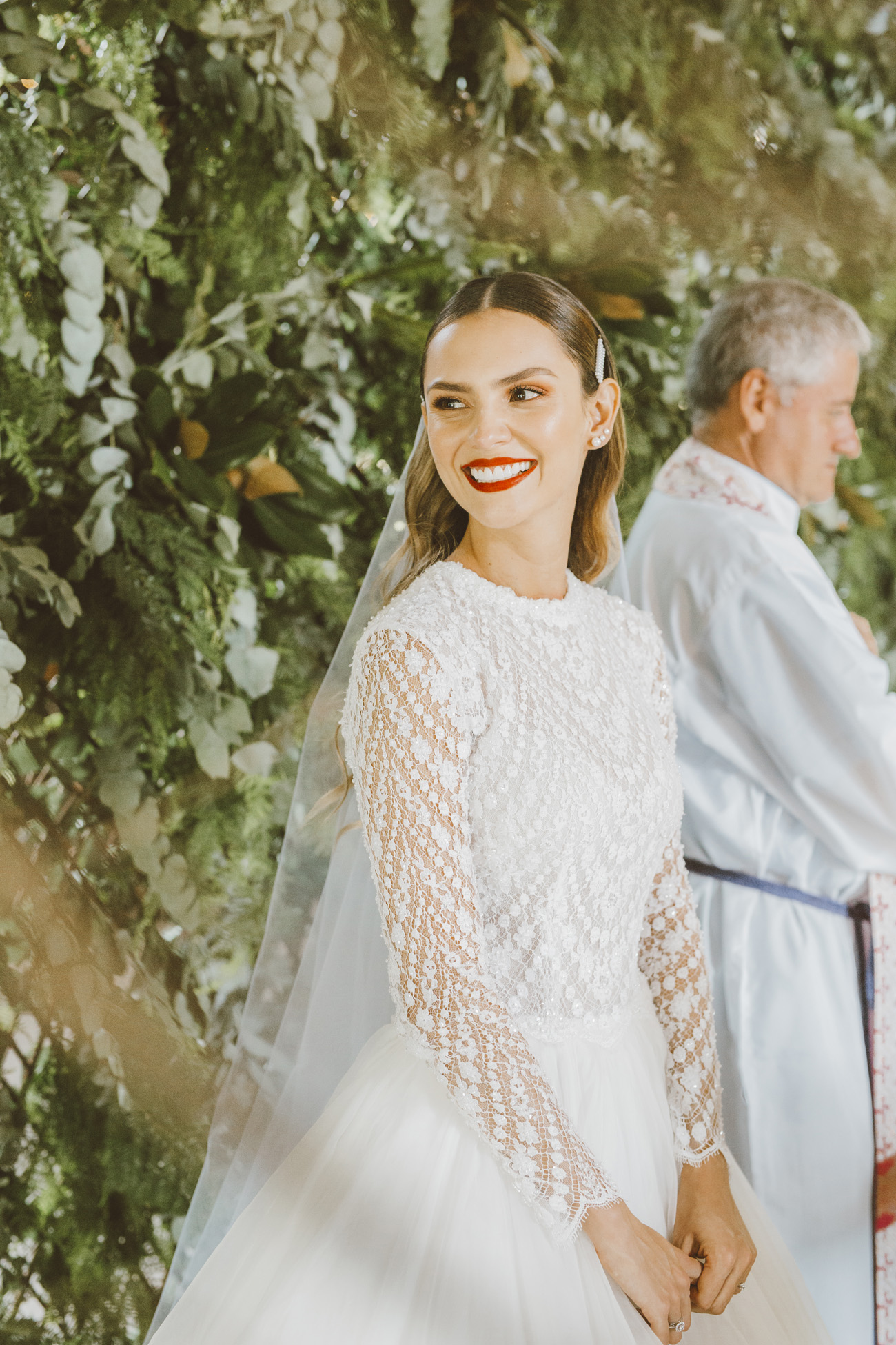 Para su look optó por un maquillaje natural, pero con labios y uñas rojos; por un peinado sencillo pero arriesgado para una novia. Así es ella en su cotidianidad: prefiere impactar a partir de pequeños detalles.