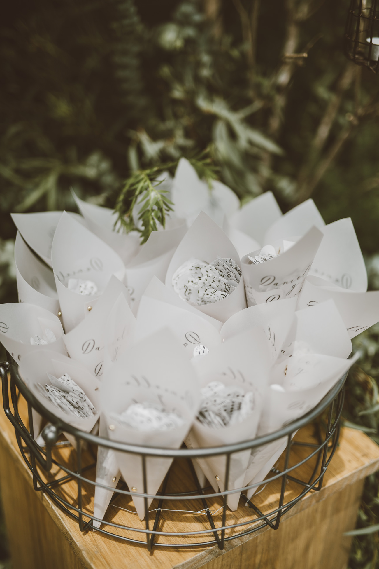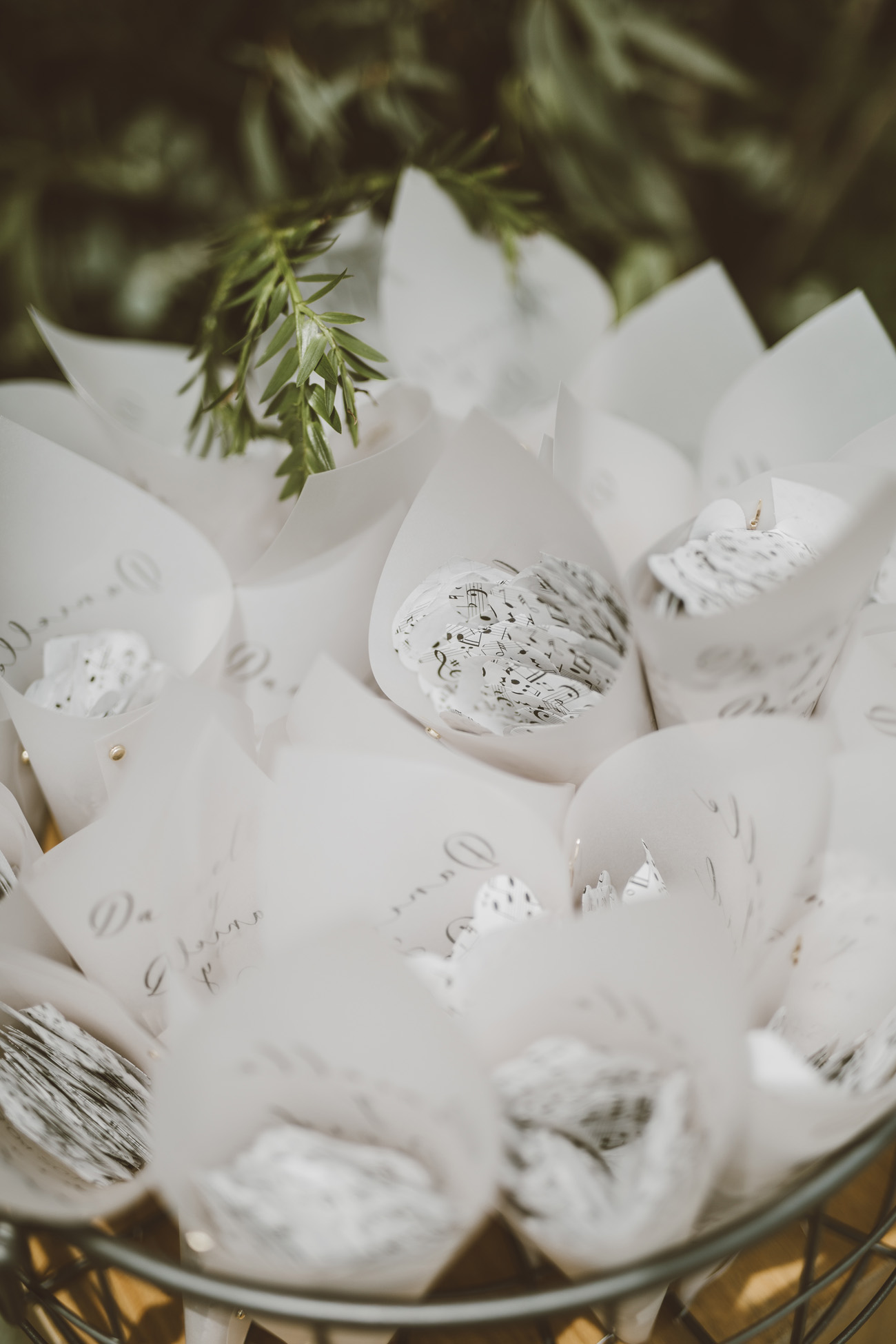 A la salida de la ceremonia, en vez de pétalos, los invitados recibieron unos conos de papel con corazones que llevaban impresas notas musicales (también de papel)