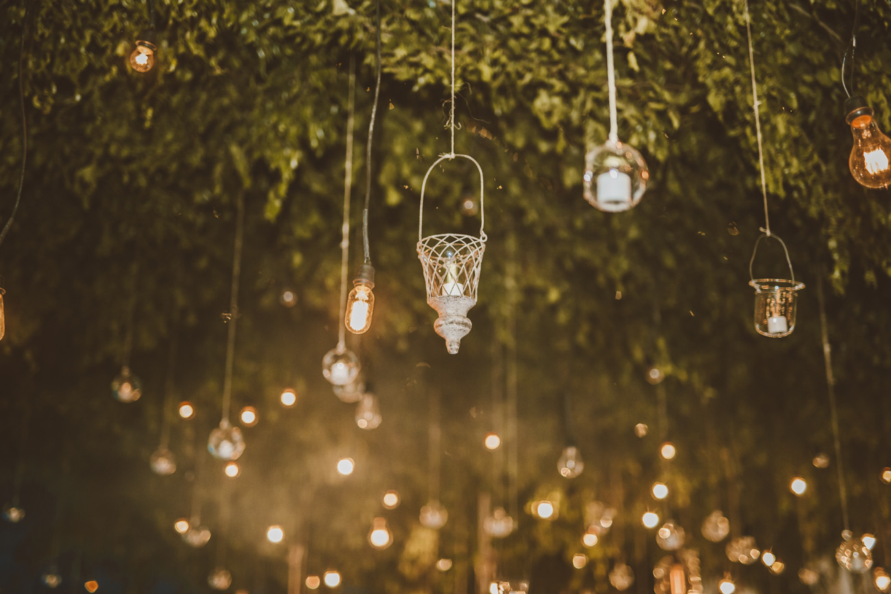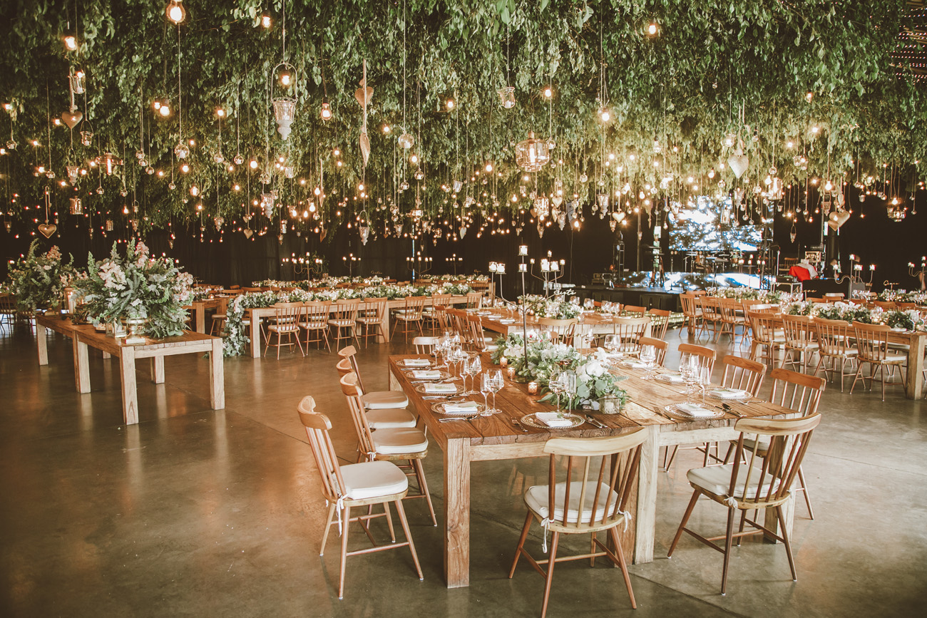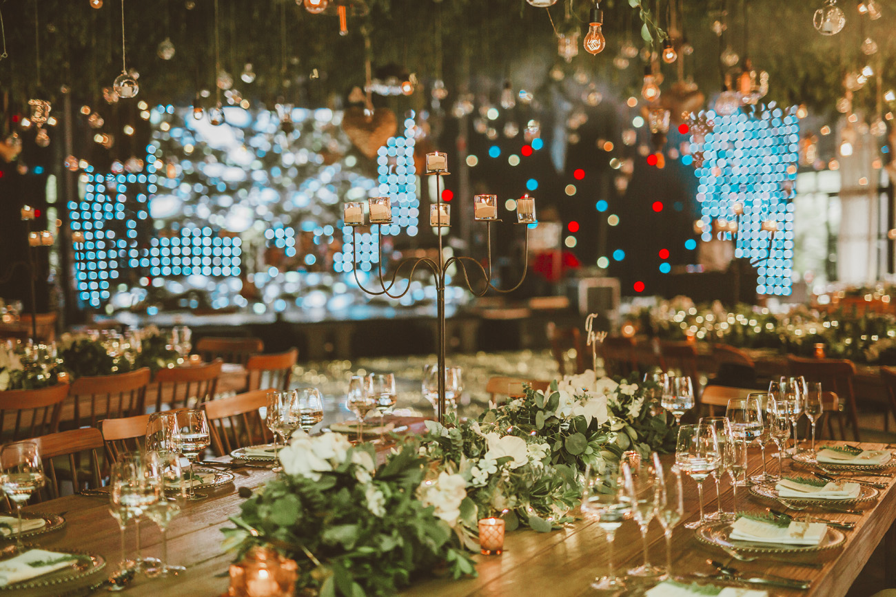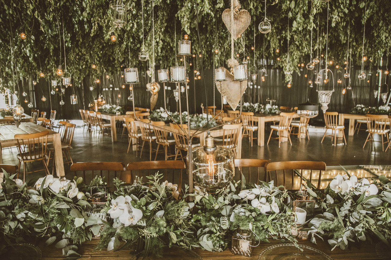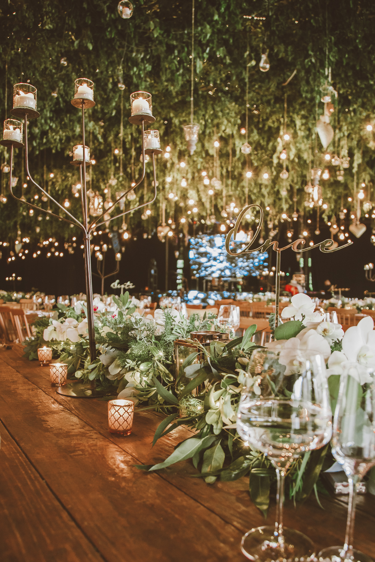 Mucho follaje verde, orquídeas blancas y luz, siempre luz, mucha luz: natural, de velones, de velas, de faroles, de lámparas. Luz: el sinónimo del amor