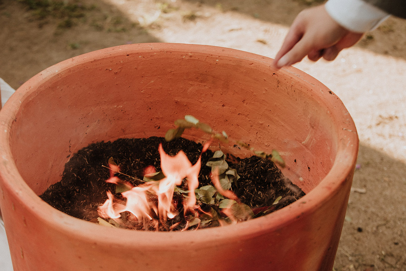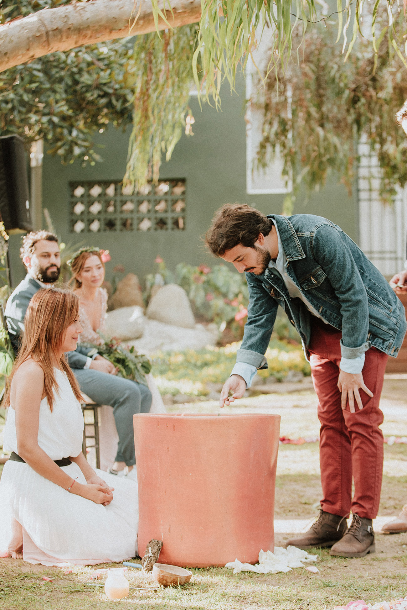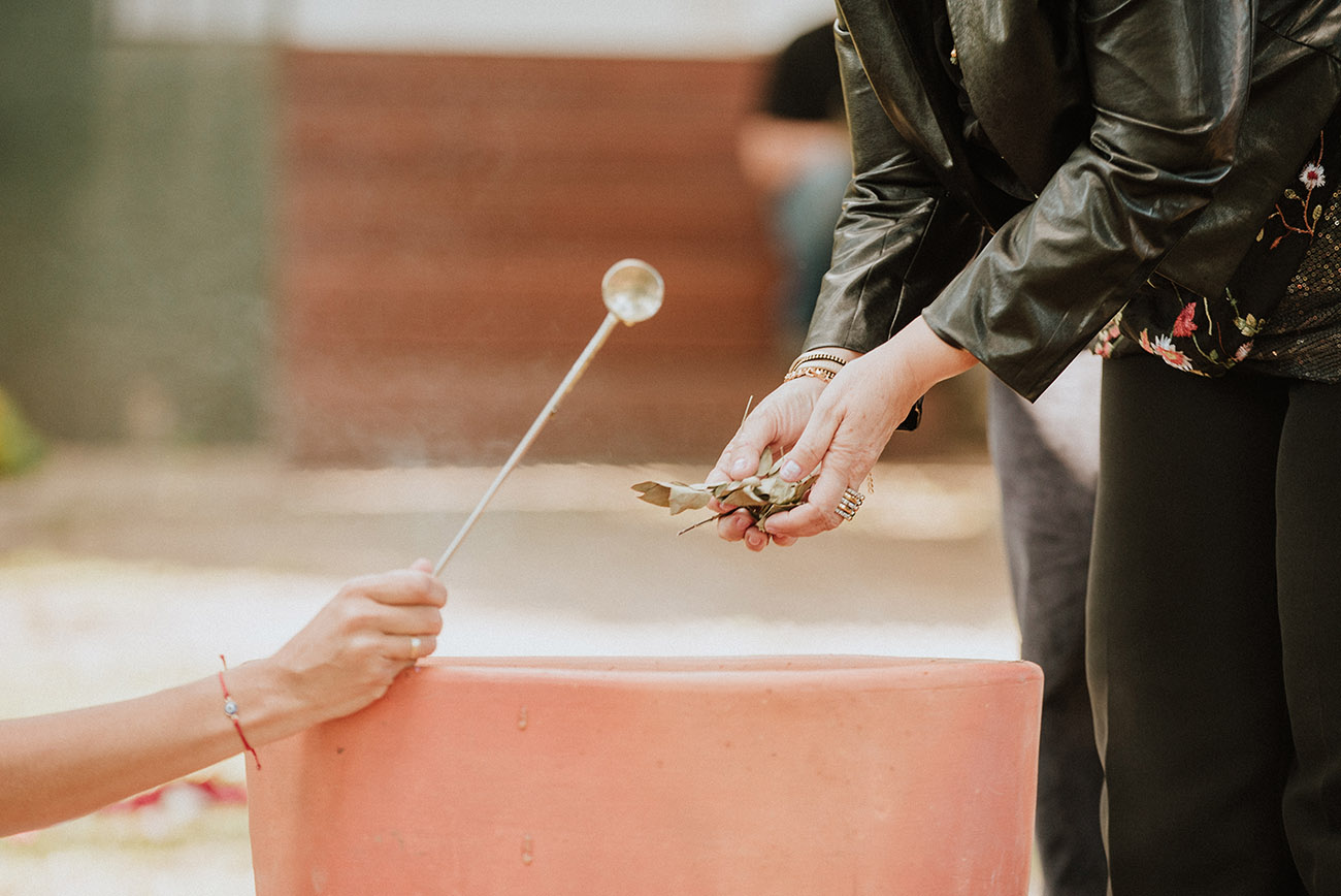 Se trataba de un gesto de gratitud hacia la naturaleza, una devolución a tantos beneficios, un retorno justo. Lo primero que quisieron fue sentarse de frente a sus invitados, sus amigos, sus familias. Mirarlos, interactuar, mostrarles agradecimiento. Ellos, por su parte, quemaron eucaliptos y les enviaron —mentalmente— intenciones de amor, de tranquilidad, de alegría, de unión. Después, Irina y Mauricio recogieron las cenizas para devolverlas a la tierra y sembraron un árbol. Sembraron vida, sembraron viento, sembraron latidos.