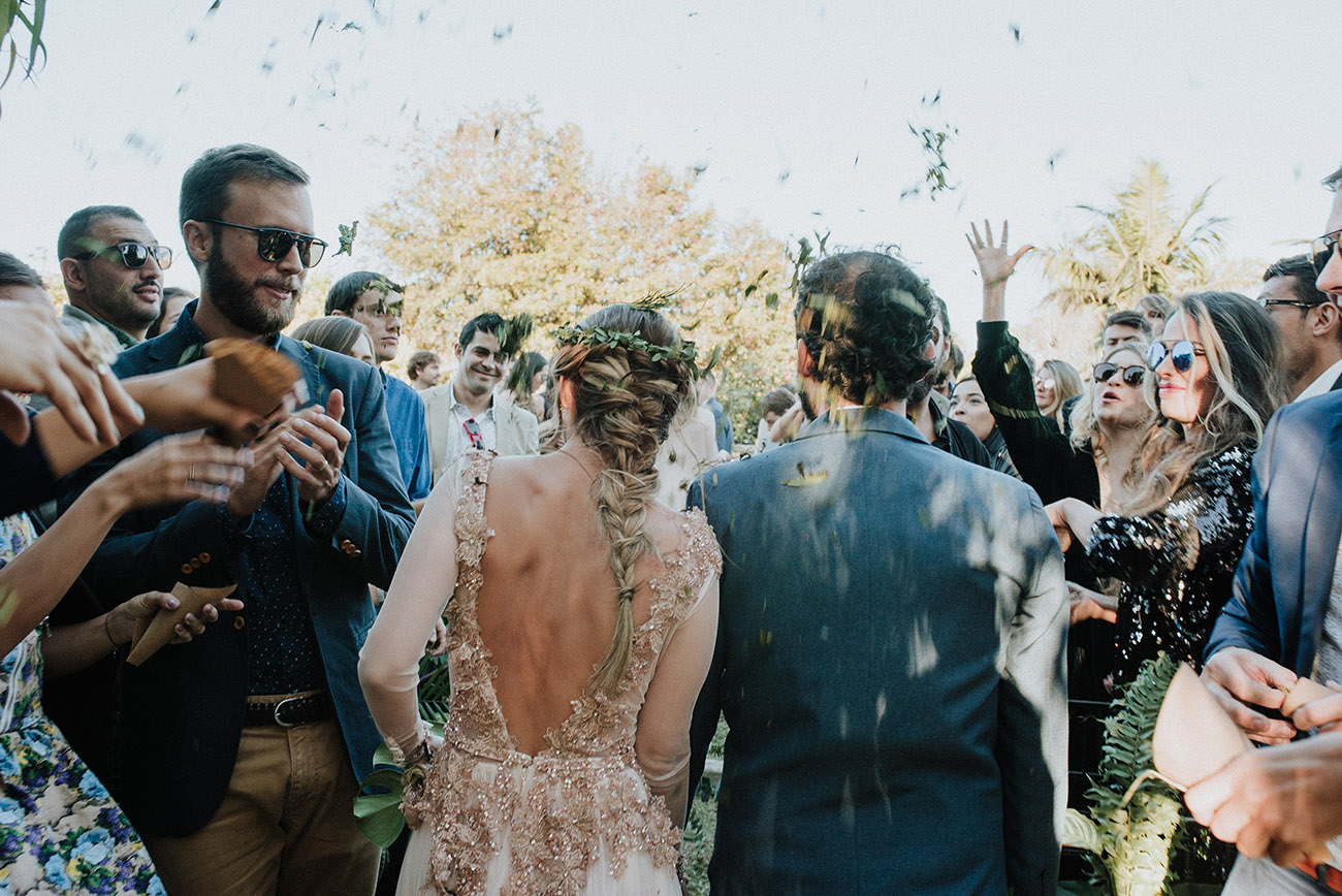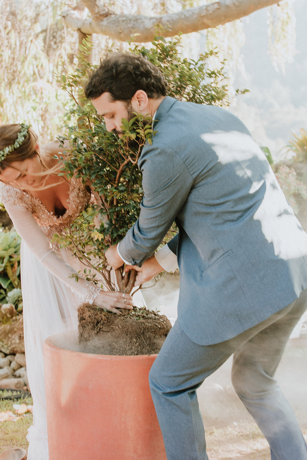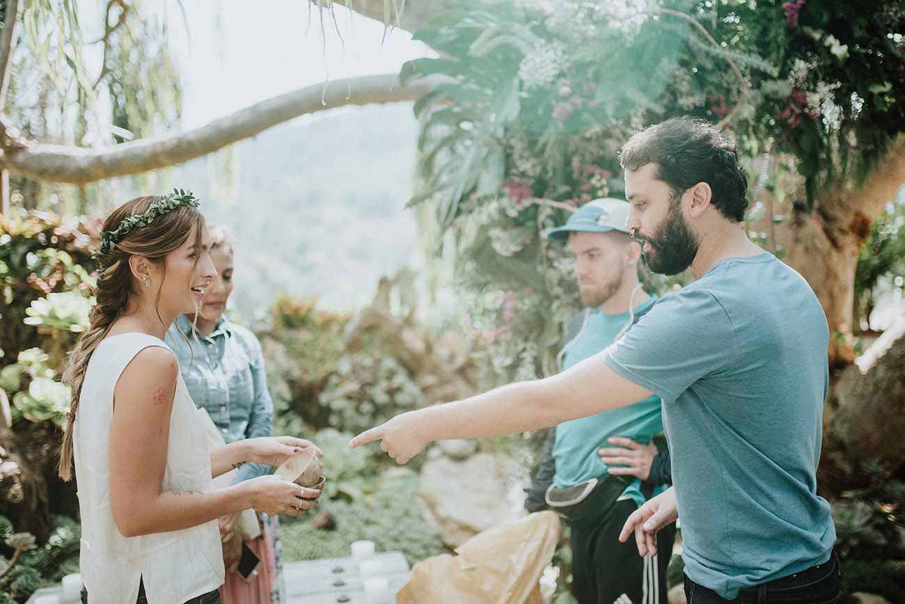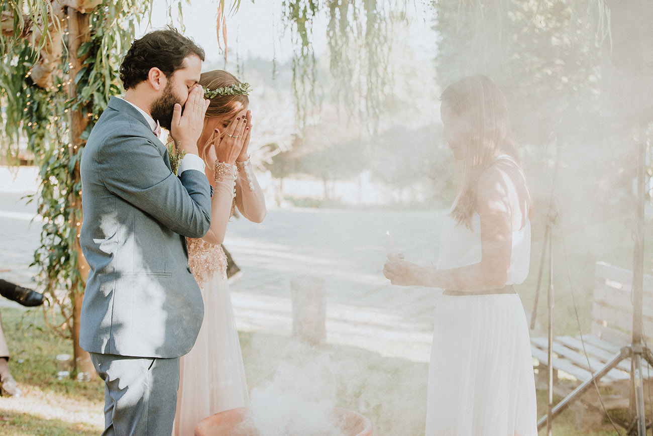 Se trataba de un gesto de gratitud hacia la naturaleza, una devolución a tantos beneficios, un retorno justo. Lo primero que quisieron fue sentarse de frente a sus invitados, sus amigos, sus familias. Mirarlos, interactuar, mostrarles agradecimiento. Ellos, por su parte, quemaron eucaliptos y les enviaron —mentalmente— intenciones de amor, de tranquilidad, de alegría, de unión. Después, Irina y Mauricio recogieron las cenizas para devolverlas a la tierra y sembraron un árbol. Sembraron vida, sembraron viento, sembraron latidos.
