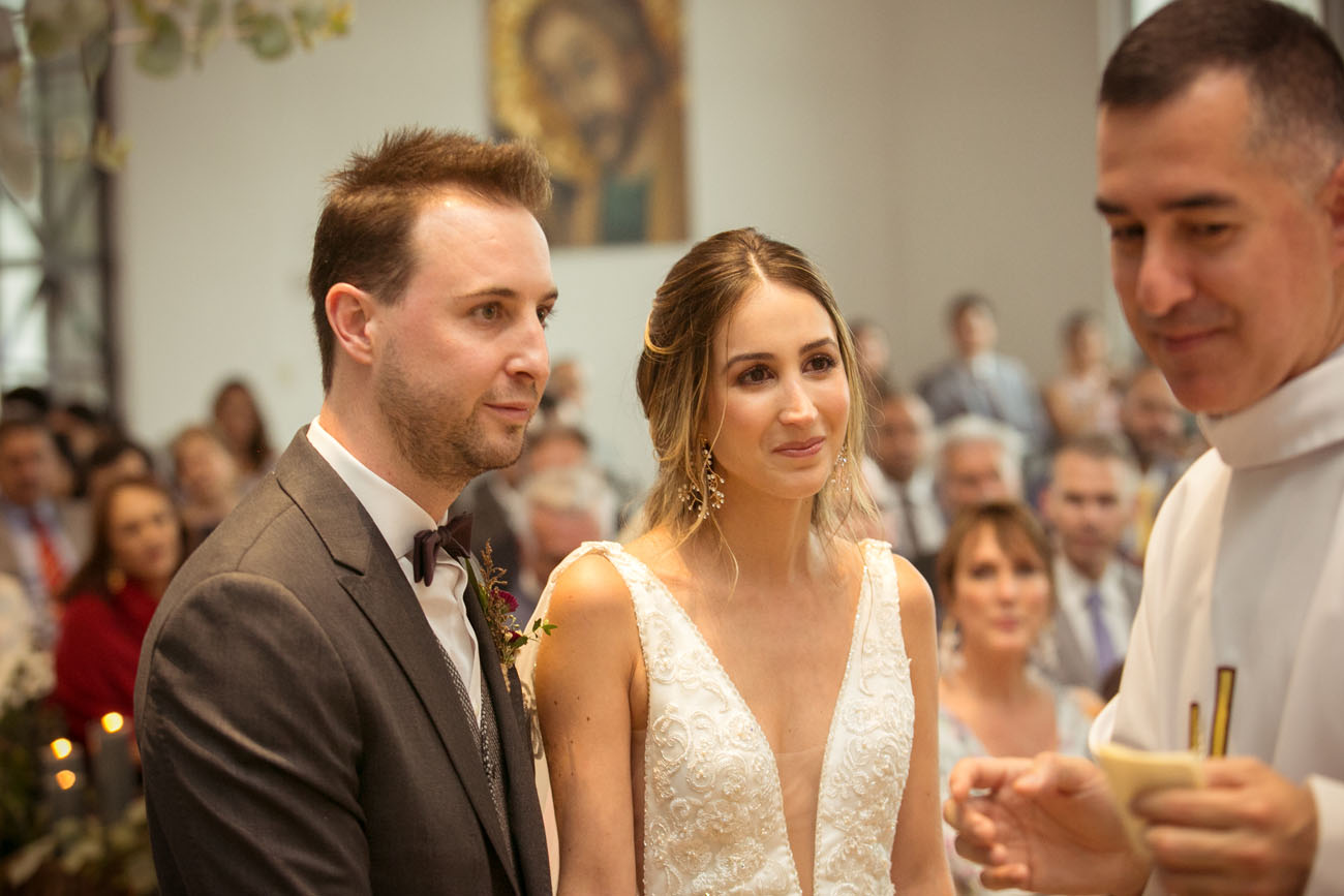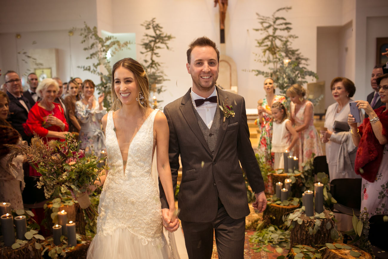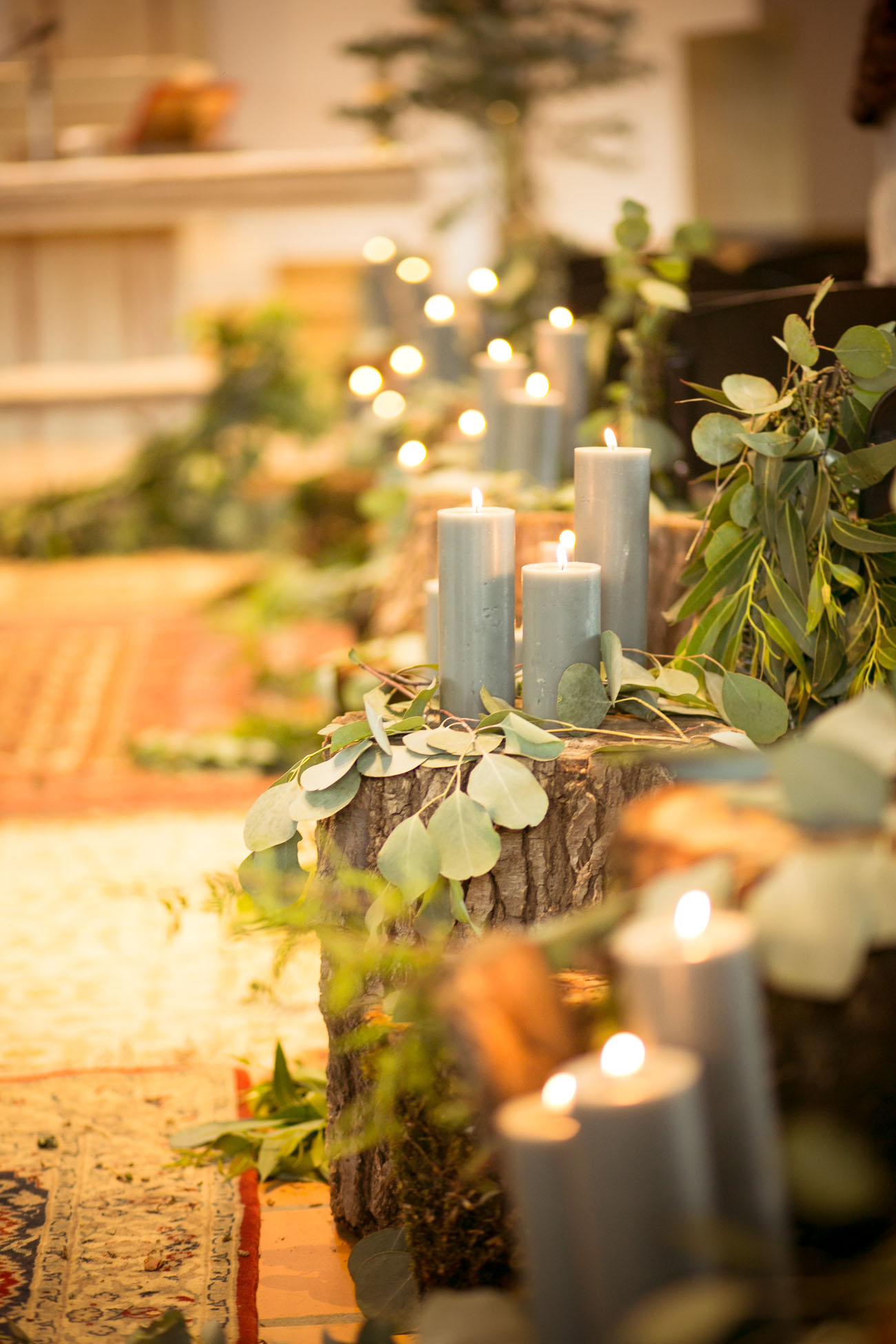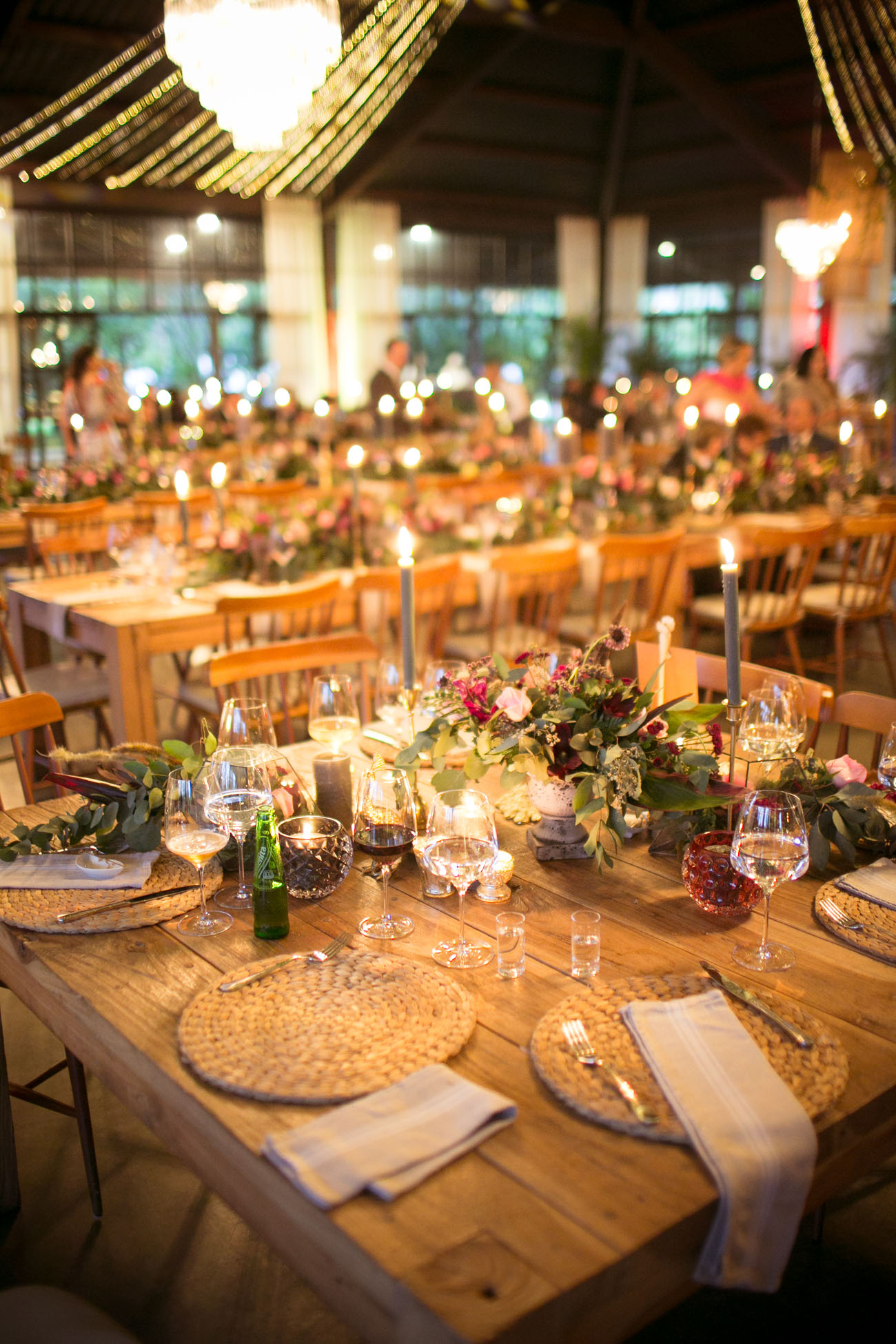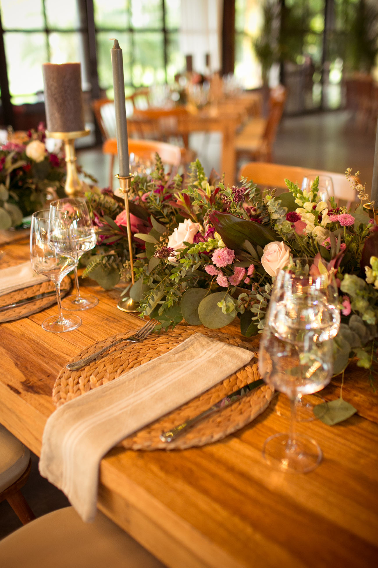 Su personalidad perfeccionista y su obsesión de arquitecta por los detalles, no le permitieron tener wedding planner. Tuvo wedding day -Isabel Estrada- para que la ayudara con la logística, pero fue ella quien se encargó de armar la celebración. Quiso un ambiente romántico, muy alusivo a otra época con toques bohemios. Quiso velas grises, individuales y lámparas en mimbre, candelabros y mucho verde en forma de eucaliptos. Quiso contrastar ese follaje con tonos palo de rosa y vinotintos. En la iglesia quiso muchos tapetes y troncos de madera y de nuevo, árboles de eucalipto que dieran la sensación de refugio, de calidez. Quiso que el ambiente en general se viera uniforme, desestructurado, que no todo fuera idéntico: en algunas mesas había copas de colores, en otras de cristal, algunas lisas, otras con texturas… Mientras Juliana ajustaba cada detalle, Alejandro se encargó de la música: Maritza, una artista que toca en Ambiente Living, fue la elegida para la comida y dj Jose Vargas el encargado de animar el resto de la noche, incluyendo la hora loca tropical.