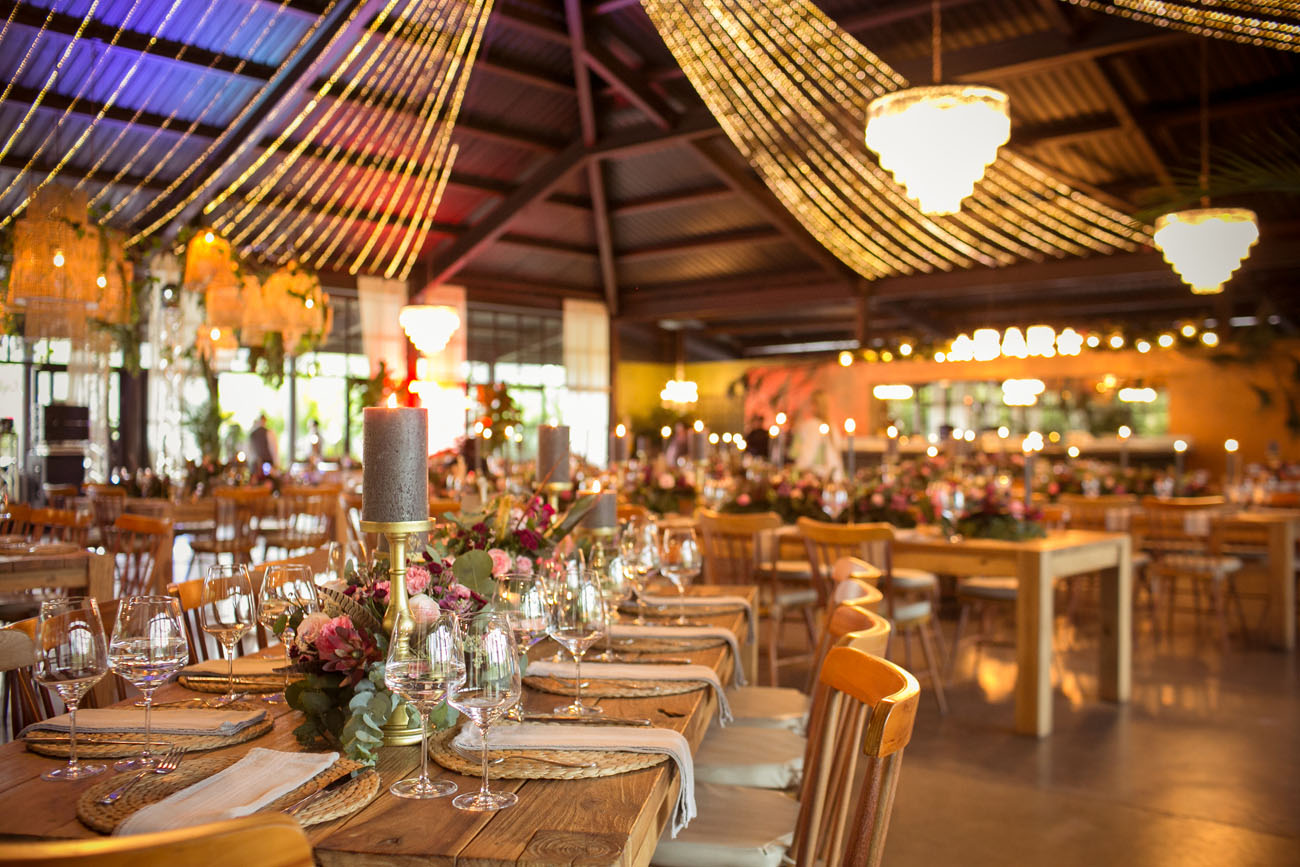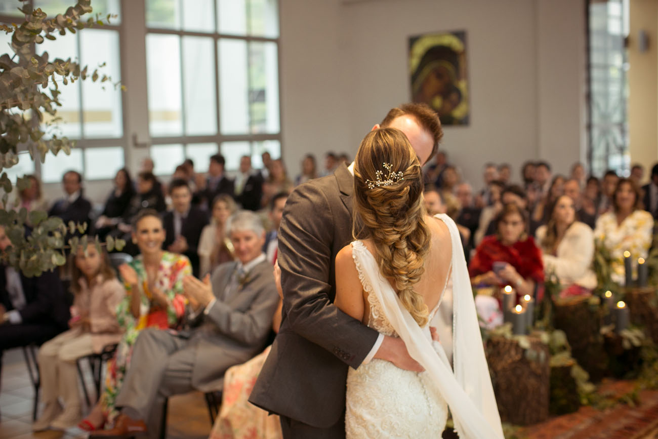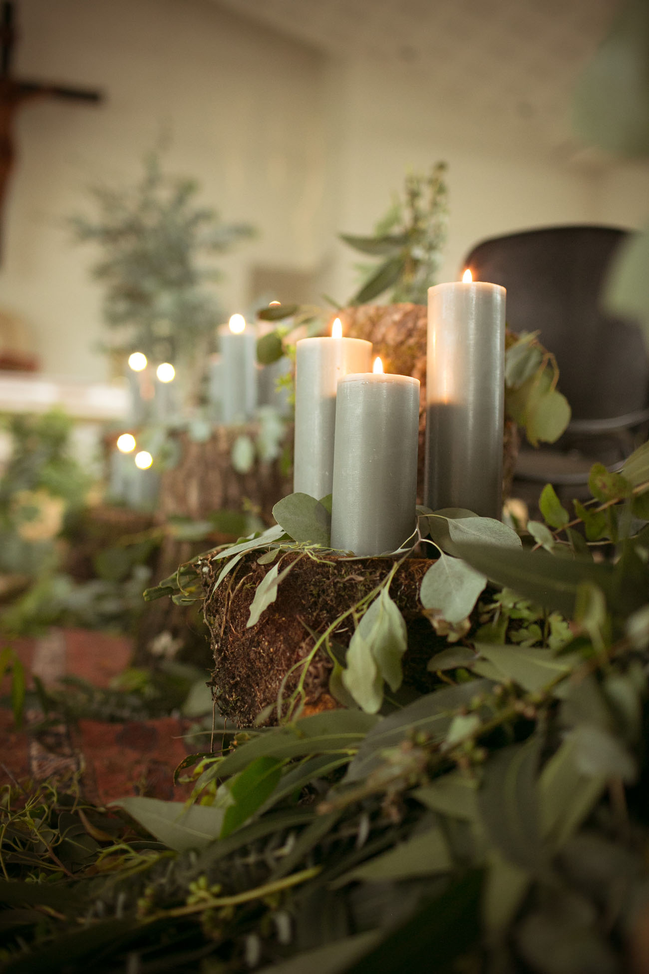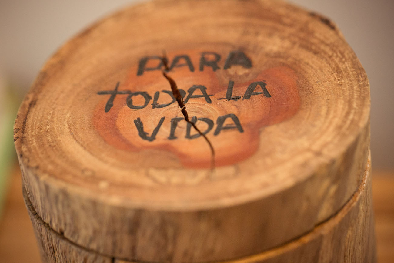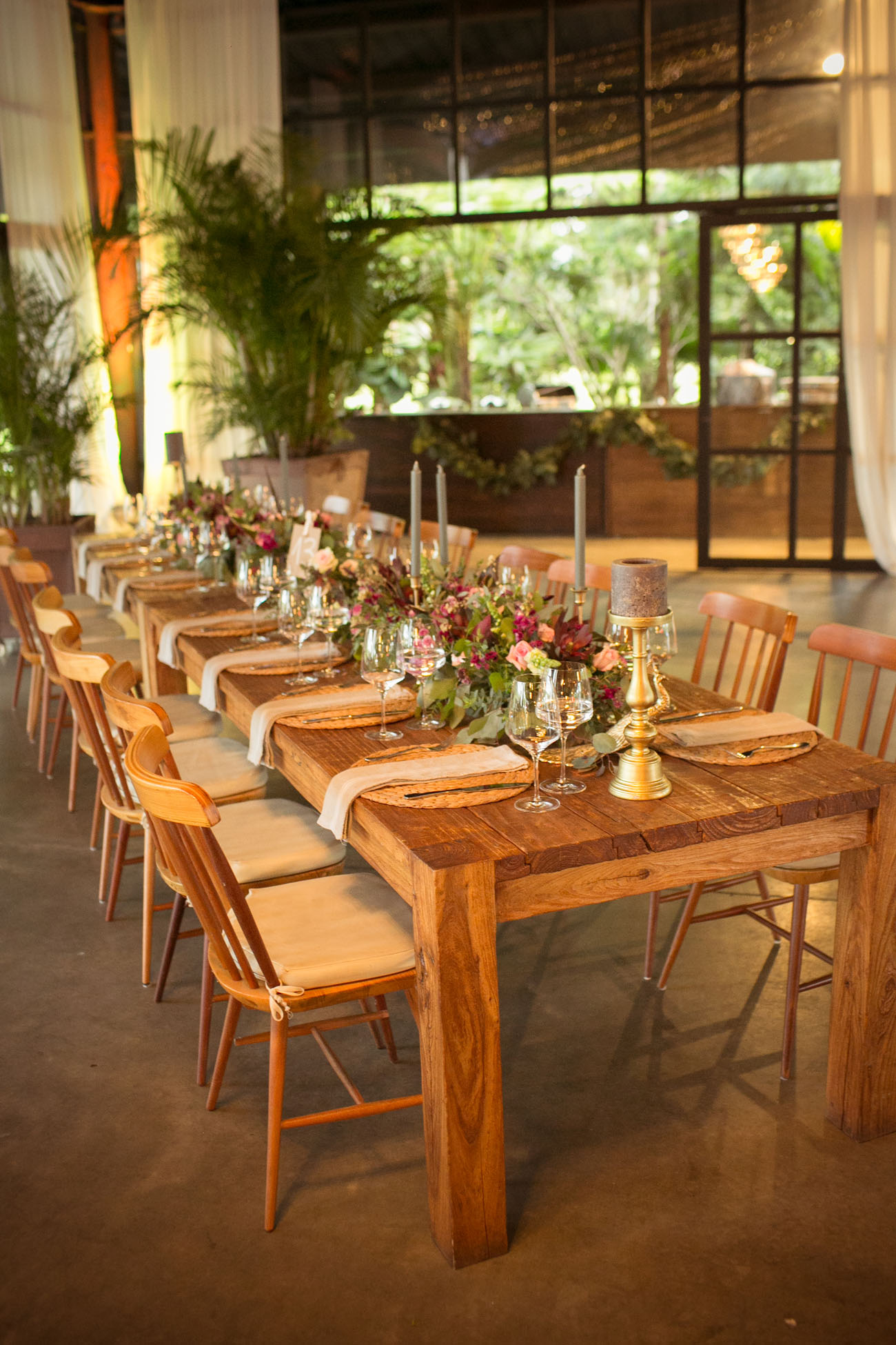 Su personalidad perfeccionista y su obsesión de arquitecta por los detalles, no le permitieron tener wedding planner. Tuvo wedding day -Isabel Estrada- para que la ayudara con la logística, pero fue ella quien se encargó de armar la celebración. Quiso un ambiente romántico, muy alusivo a otra época con toques bohemios. Quiso velas grises, individuales y lámparas en mimbre, candelabros y mucho verde en forma de eucaliptos. Quiso contrastar ese follaje con tonos palo de rosa y vinotintos. En la iglesia quiso muchos tapetes y troncos de madera y de nuevo, árboles de eucalipto que dieran la sensación de refugio, de calidez. Quiso que el ambiente en general se viera uniforme, desestructurado, que no todo fuera idéntico: en algunas mesas había copas de colores, en otras de cristal, algunas lisas, otras con texturas… Mientras Juliana ajustaba cada detalle, Alejandro se encargó de la música: Maritza, una artista que toca en Ambiente Living, fue la elegida para la comida y dj Jose Vargas el encargado de animar el resto de la noche, incluyendo la hora loca tropical.