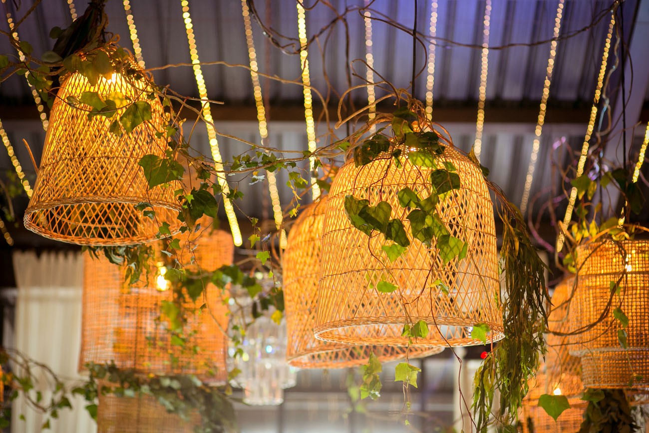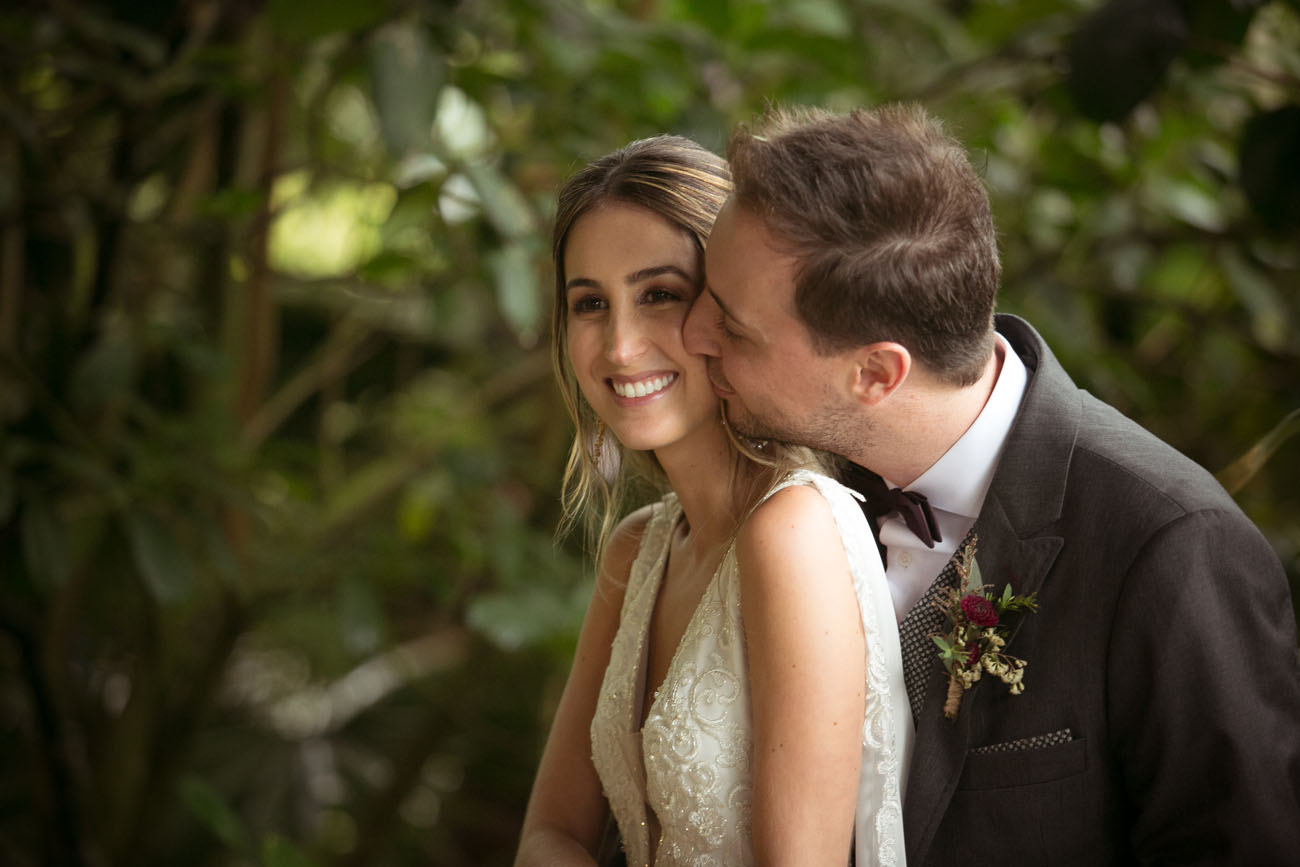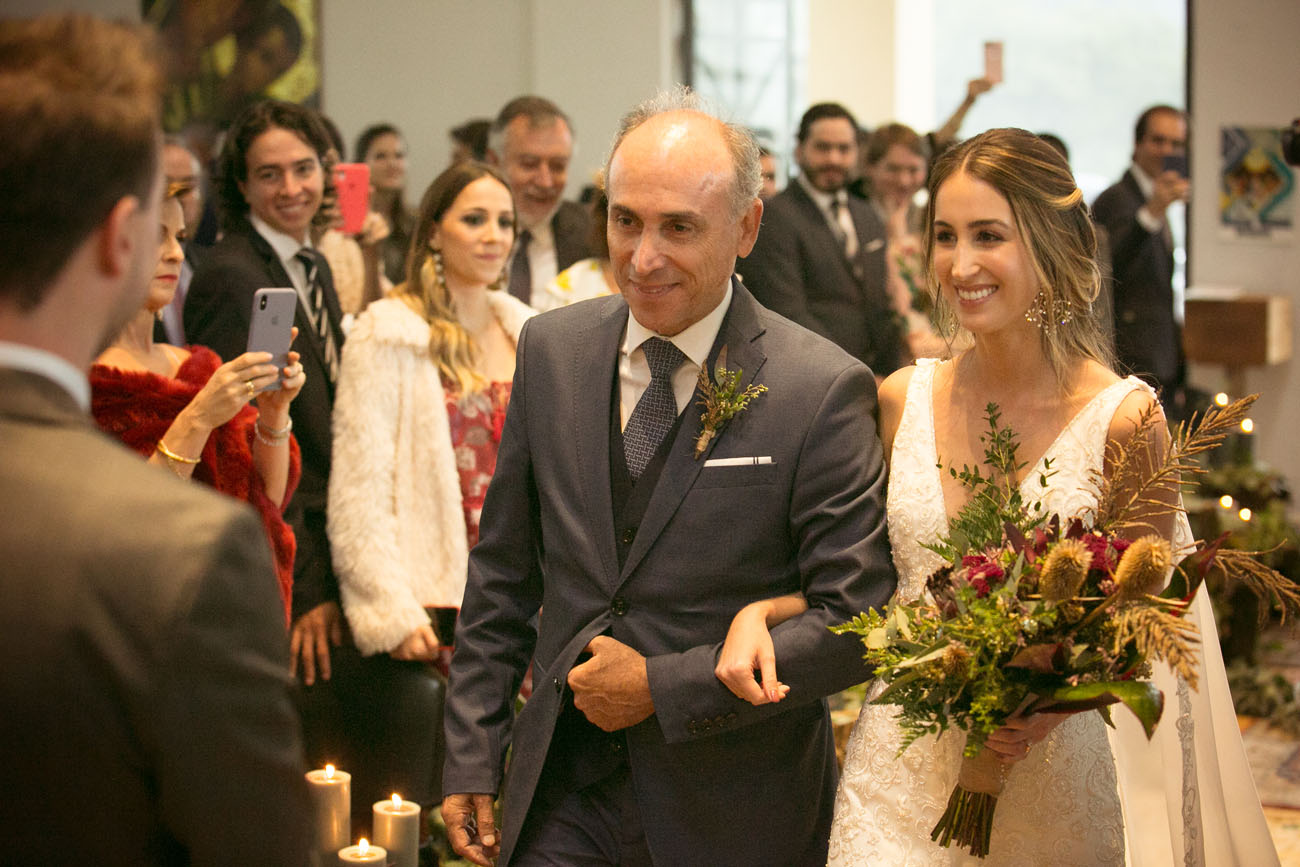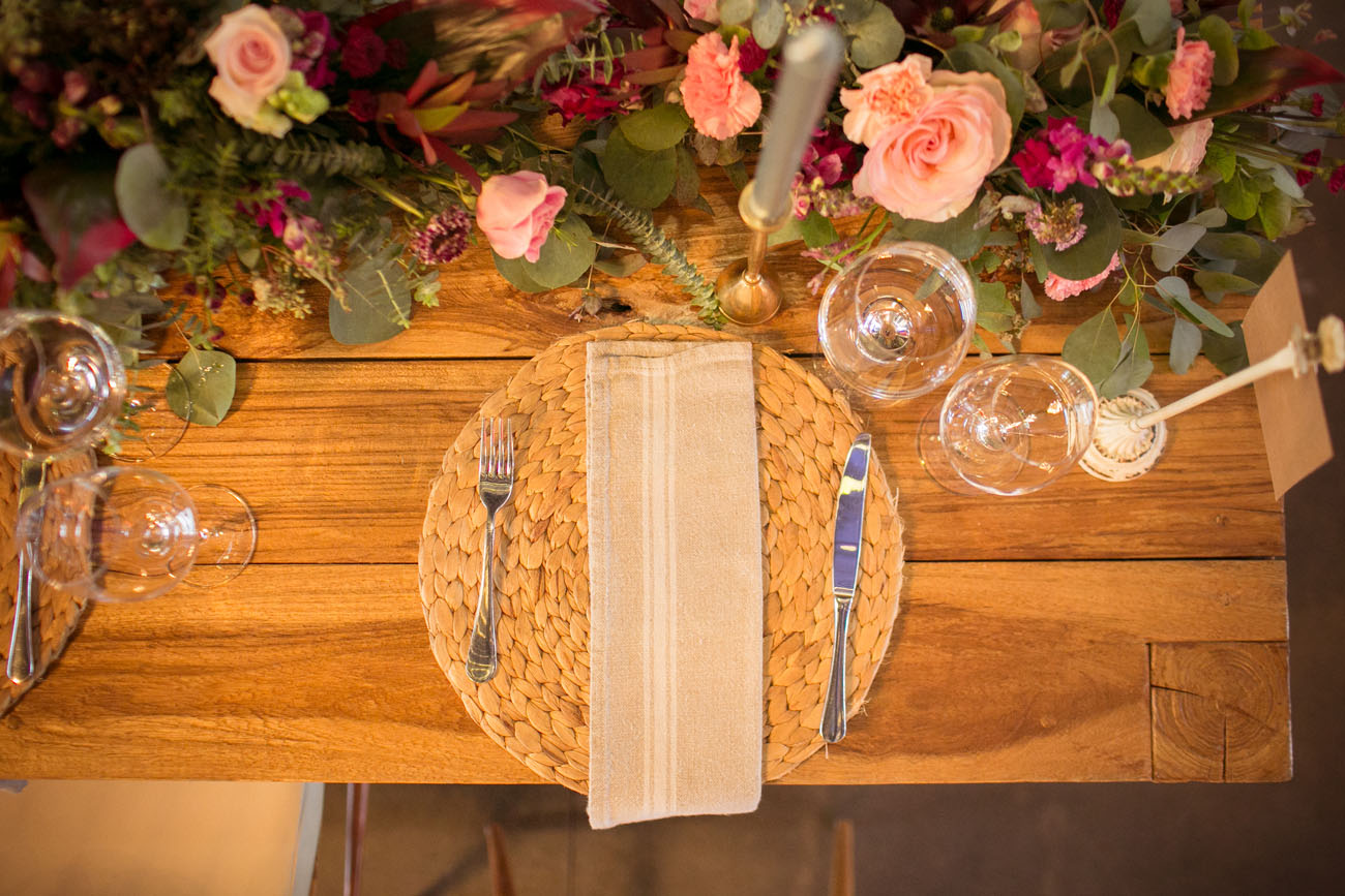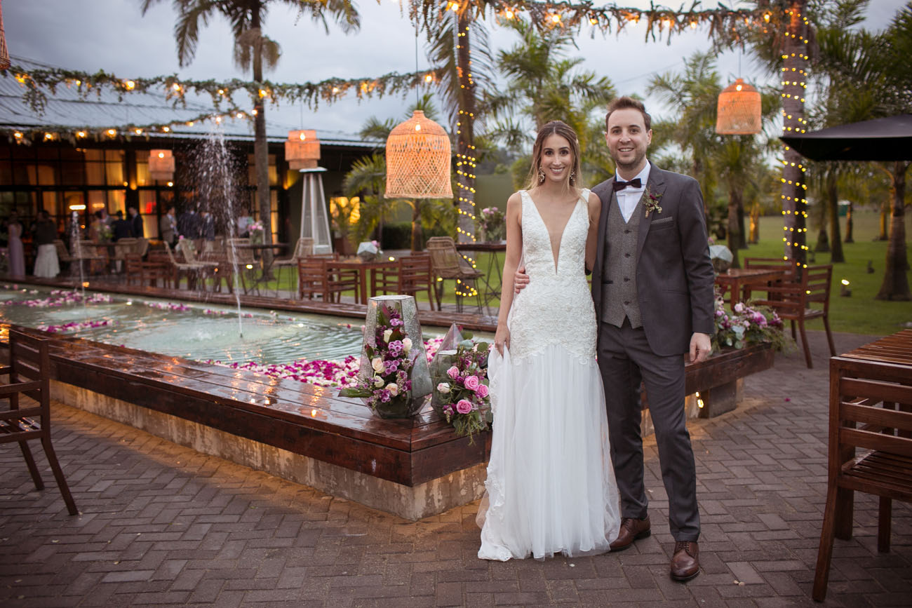 Su personalidad perfeccionista y su obsesión de arquitecta por los detalles, no le permitieron tener wedding planner. Tuvo wedding day -Isabel Estrada- para que la ayudara con la logística, pero fue ella quien se encargó de armar la celebración. Quiso un ambiente romántico, muy alusivo a otra época con toques bohemios. Quiso velas grises, individuales y lámparas en mimbre, candelabros y mucho verde en forma de eucaliptos. Quiso contrastar ese follaje con tonos palo de rosa y vinotintos. En la iglesia quiso muchos tapetes y troncos de madera y de nuevo, árboles de eucalipto que dieran la sensación de refugio, de calidez. Quiso que el ambiente en general se viera uniforme, desestructurado, que no todo fuera idéntico: en algunas mesas había copas de colores, en otras de cristal, algunas lisas, otras con texturas… Mientras Juliana ajustaba cada detalle, Alejandro se encargó de la música: Maritza, una artista que toca en Ambiente Living, fue la elegida para la comida y dj Jose Vargas el encargado de animar el resto de la noche, incluyendo la hora loca tropical.