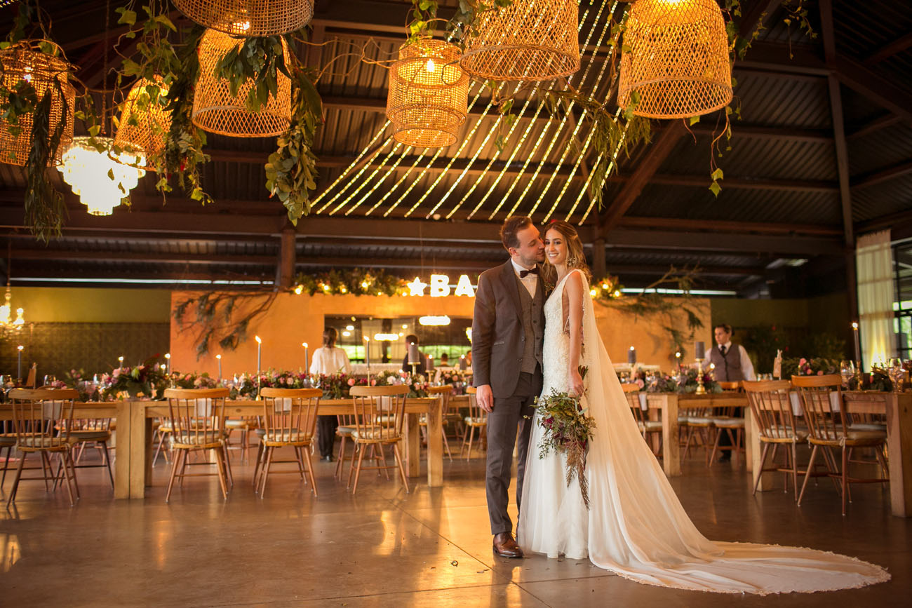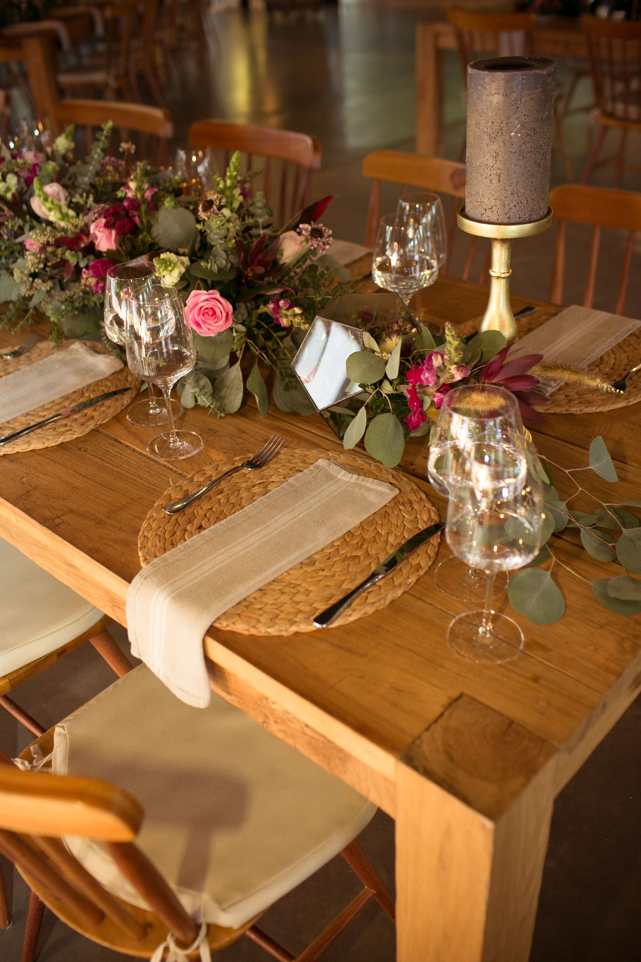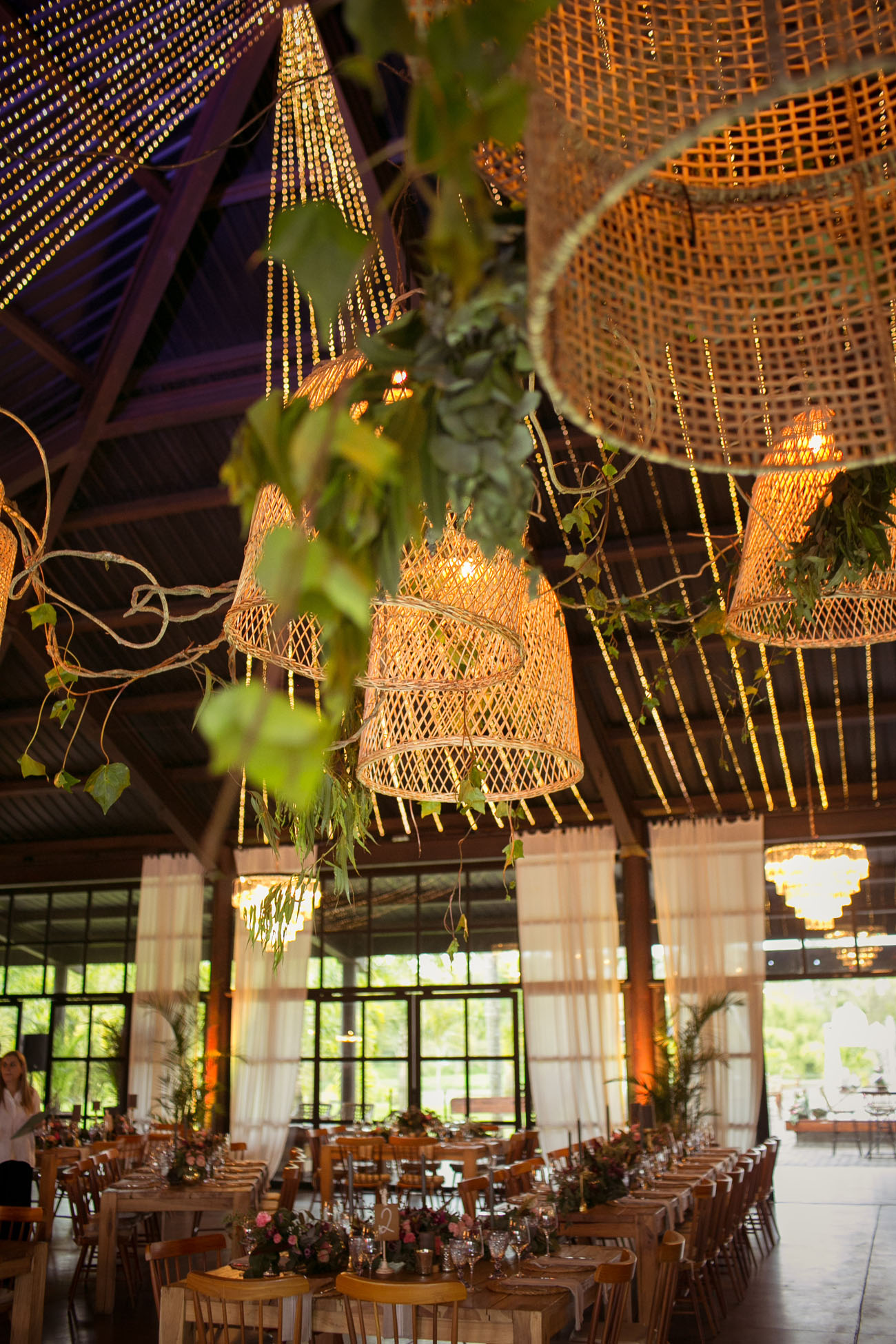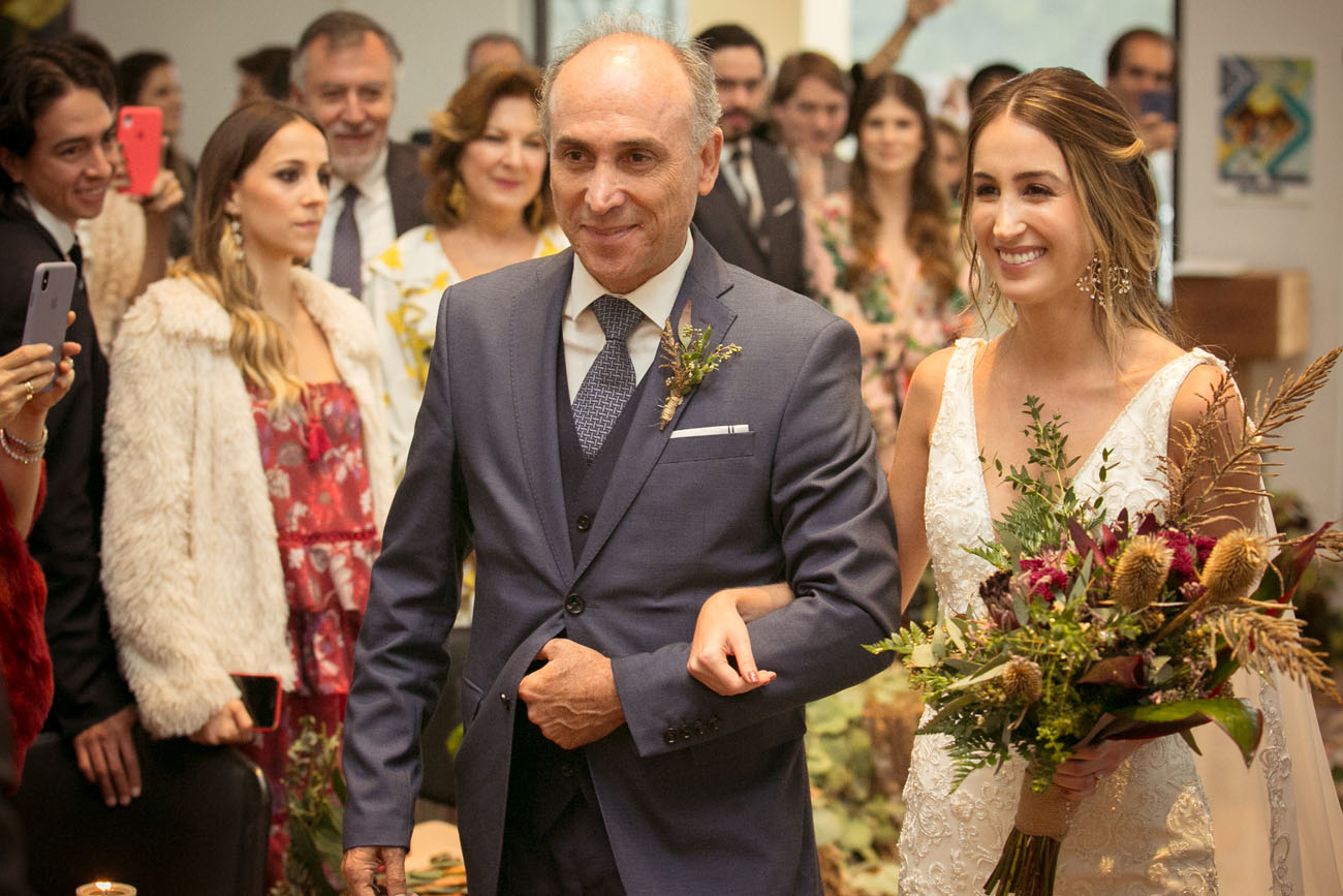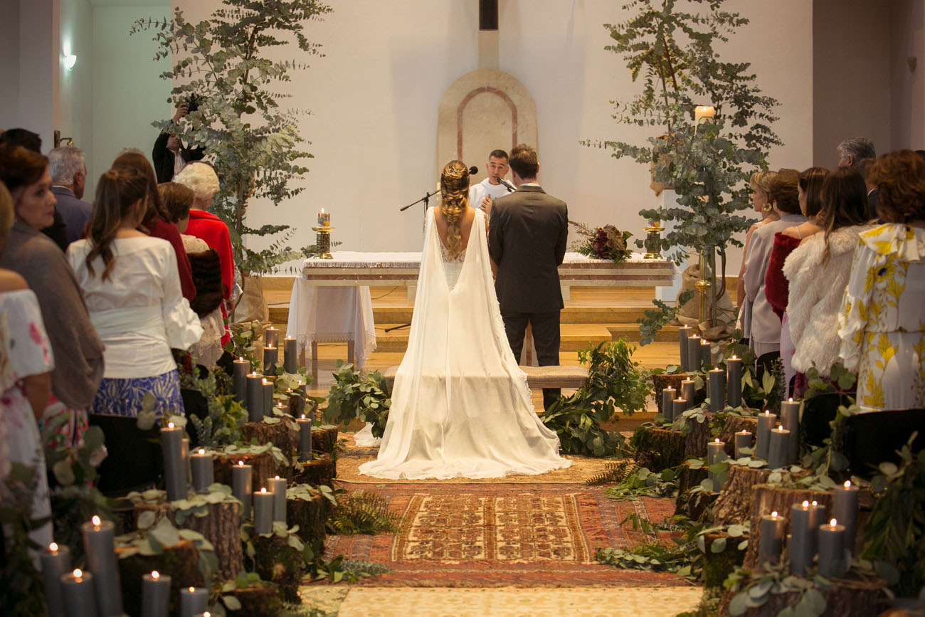 Su personalidad perfeccionista y su obsesión de arquitecta por los detalles, no le permitieron tener wedding planner. Tuvo wedding day -Isabel Estrada- para que la ayudara con la logística, pero fue ella quien se encargó de armar la celebración. Quiso un ambiente romántico, muy alusivo a otra época con toques bohemios. Quiso velas grises, individuales y lámparas en mimbre, candelabros y mucho verde en forma de eucaliptos. Quiso contrastar ese follaje con tonos palo de rosa y vinotintos. En la iglesia quiso muchos tapetes y troncos de madera y de nuevo, árboles de eucalipto que dieran la sensación de refugio, de calidez. Quiso que el ambiente en general se viera uniforme, desestructurado, que no todo fuera idéntico: en algunas mesas había copas de colores, en otras de cristal, algunas lisas, otras con texturas… Mientras Juliana ajustaba cada detalle, Alejandro se encargó de la música: Maritza, una artista que toca en Ambiente Living, fue la elegida para la comida y dj Jose Vargas el encargado de animar el resto de la noche, incluyendo la hora loca tropical.
