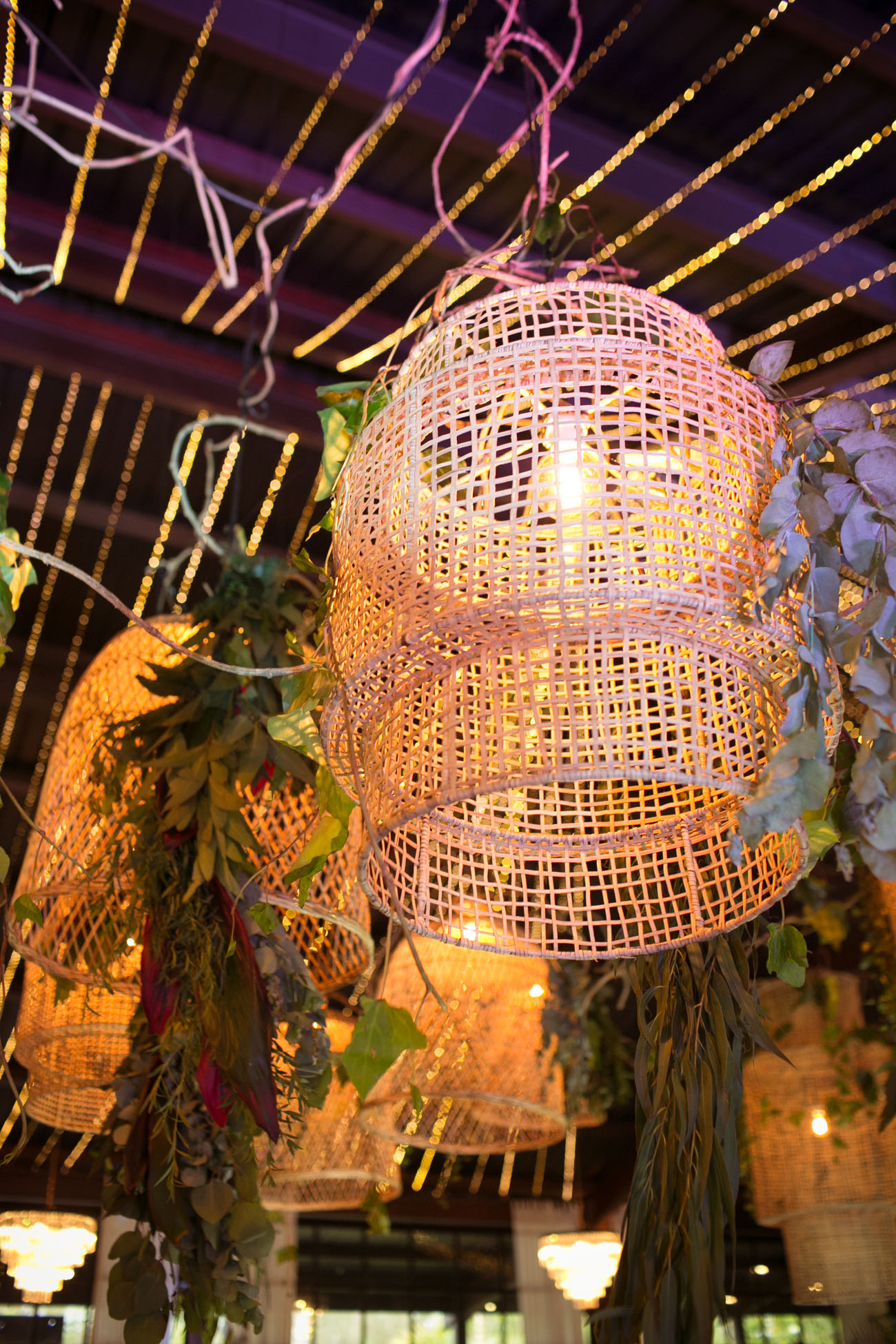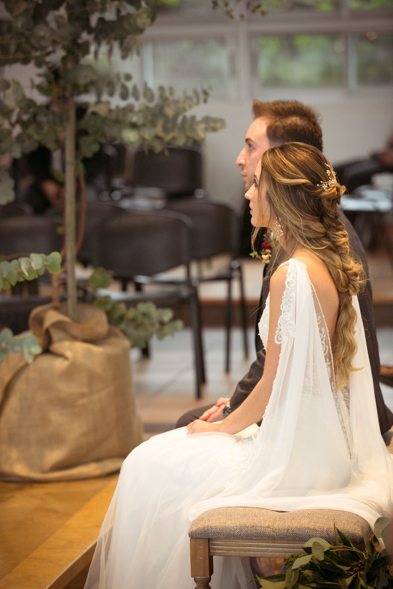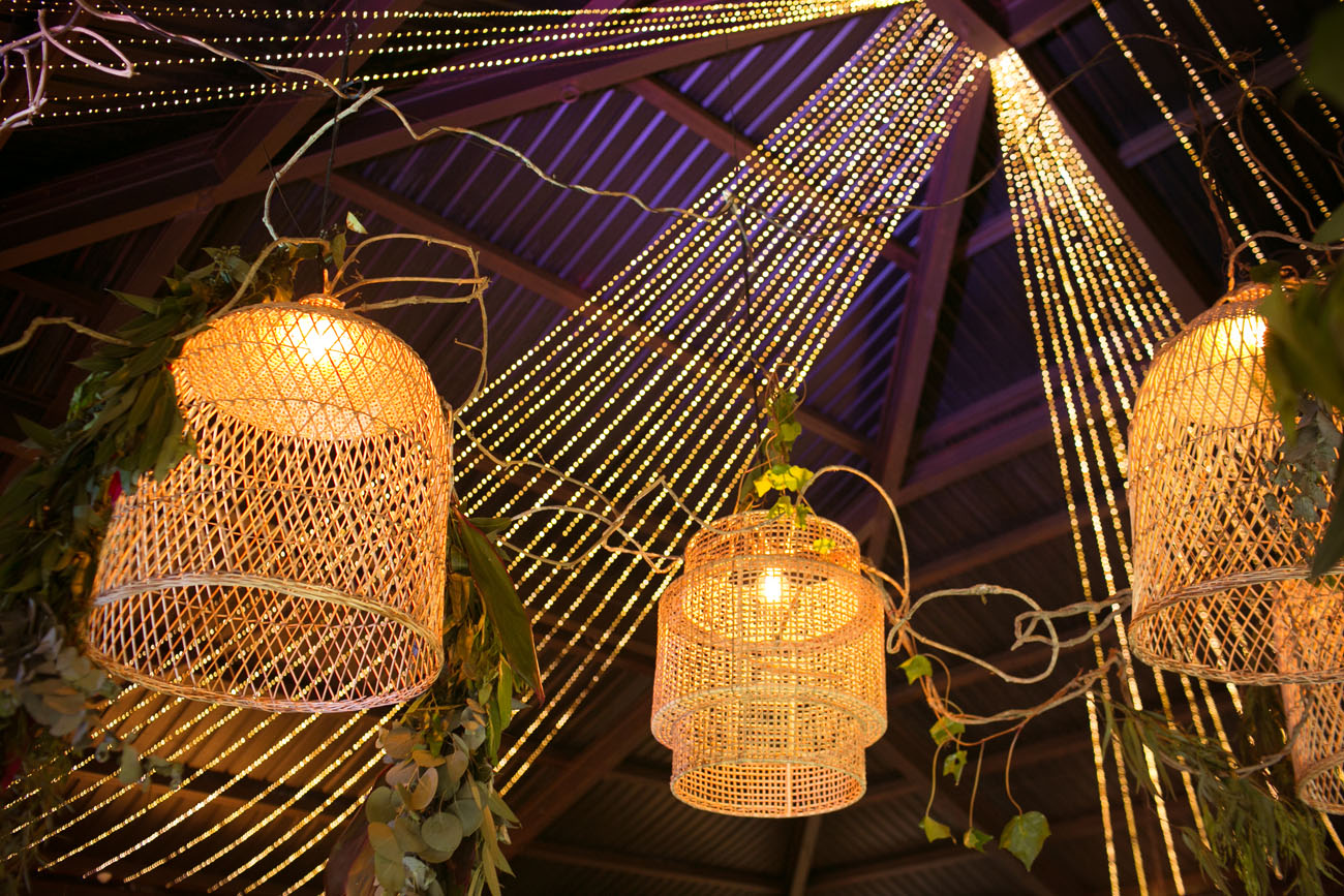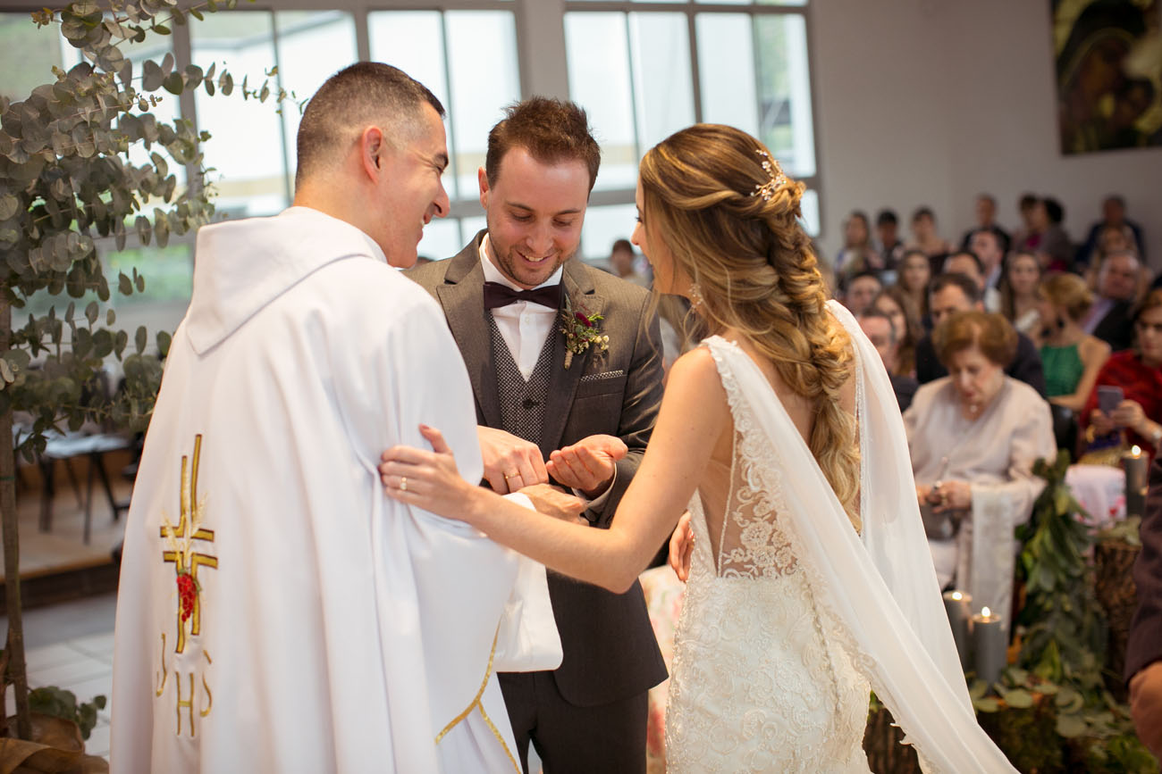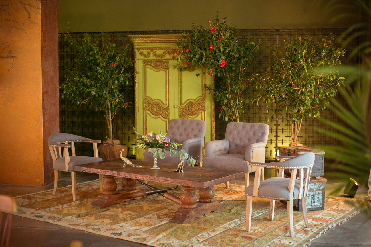 Su personalidad perfeccionista y su obsesión de arquitecta por los detalles, no le permitieron tener wedding planner. Tuvo wedding day -Isabel Estrada- para que la ayudara con la logística, pero fue ella quien se encargó de armar la celebración. Quiso un ambiente romántico, muy alusivo a otra época con toques bohemios. Quiso velas grises, individuales y lámparas en mimbre, candelabros y mucho verde en forma de eucaliptos. Quiso contrastar ese follaje con tonos palo de rosa y vinotintos. En la iglesia quiso muchos tapetes y troncos de madera y de nuevo, árboles de eucalipto que dieran la sensación de refugio, de calidez. Quiso que el ambiente en general se viera uniforme, desestructurado, que no todo fuera idéntico: en algunas mesas había copas de colores, en otras de cristal, algunas lisas, otras con texturas… Mientras Juliana ajustaba cada detalle, Alejandro se encargó de la música: Maritza, una artista que toca en Ambiente Living, fue la elegida para la comida y dj Jose Vargas el encargado de animar el resto de la noche, incluyendo la hora loca tropical.
