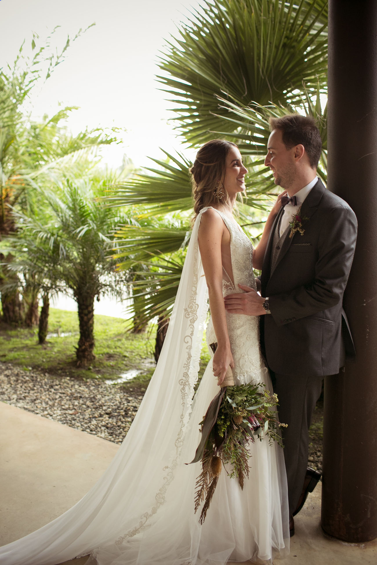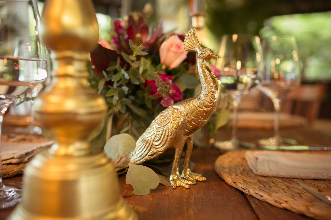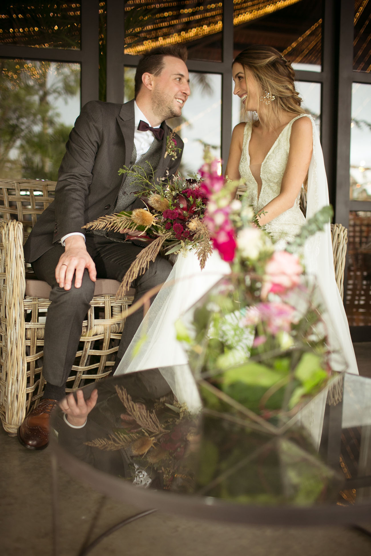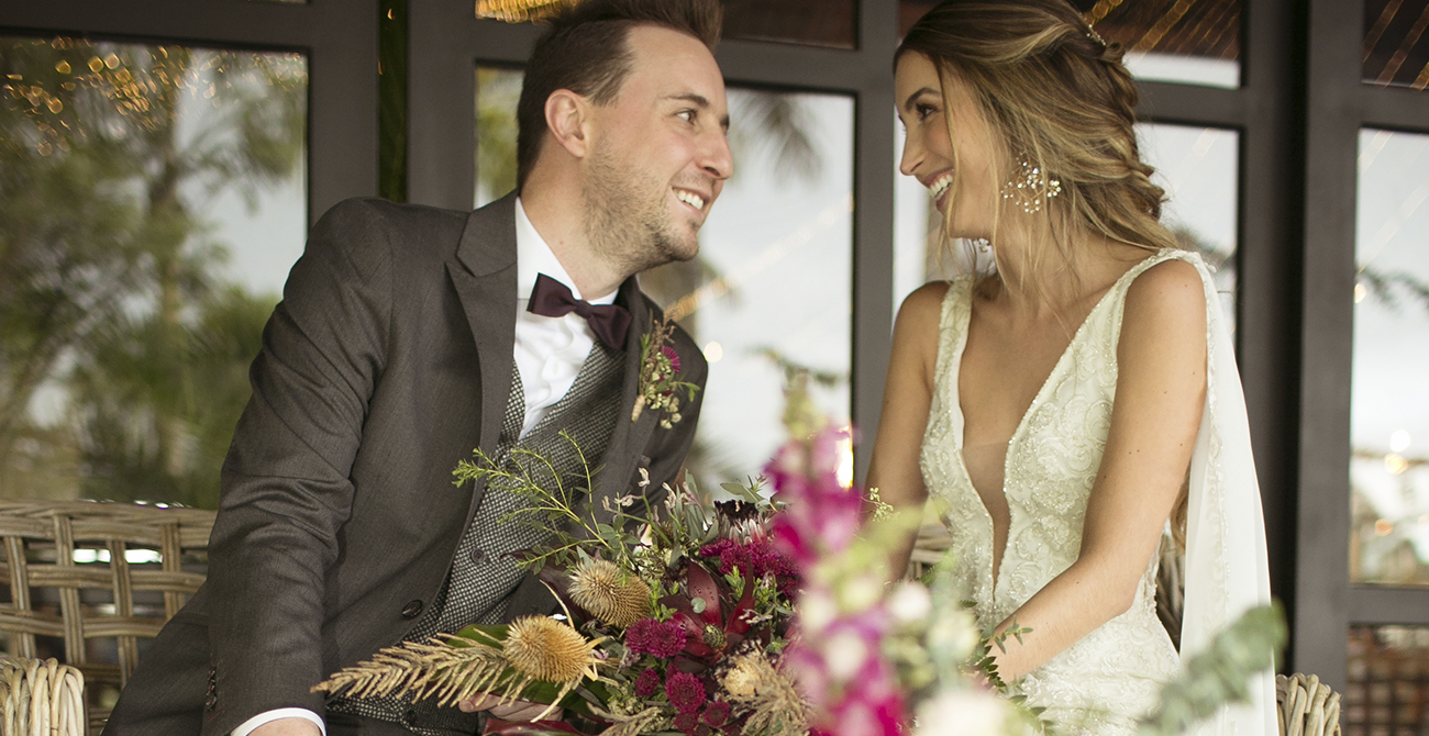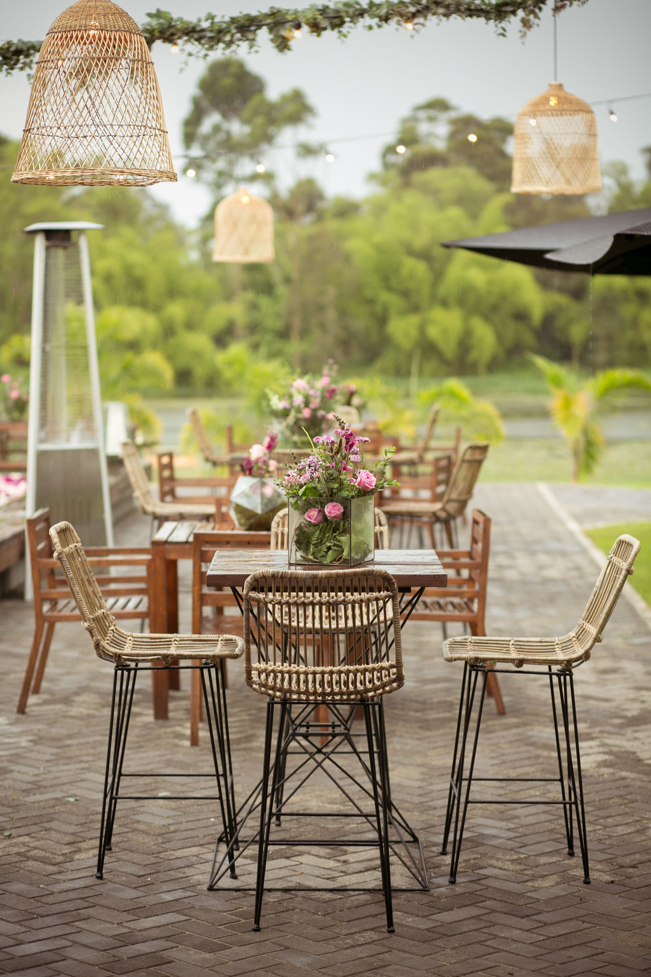 Su personalidad perfeccionista y su obsesión de arquitecta por los detalles, no le permitieron tener wedding planner. Tuvo wedding day -Isabel Estrada- para que la ayudara con la logística, pero fue ella quien se encargó de armar la celebración. Quiso un ambiente romántico, muy alusivo a otra época con toques bohemios. Quiso velas grises, individuales y lámparas en mimbre, candelabros y mucho verde en forma de eucaliptos. Quiso contrastar ese follaje con tonos palo de rosa y vinotintos. En la iglesia quiso muchos tapetes y troncos de madera y de nuevo, árboles de eucalipto que dieran la sensación de refugio, de calidez. Quiso que el ambiente en general se viera uniforme, desestructurado, que no todo fuera idéntico: en algunas mesas había copas de colores, en otras de cristal, algunas lisas, otras con texturas… Mientras Juliana ajustaba cada detalle, Alejandro se encargó de la música: Maritza, una artista que toca en Ambiente Living, fue la elegida para la comida y dj Jose Vargas el encargado de animar el resto de la noche, incluyendo la hora loca tropical.