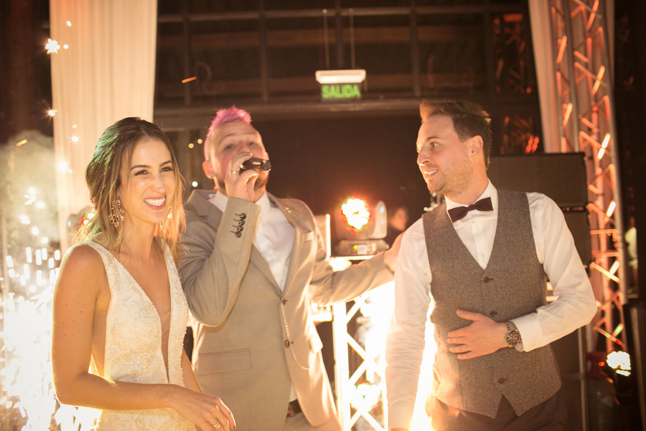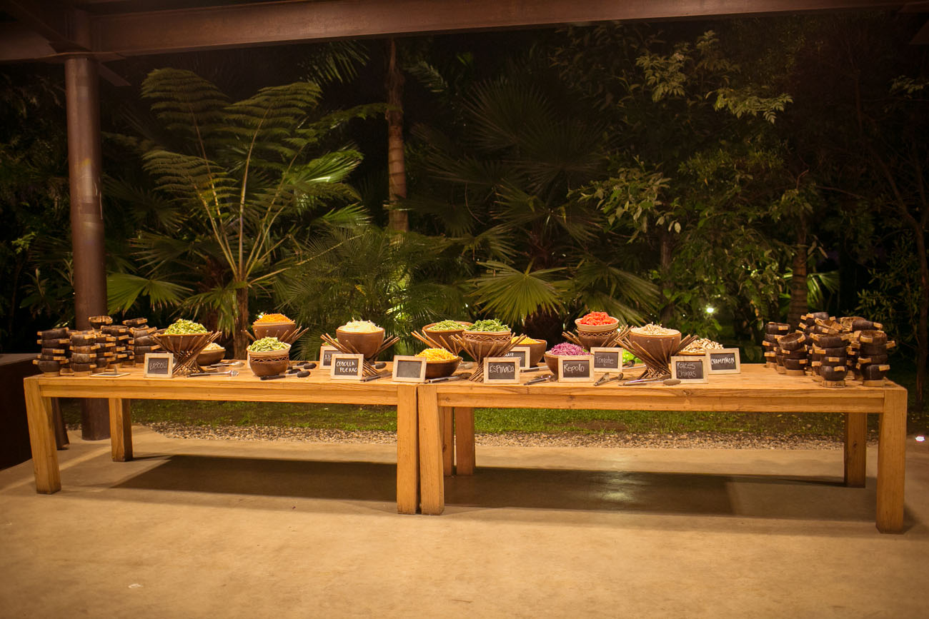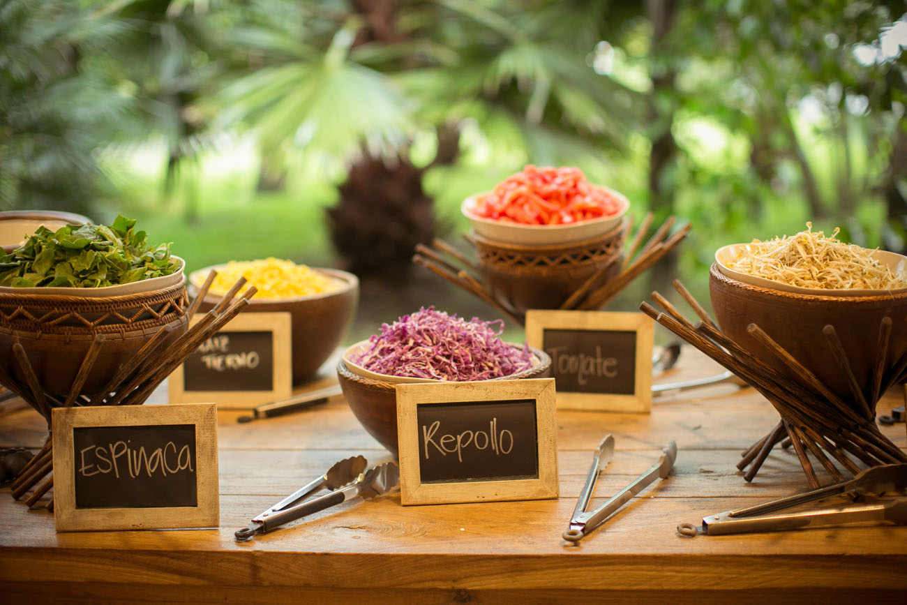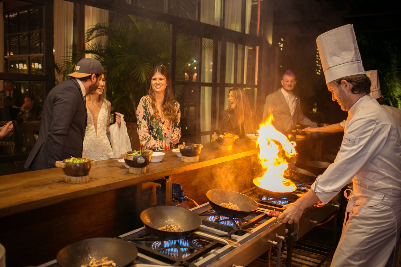 No querían protocolos. No querían un matrimonio por etapas impuestas. El orden común dictando el ánimo de la noche. En cambio, querían libertad, frescura, fluidez. La solución fue que la comida fuera un show, una elección propia: barra amplia de ingredientes para armar un wok al gusto de cada persona y después el chef lo preparaba en vivo. Mientras los invitados hacían fila, les dieron un pocillo con una crema caliente. Otra vez, el frío combinó a la perfección. El catering de Santamonica se supo lucir tal como Juliana y Alejandro imaginaron.