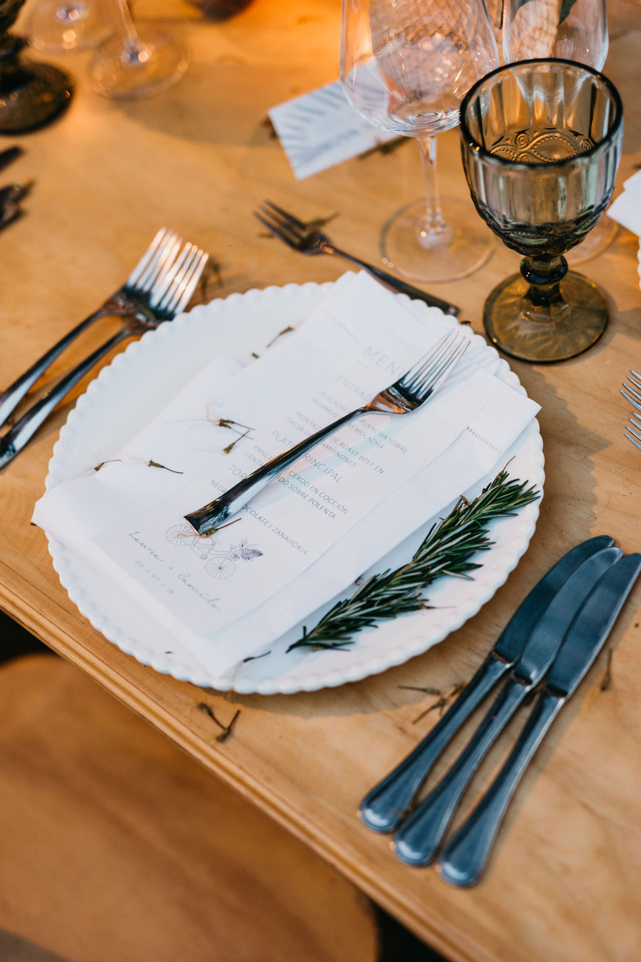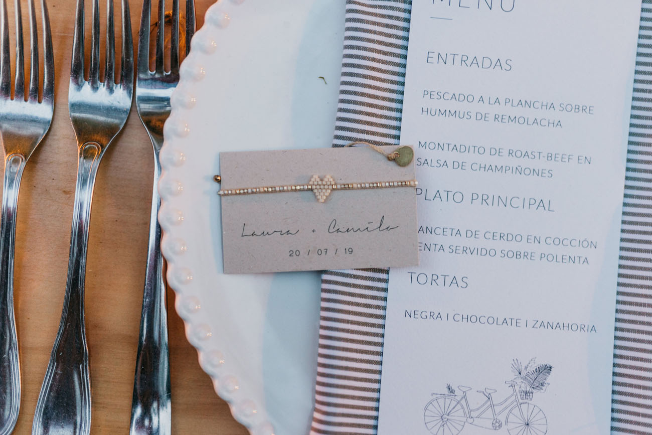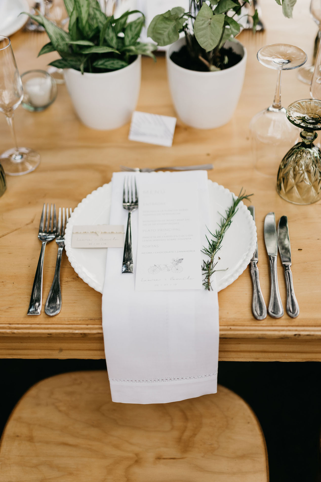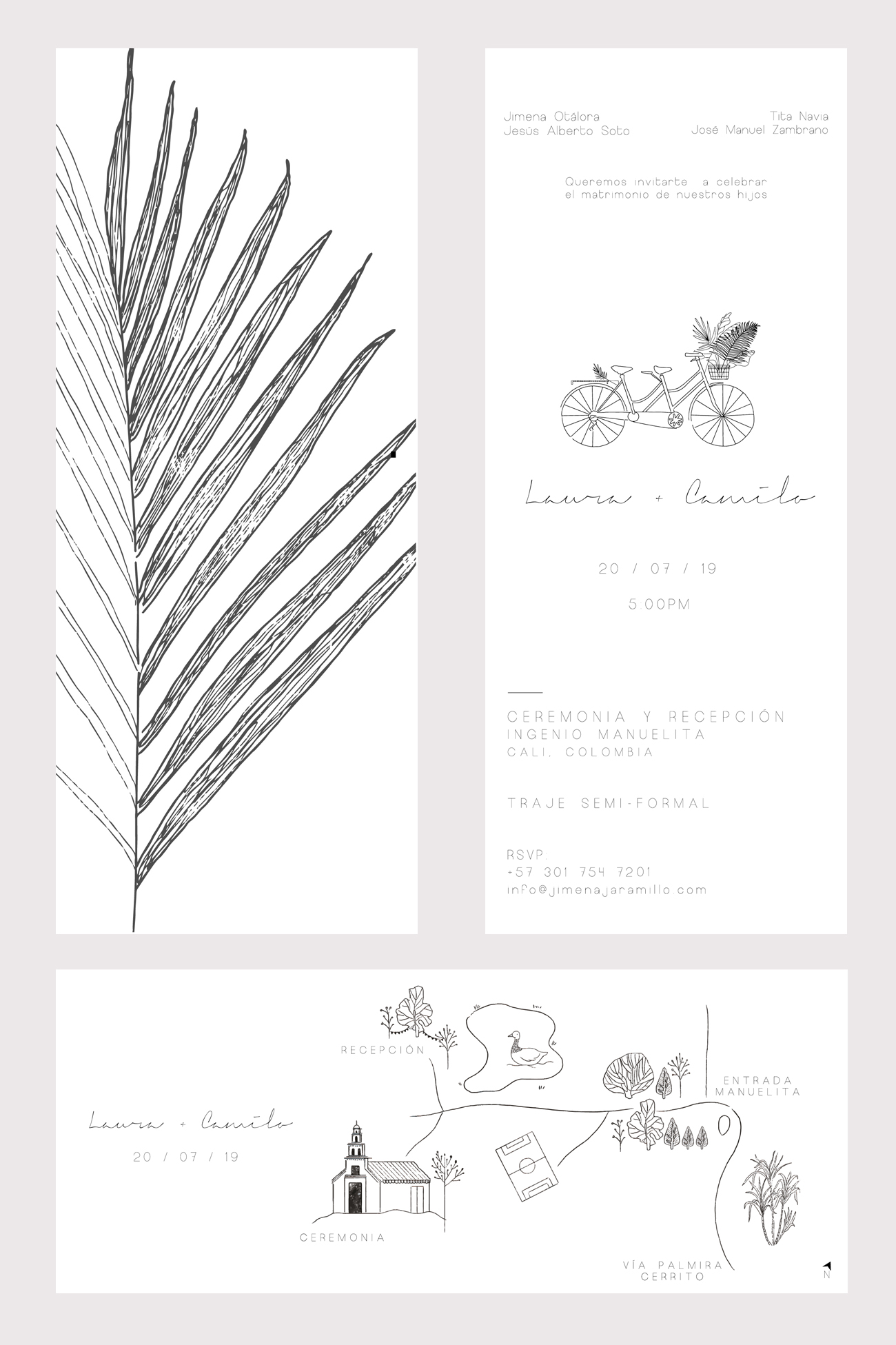 Su amiga y colega, que también es ilustradora, se las diseñó. Han trabajado juntas en varias ocasiones y Laura admira la capacidad que tiene Amalia para interpretar sus ideas y gustos. Quería unas invitaciones muy minimalistas, en blanco y negro y que simularan estar escritas a mano. Todo en líneas muy finas. Una bicicleta (tan él) de dos sillas con una canasta con hojas (tan ella). Esa ilustración, que fue lo más representativo, no significaba otra cosa que la combinación de ellos dos, que ese nuevo sendero, esos kilómetros de vida que ya han recorrido y esos otros que están por venir. Finalmente, en ese sobre en papel kraft reciclado y marcado a mano, también incluyeron un mapa ilustrado con las indicaciones generales.