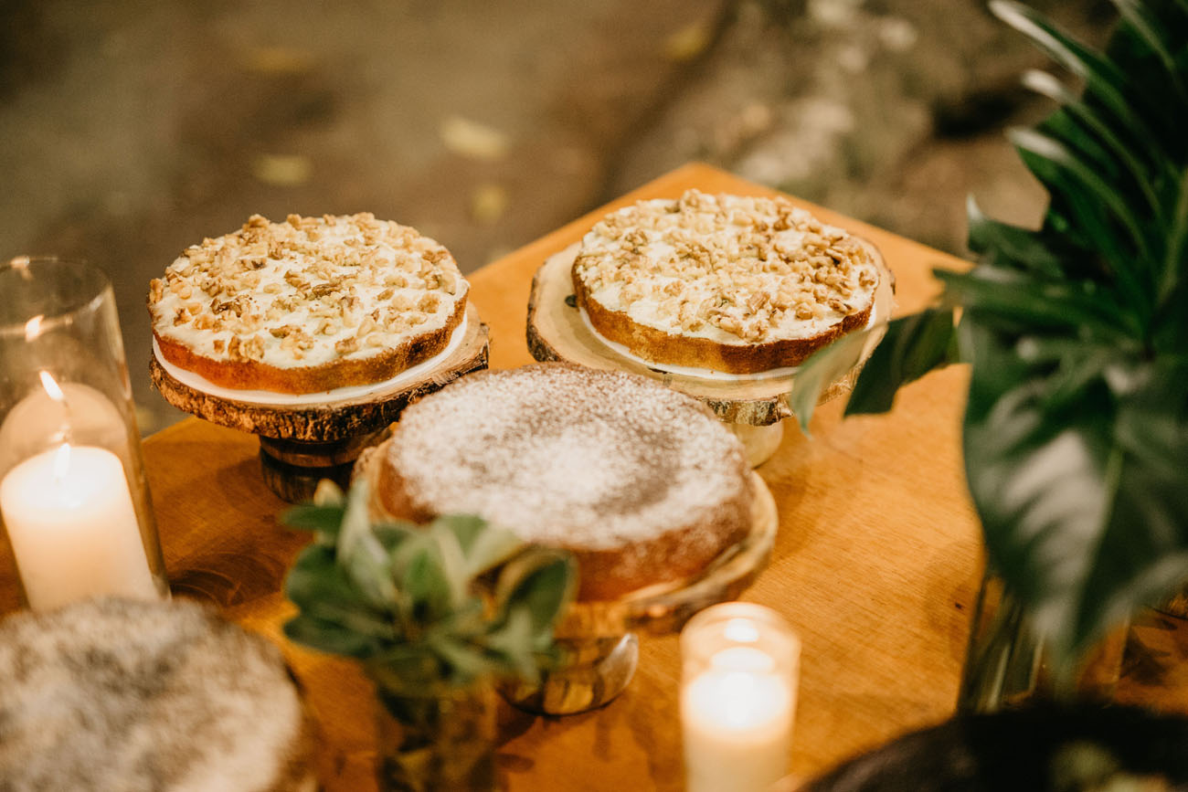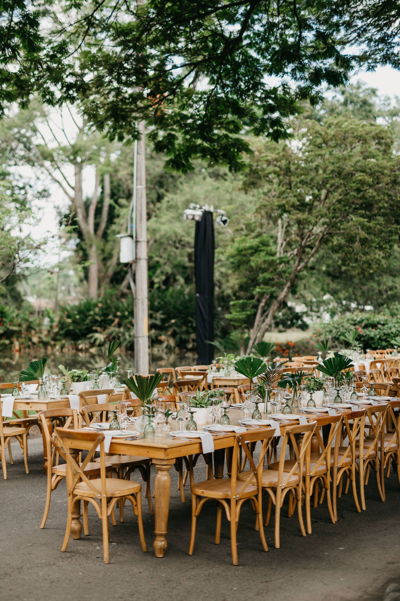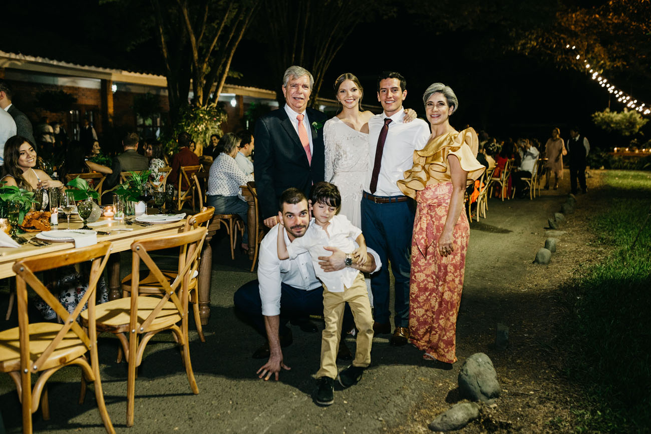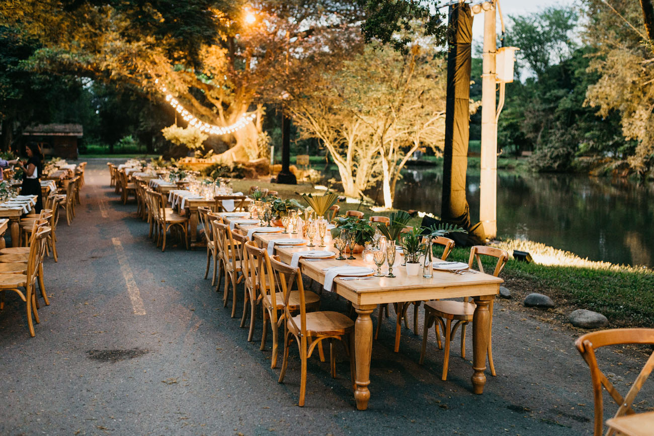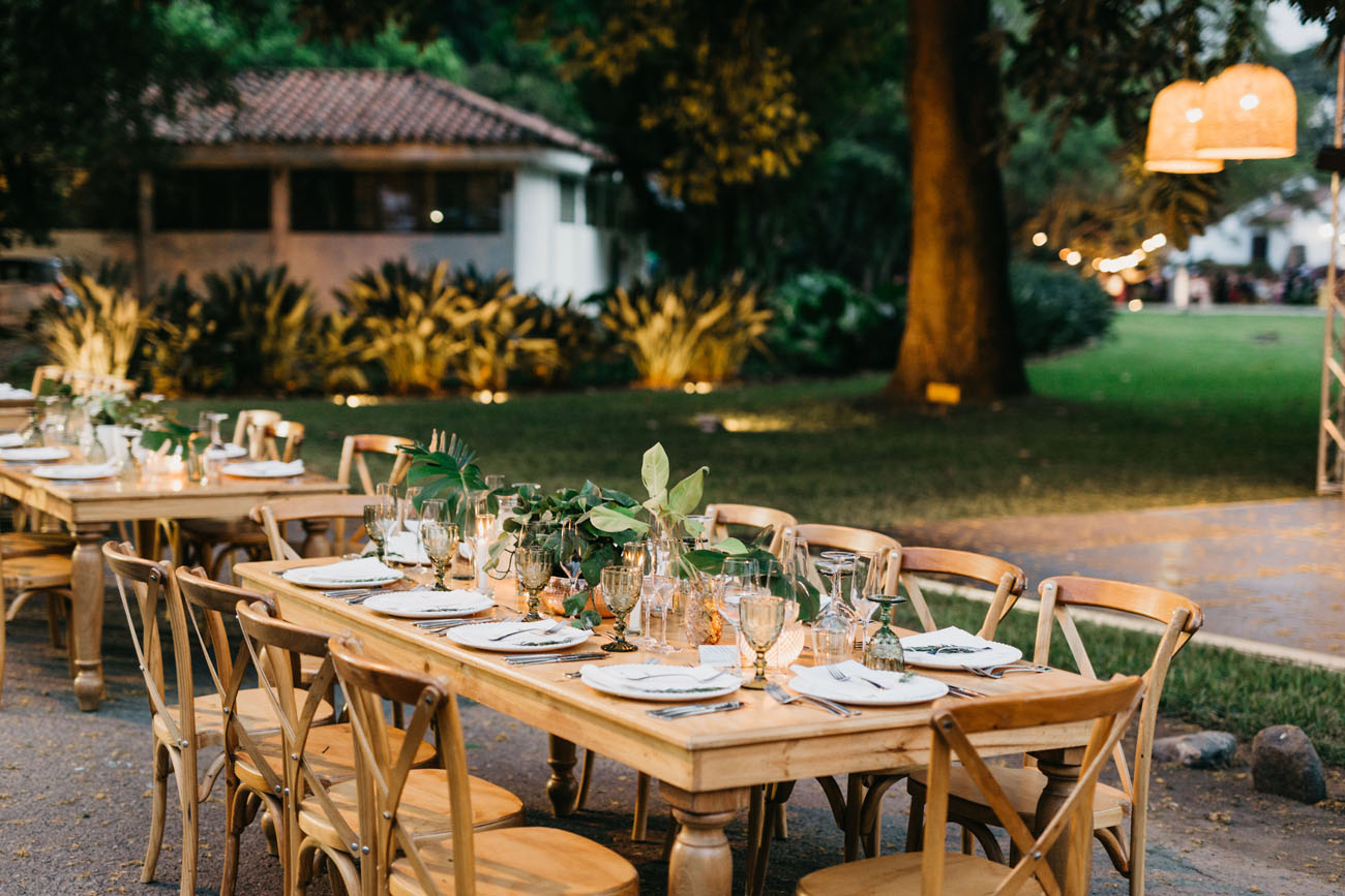 Ese matrimonio que soñaban, tan nuestro, simple, minimalista, descomplicado, elegante, rústico, fue el espejo del que tuvieron. Mesas en madera, sillas de estilo industrial, bombillos, lámparas artesanales, follaje verde y miel, ni una sola flor, excepto la del yugo de Laura. Se aprovecharon del contraste propio del piso en piedra, de las tonalidades naturales y dejaron que el color lo pusieran las personas, porque de todos los temas las personas también fueron prioridad, porque los dos tienen familias grandes y unidas, porque comparten los amigos desde el colegio, porque estar en compañía de tantos que no ven muy a menudo y, también, de esos que ven con frecuencia, era la razón de esa fiesta en medio de lo que parecía un bosque, una feria íntima, un festín de otra época, un pueblito macondiano.