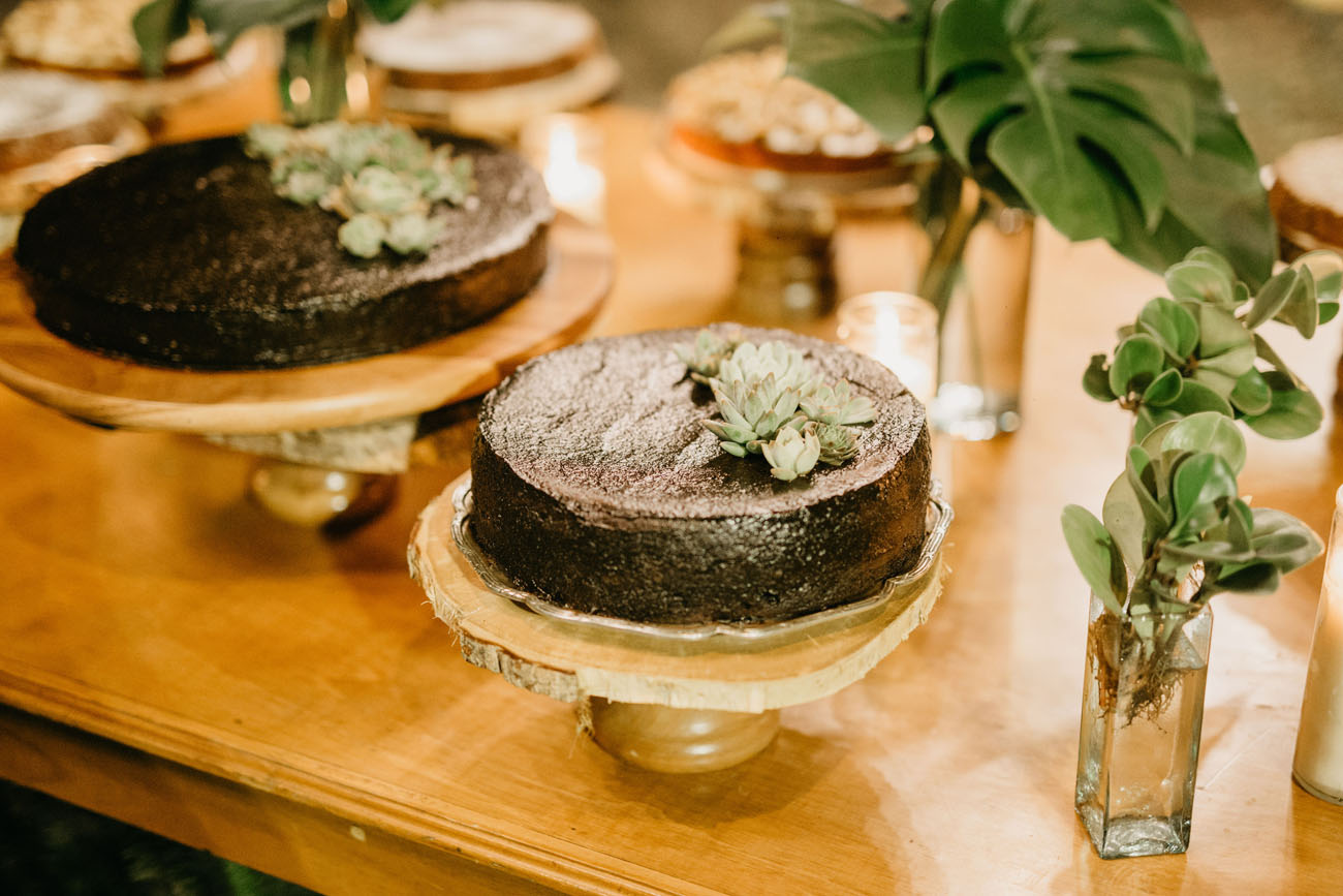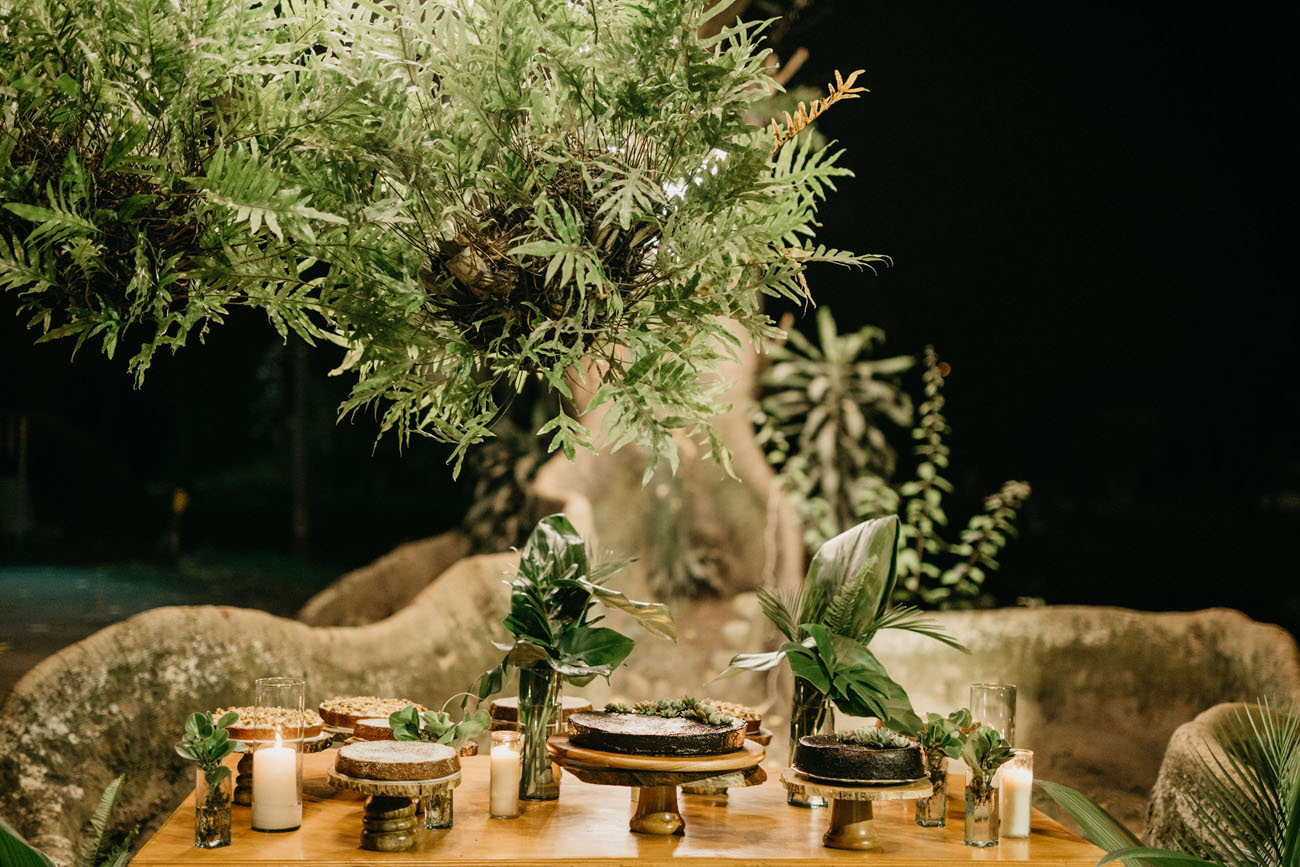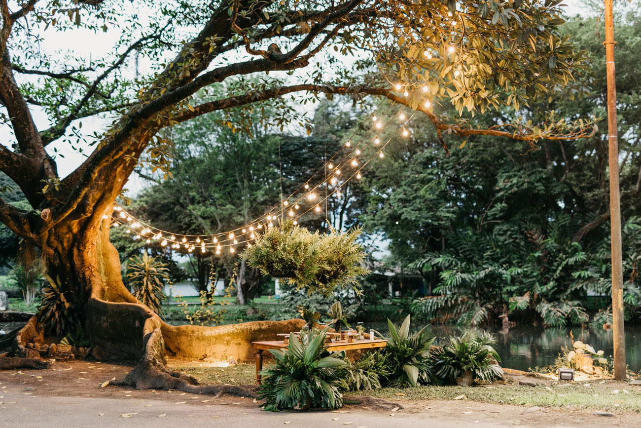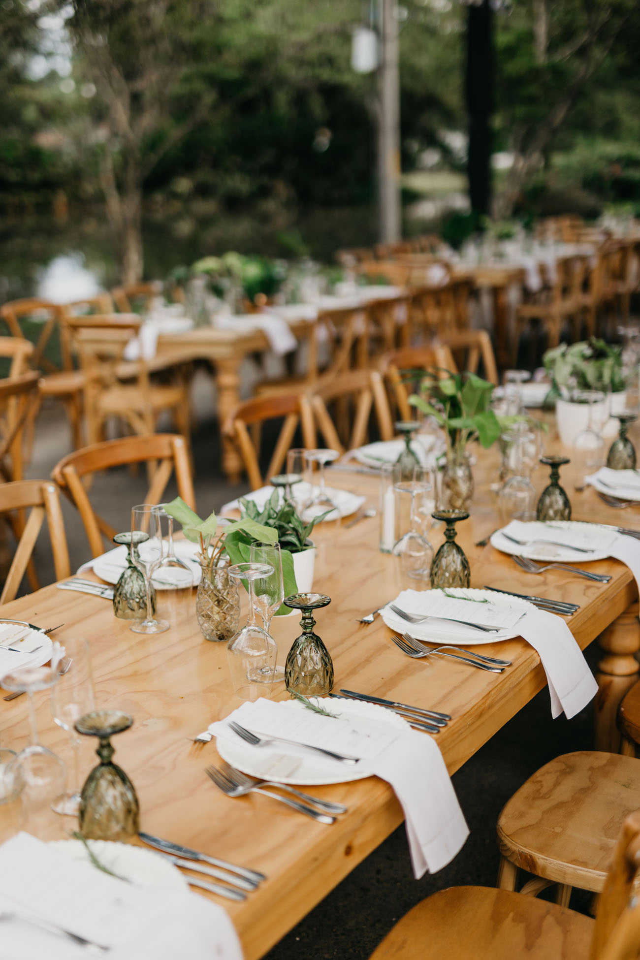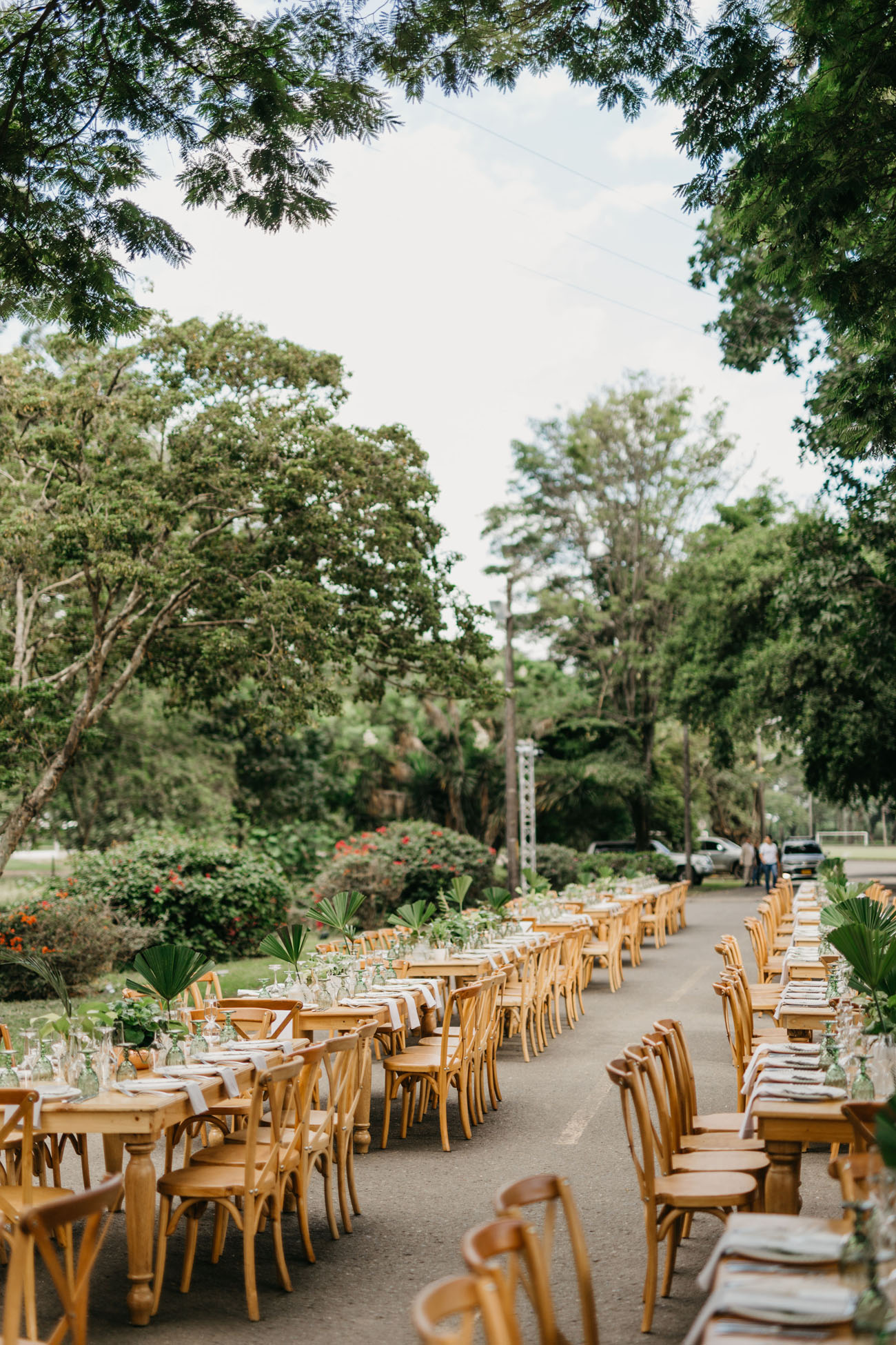 Ese matrimonio que soñaban, tan nuestro, simple, minimalista, descomplicado, elegante, rústico, fue el espejo del que tuvieron. Mesas en madera, sillas de estilo industrial, bombillos, lámparas artesanales, follaje verde y miel, ni una sola flor, excepto la del yugo de Laura. Se aprovecharon del contraste propio del piso en piedra, de las tonalidades naturales y dejaron que el color lo pusieran las personas, porque de todos los temas las personas también fueron prioridad, porque los dos tienen familias grandes y unidas, porque comparten los amigos desde el colegio, porque estar en compañía de tantos que no ven muy a menudo y, también, de esos que ven con frecuencia, era la razón de esa fiesta en medio de lo que parecía un bosque, una feria íntima, un festín de otra época, un pueblito macondiano.