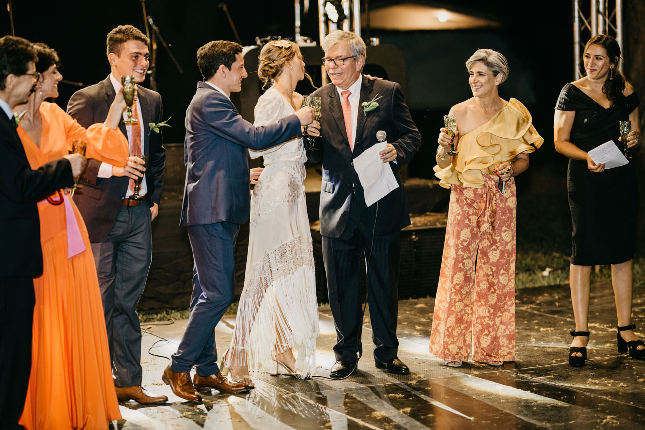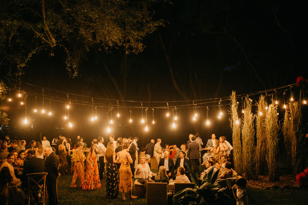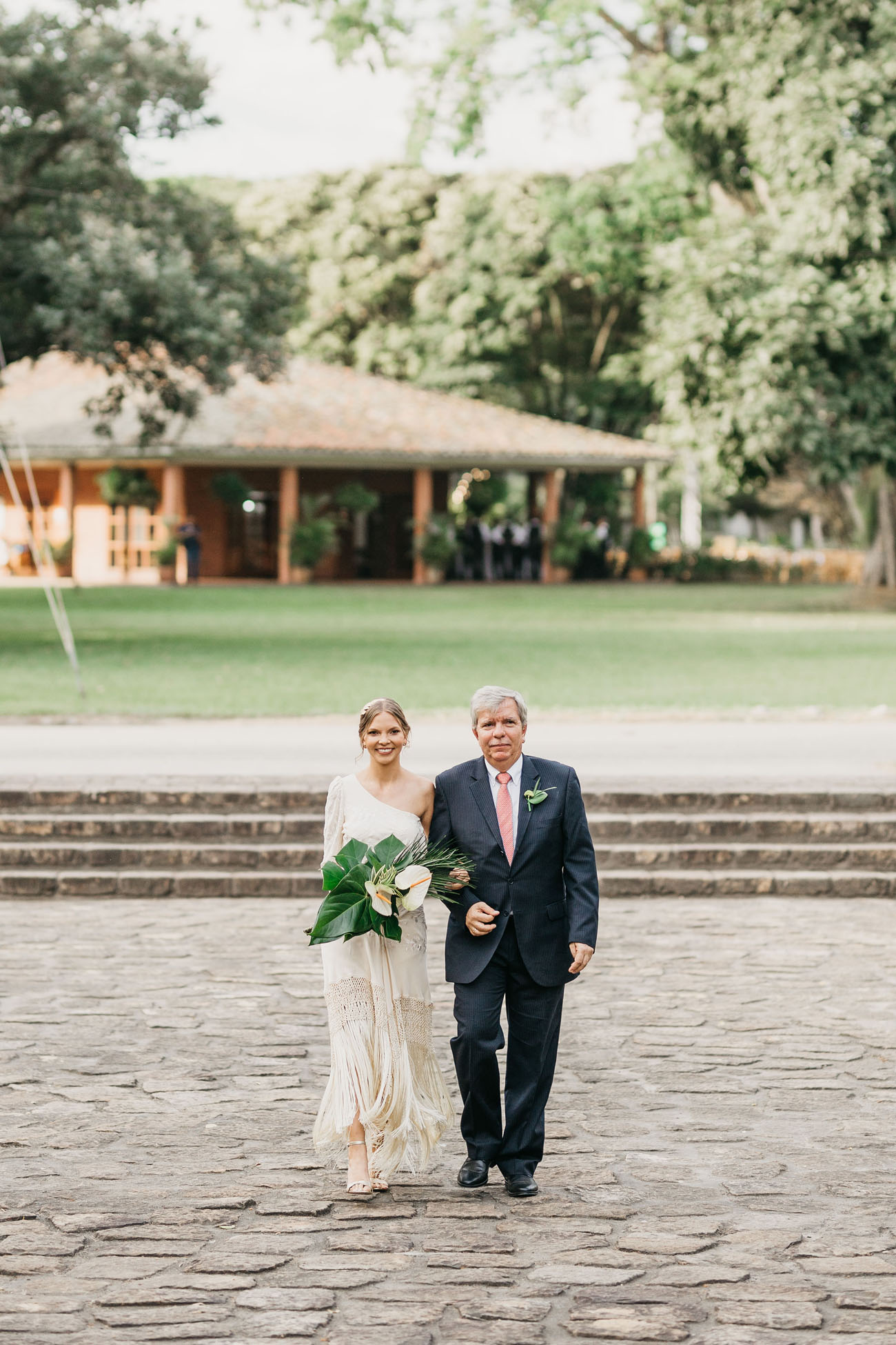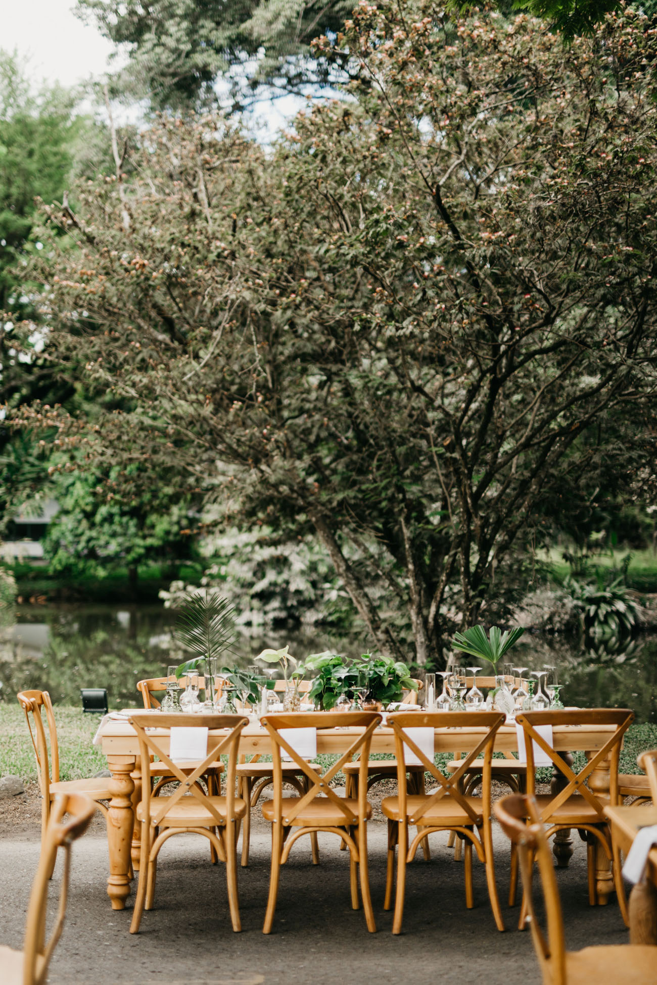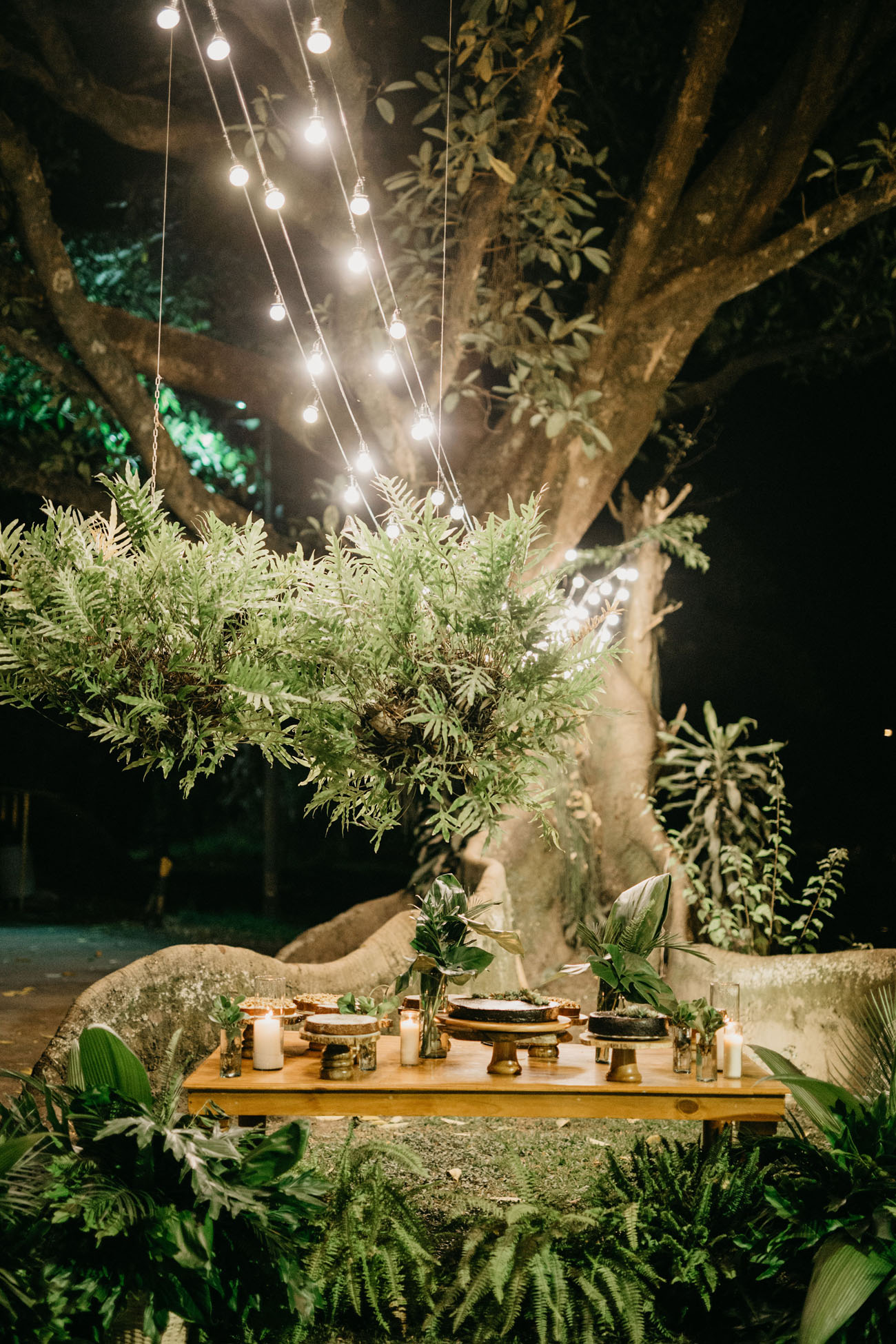Ese matrimonio que soñaban, tan nuestro, simple, minimalista, descomplicado, elegante, rústico, fue el espejo del que tuvieron. Mesas en madera, sillas de estilo industrial, bombillos, lámparas artesanales, follaje verde y miel, ni una sola flor, excepto la del yugo de Laura. Se aprovecharon del contraste propio del piso en piedra, de las tonalidades naturales y dejaron que el color lo pusieran las personas, porque de todos los temas las personas también fueron prioridad, porque los dos tienen familias grandes y unidas, porque comparten los amigos desde el colegio, porque estar en compañía de tantos que no ven muy a menudo y, también, de esos que ven con frecuencia, era la razón de esa fiesta en medio de lo que parecía un bosque, una feria íntima, un festín de otra época, un pueblito macondiano.