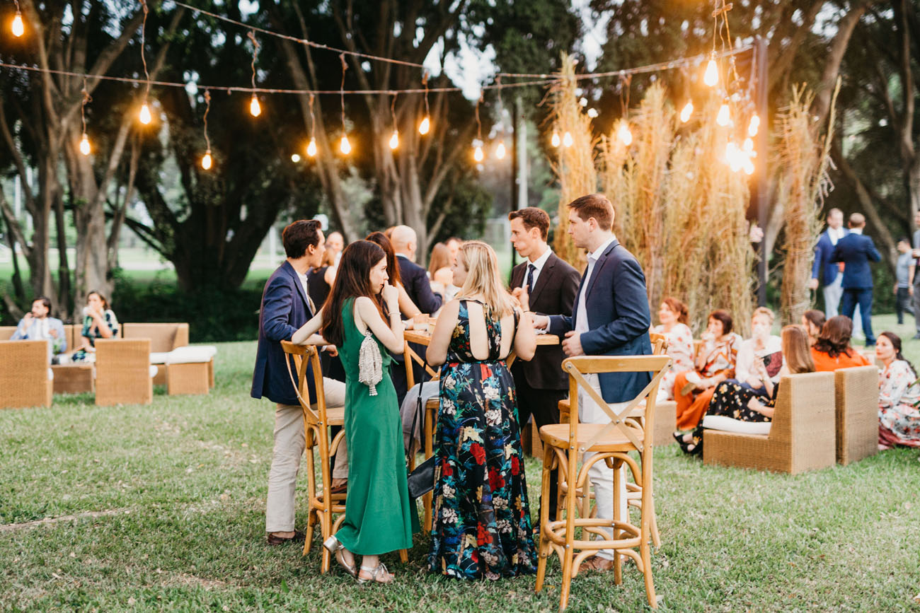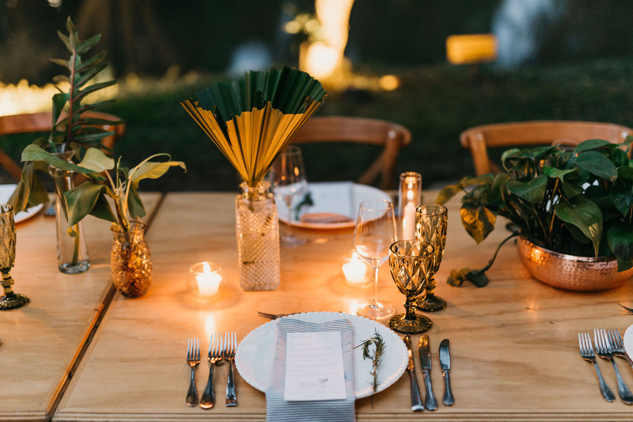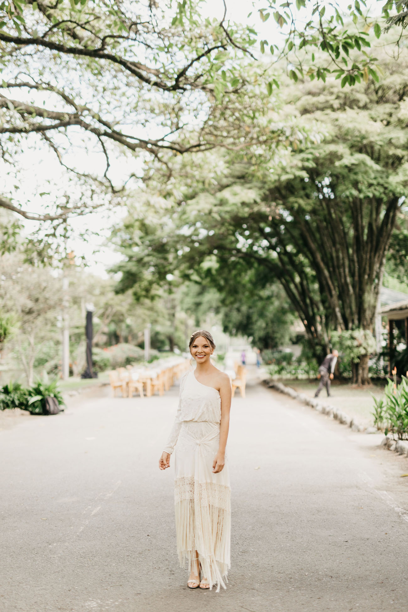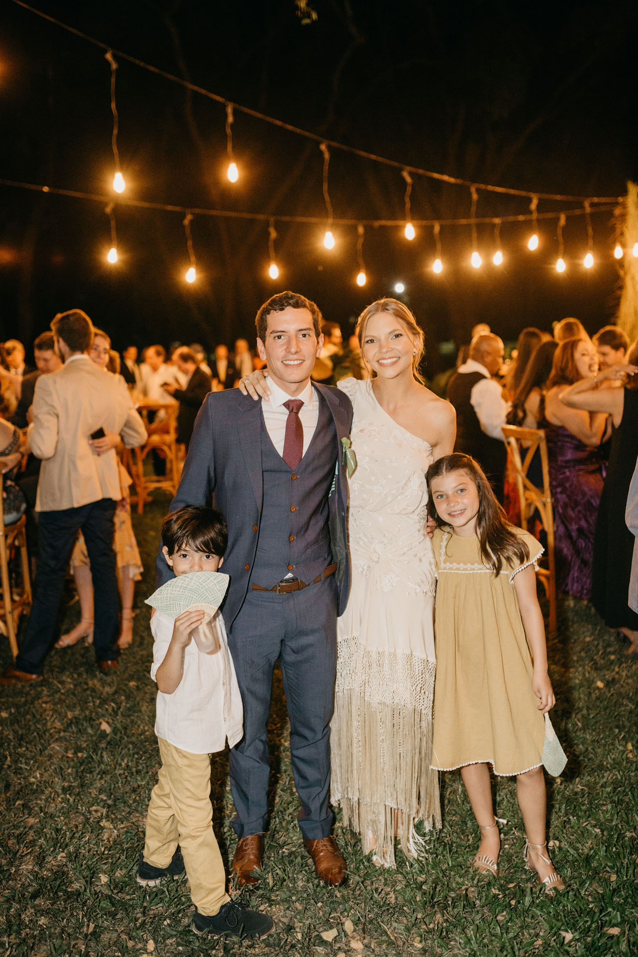Ese matrimonio que soñaban, tan nuestro, simple, minimalista, descomplicado, elegante, rústico, fue el espejo del que tuvieron. Mesas en madera, sillas de estilo industrial, bombillos, lámparas artesanales, follaje verde y miel, ni una sola flor, excepto la del yugo de Laura. Se aprovecharon del contraste propio del piso en piedra, de las tonalidades naturales y dejaron que el color lo pusieran las personas, porque de todos los temas las personas también fueron prioridad, porque los dos tienen familias grandes y unidas, porque comparten los amigos desde el colegio, porque estar en compañía de tantos que no ven muy a menudo y, también, de esos que ven con frecuencia, era la razón de esa fiesta en medio de lo que parecía un bosque, una feria íntima, un festín de otra época, un pueblito macondiano.