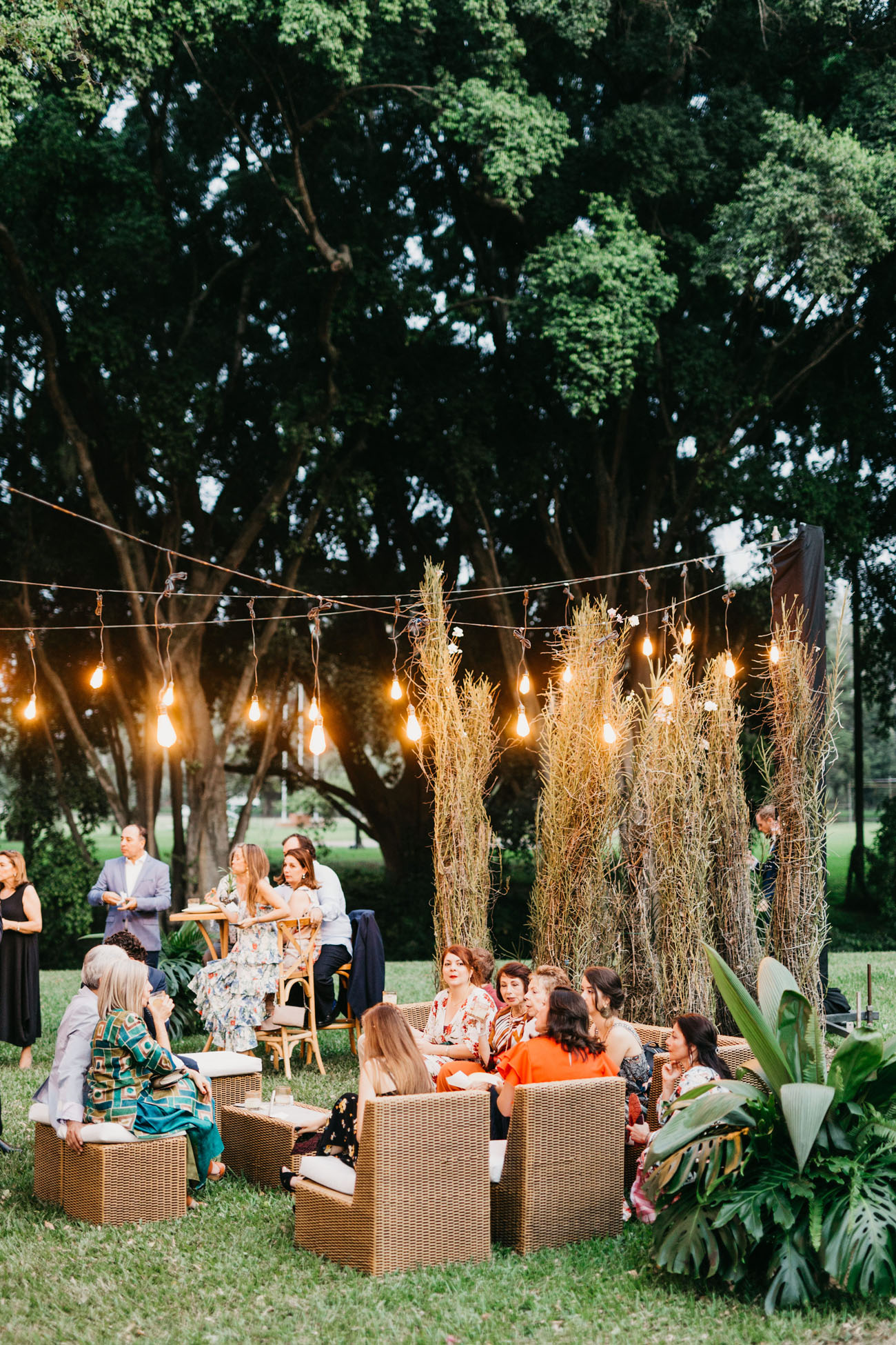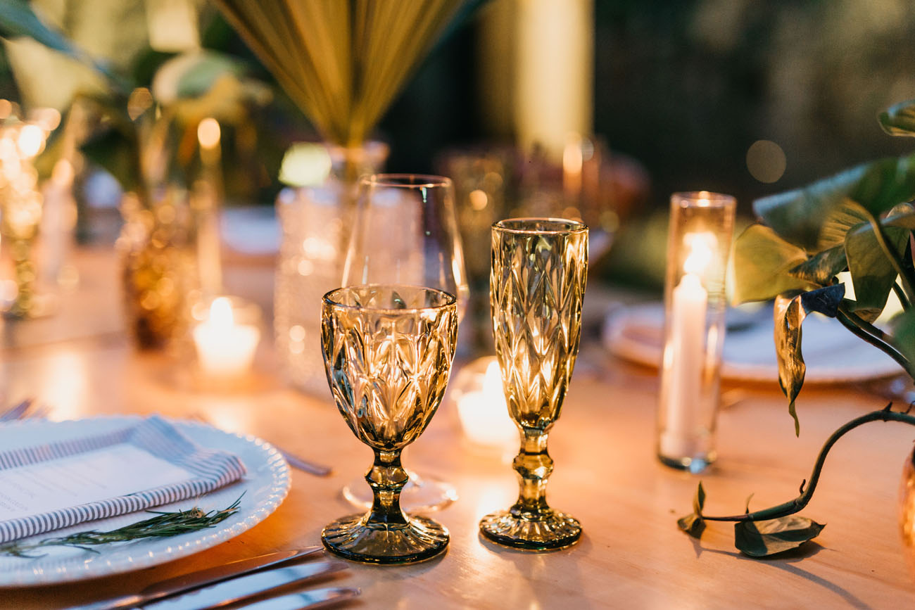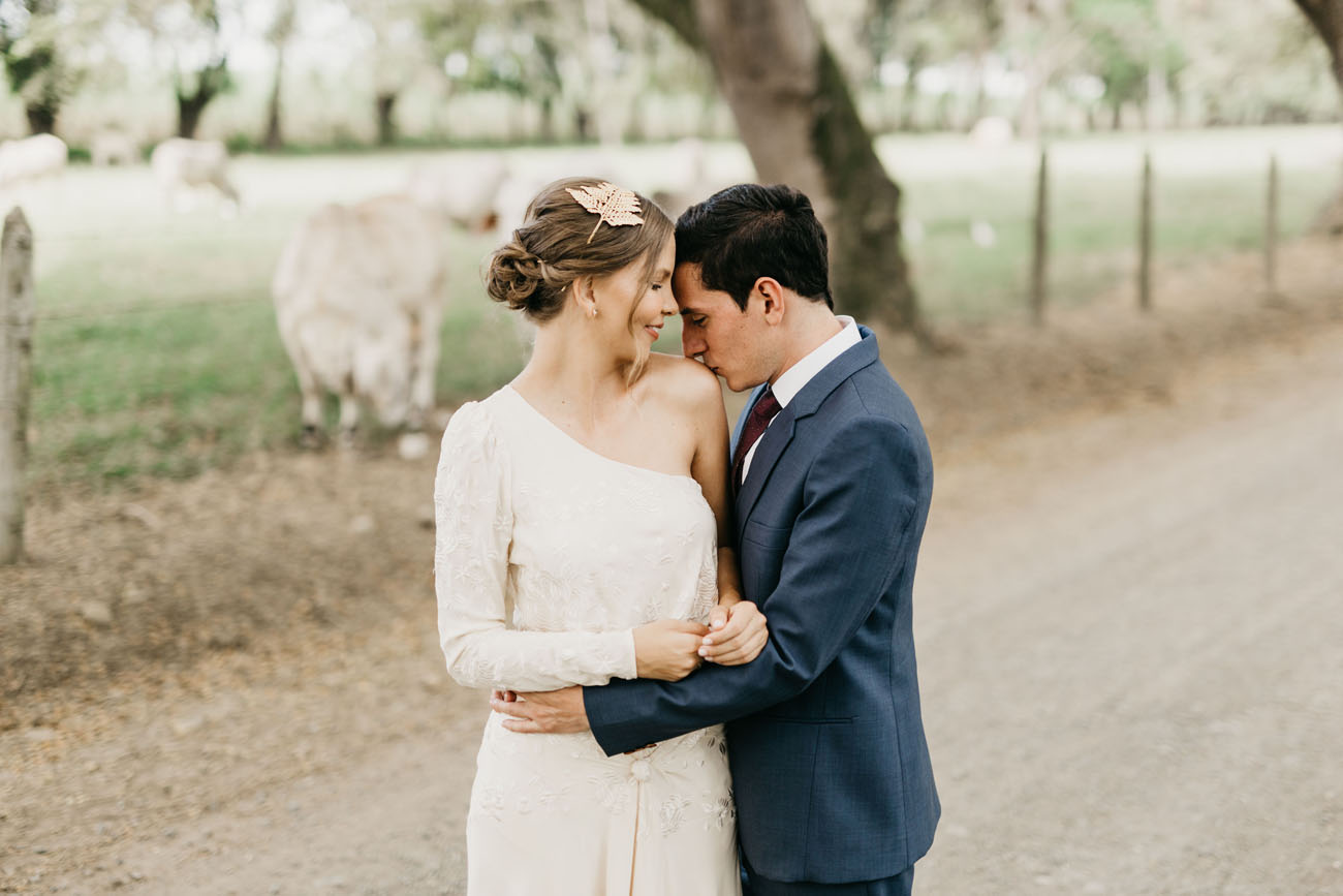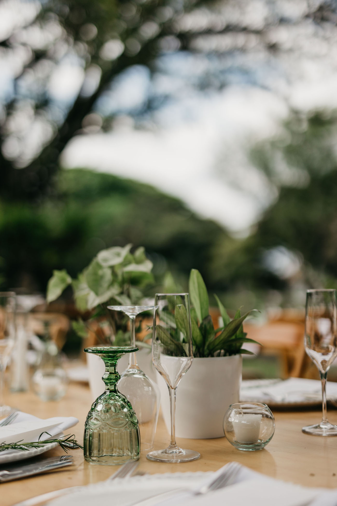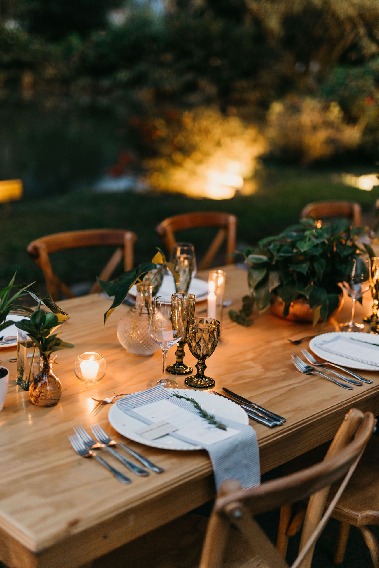 Ese matrimonio que soñaban, tan nuestro, simple, minimalista, descomplicado, elegante, rústico, fue el espejo del que tuvieron. Mesas en madera, sillas de estilo industrial, bombillos, lámparas artesanales, follaje verde y miel, ni una sola flor, excepto la del yugo de Laura. Se aprovecharon del contraste propio del piso en piedra, de las tonalidades naturales y dejaron que el color lo pusieran las personas, porque de todos los temas las personas también fueron prioridad, porque los dos tienen familias grandes y unidas, porque comparten los amigos desde el colegio, porque estar en compañía de tantos que no ven muy a menudo y, también, de esos que ven con frecuencia, era la razón de esa fiesta en medio de lo que parecía un bosque, una feria íntima, un festín de otra época, un pueblito macondiano.