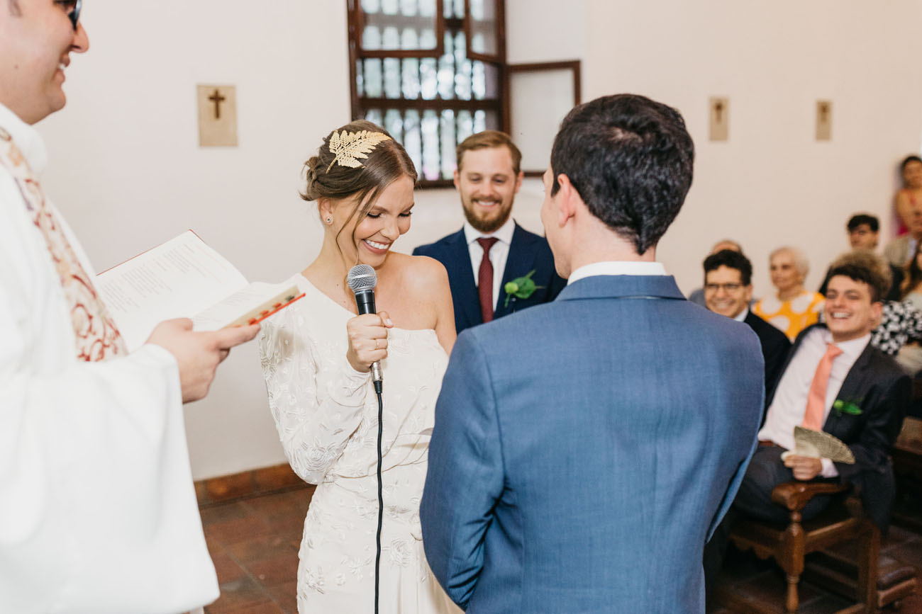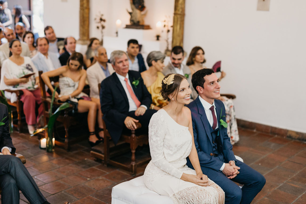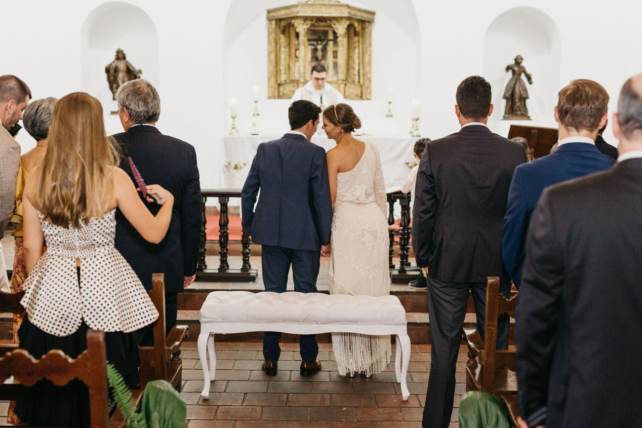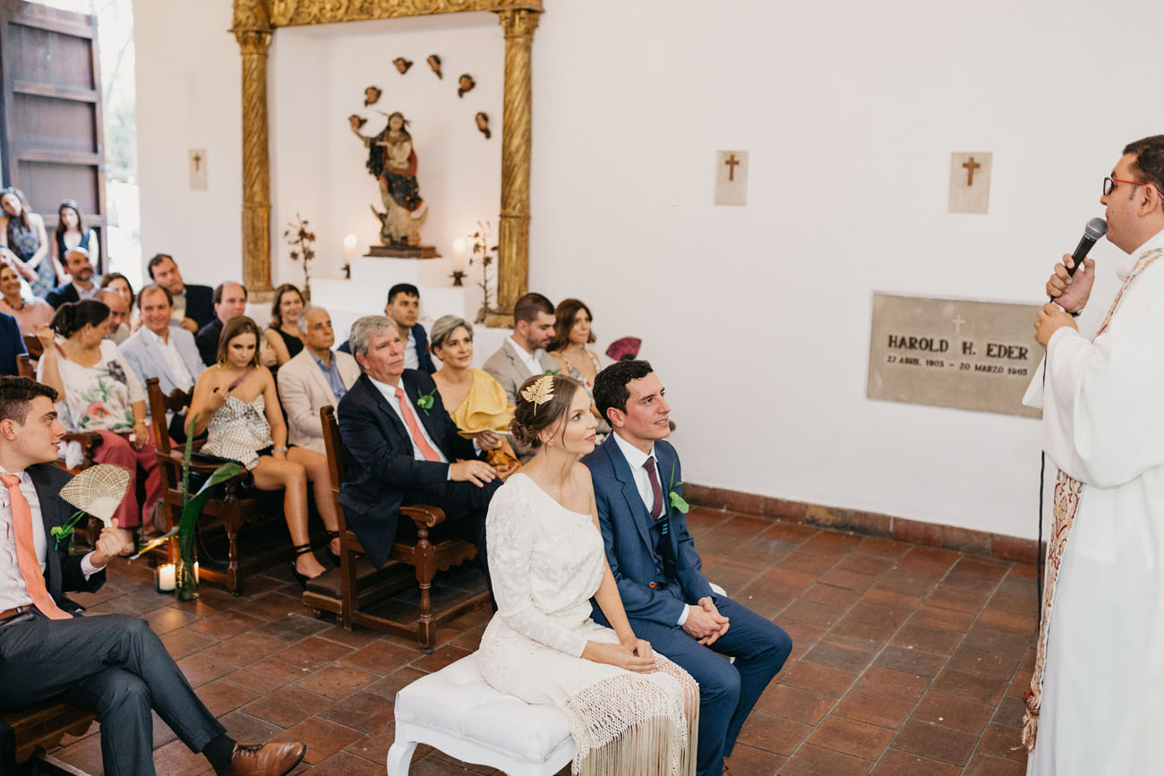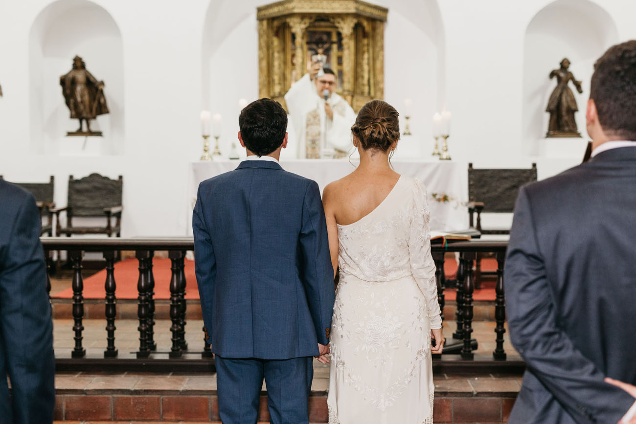 En esa iglesia que tenía tanto significado para Camilo cabían 100 invitados. Agregaron 100 sillas más afuera y a los invitados les dieron abanicos hechos por una artesana de Putumayo, para el calor. Además de los votos, que ellos personalizaron, la música hizo que la ceremonia fuera un momento más emotivo de lo que ya significa ese ritual donde muchas personas se reúnen para celebrar el amor. Una mujer, un hombre y tres instrumentos con la fuerza de lo que pareció un coro completo cantaron canciones en inglés, en español y en italiano. El sacerdote, además, fue un acierto de los más gratos: un discurso fresco, franco, sencillo que logró abrazar la esencia de los dos. En palabras de Laura, capturó la atención hasta de los menos creyentes.