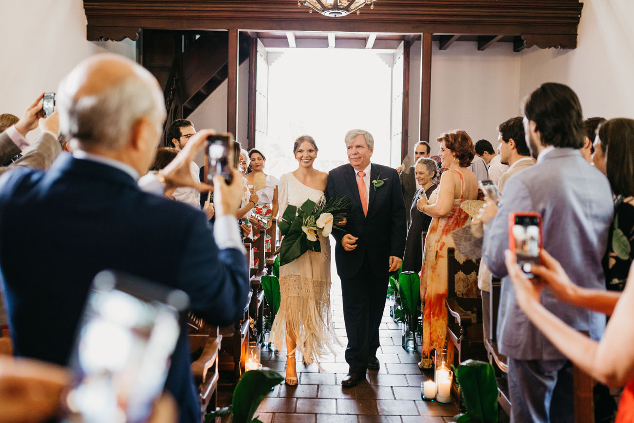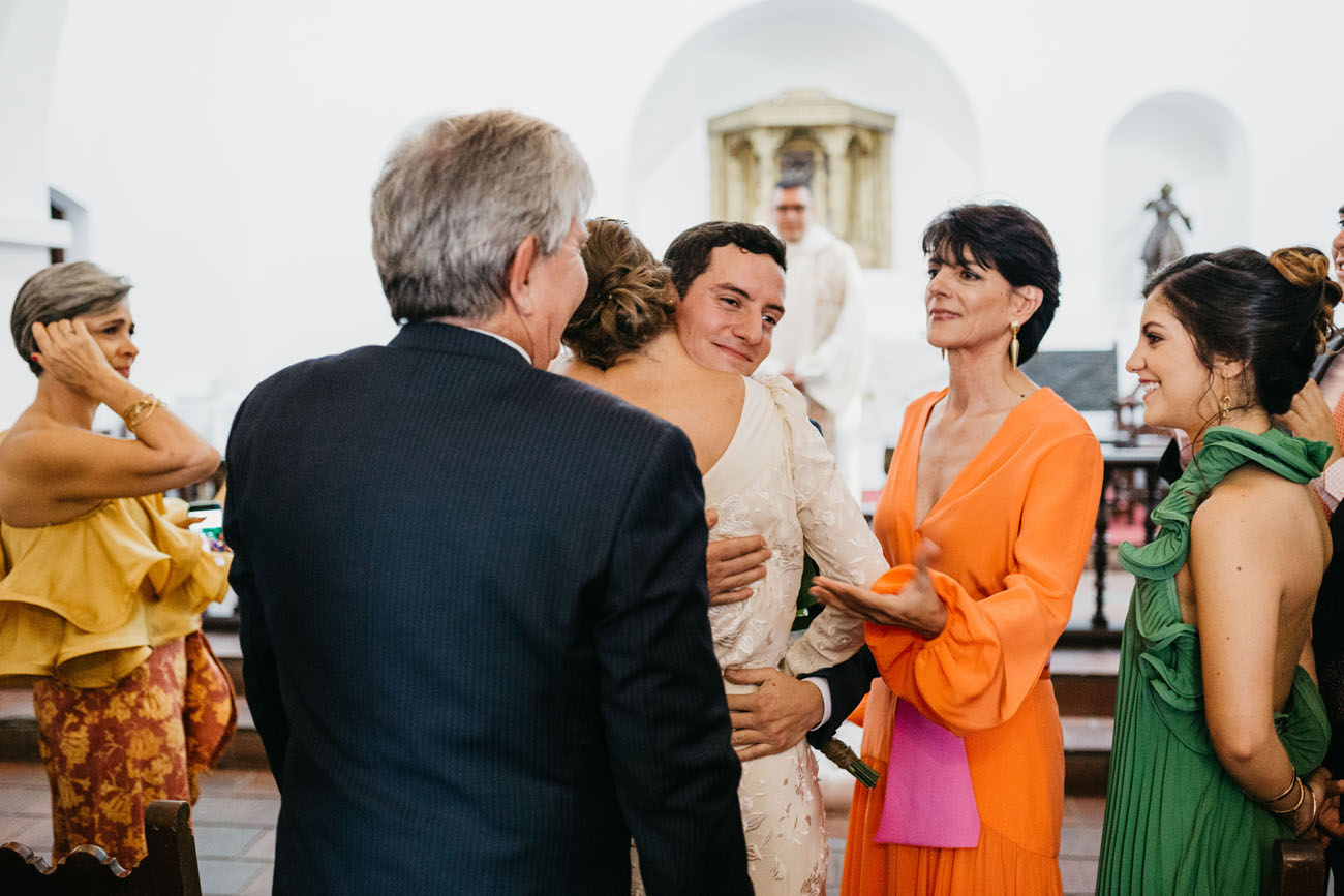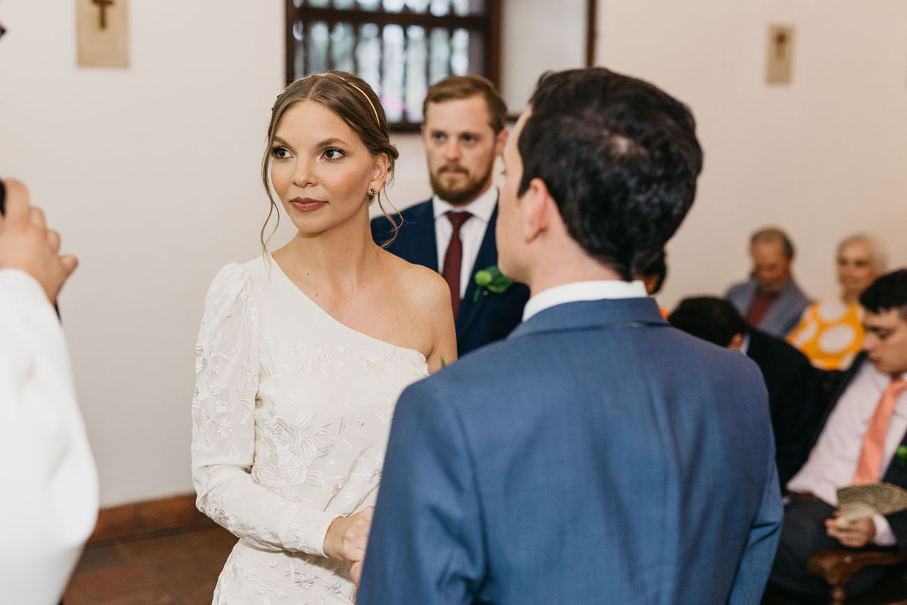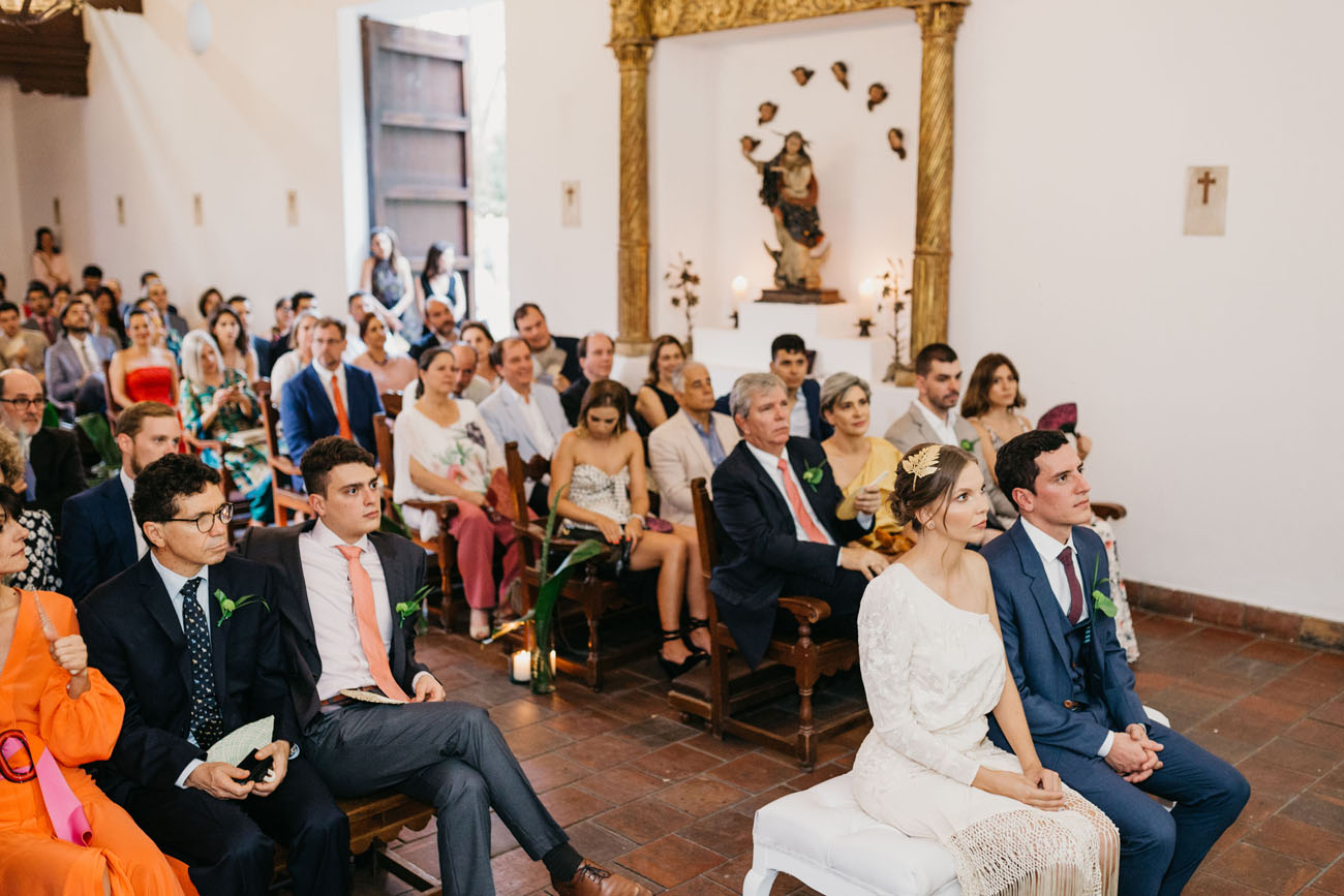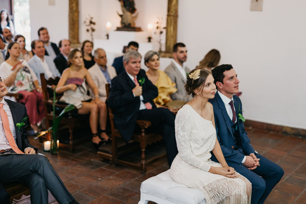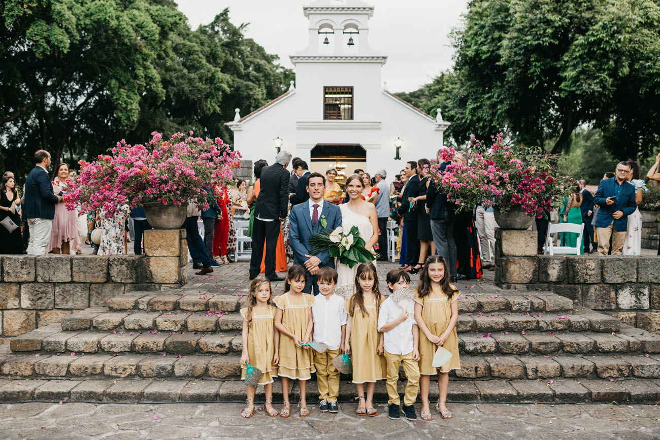 En esa iglesia que tenía tanto significado para Camilo cabían 100 invitados. Agregaron 100 sillas más afuera y a los invitados les dieron abanicos hechos por una artesana de Putumayo, para el calor. Además de los votos, que ellos personalizaron, la música hizo que la ceremonia fuera un momento más emotivo de lo que ya significa ese ritual donde muchas personas se reúnen para celebrar el amor. Una mujer, un hombre y tres instrumentos con la fuerza de lo que pareció un coro completo cantaron canciones en inglés, en español y en italiano. El sacerdote, además, fue un acierto de los más gratos: un discurso fresco, franco, sencillo que logró abrazar la esencia de los dos. En palabras de Laura, capturó la atención hasta de los menos creyentes.
