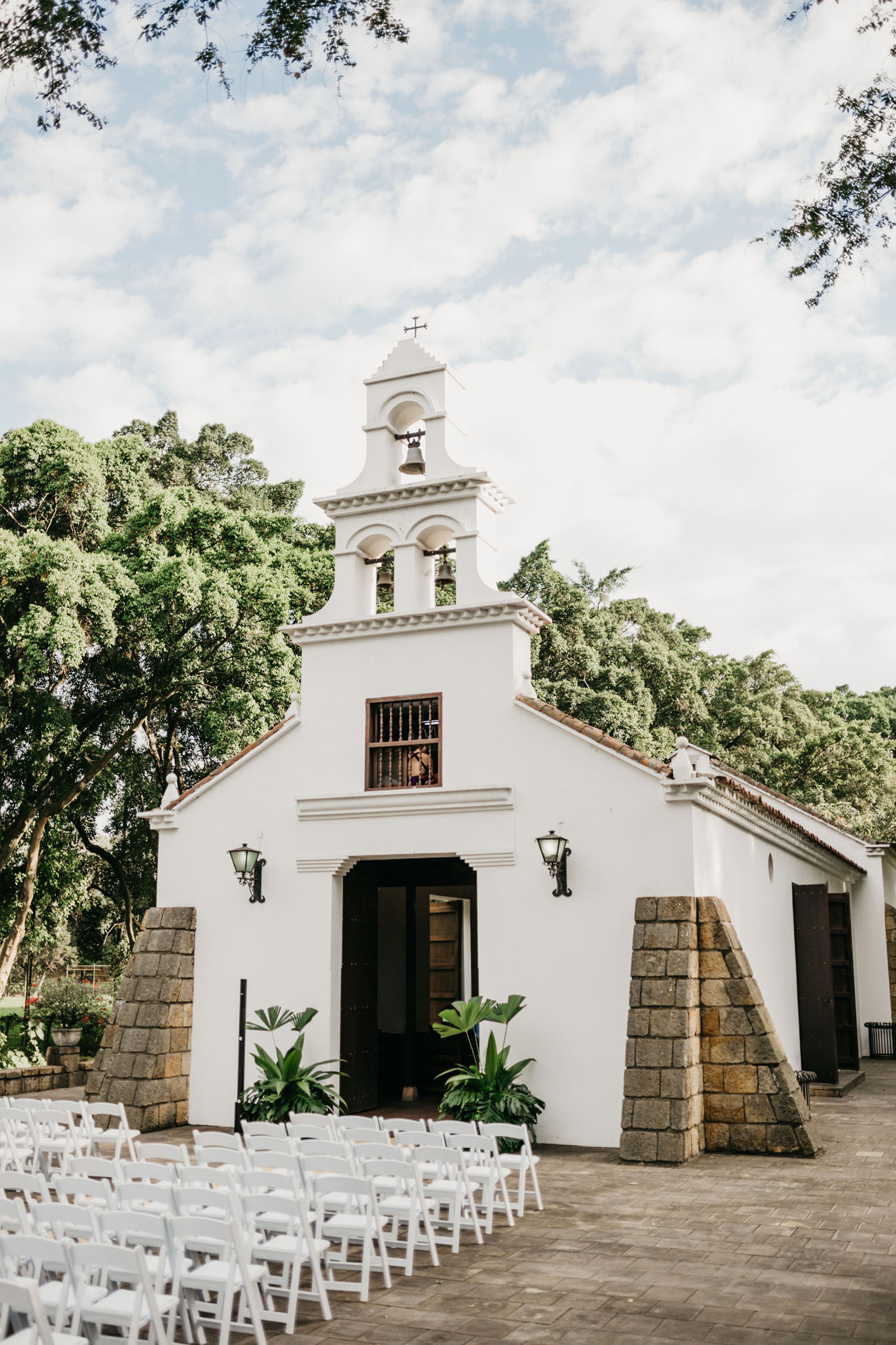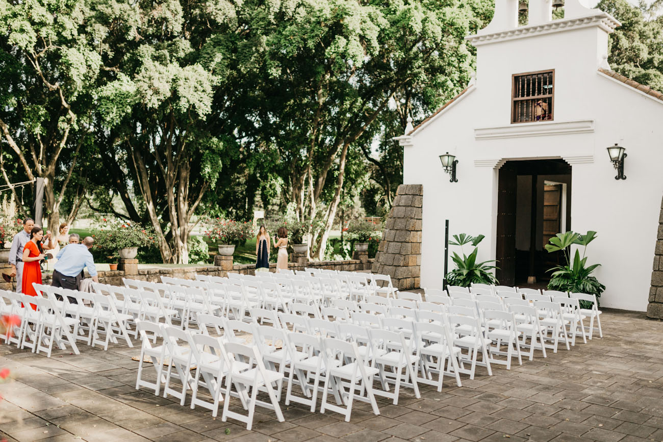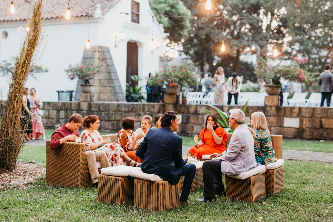 De todos los temas, la prioridad siempre fue el lugar. Ella se imaginaba una fiesta debajo de los árboles, al aire libre, una noche de luna llena. De ese anhelo de incluir naturaleza, buscaron el mes en que —históricamente— lloviera menos en Cali: 20 de julio resultó siendo la fecha. Él, por su parte, se imaginaba la iglesia Manuelita, esa capilla que construyó su bisabuelo, donde se casaron sus papás. De ese anhelo, fueron entonces a conocerla.