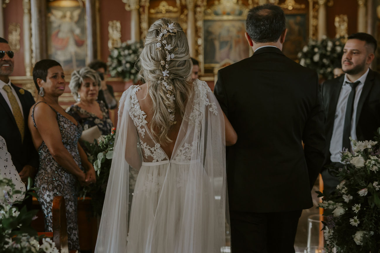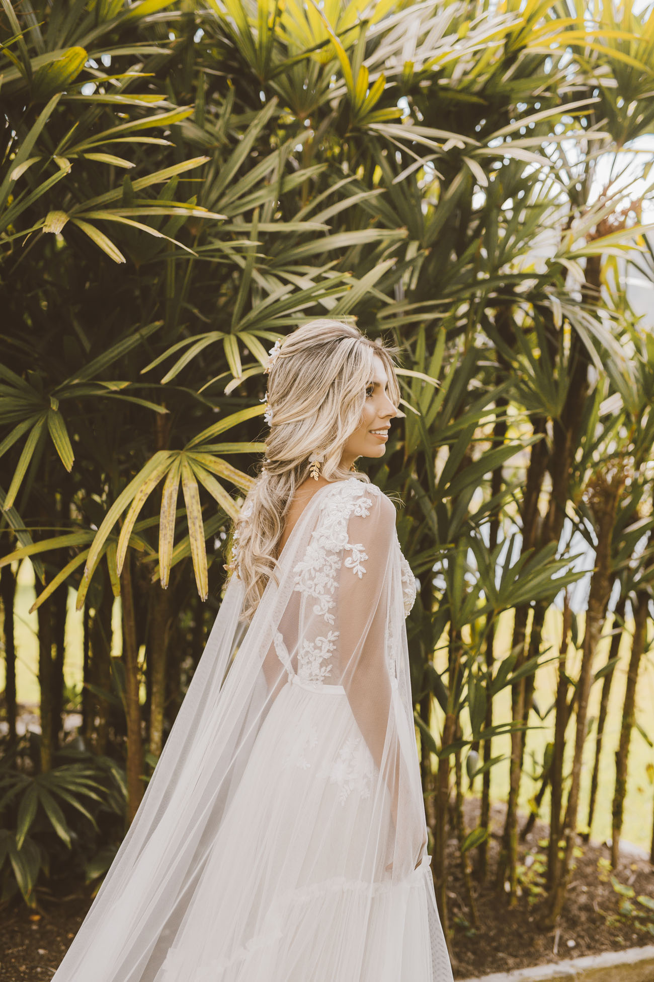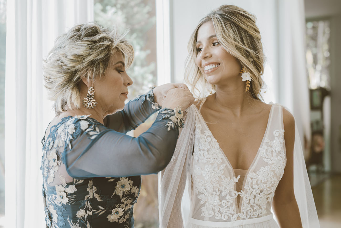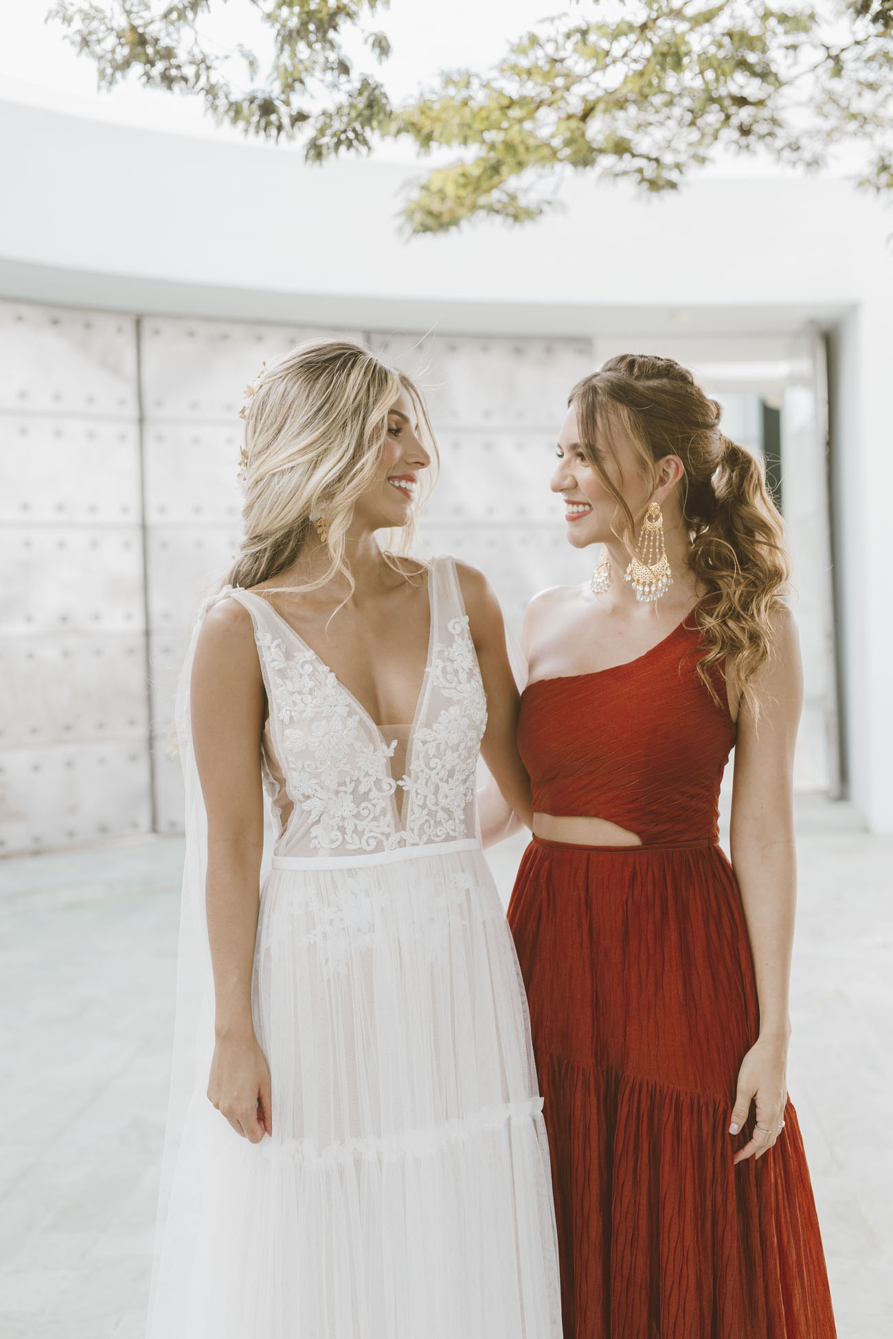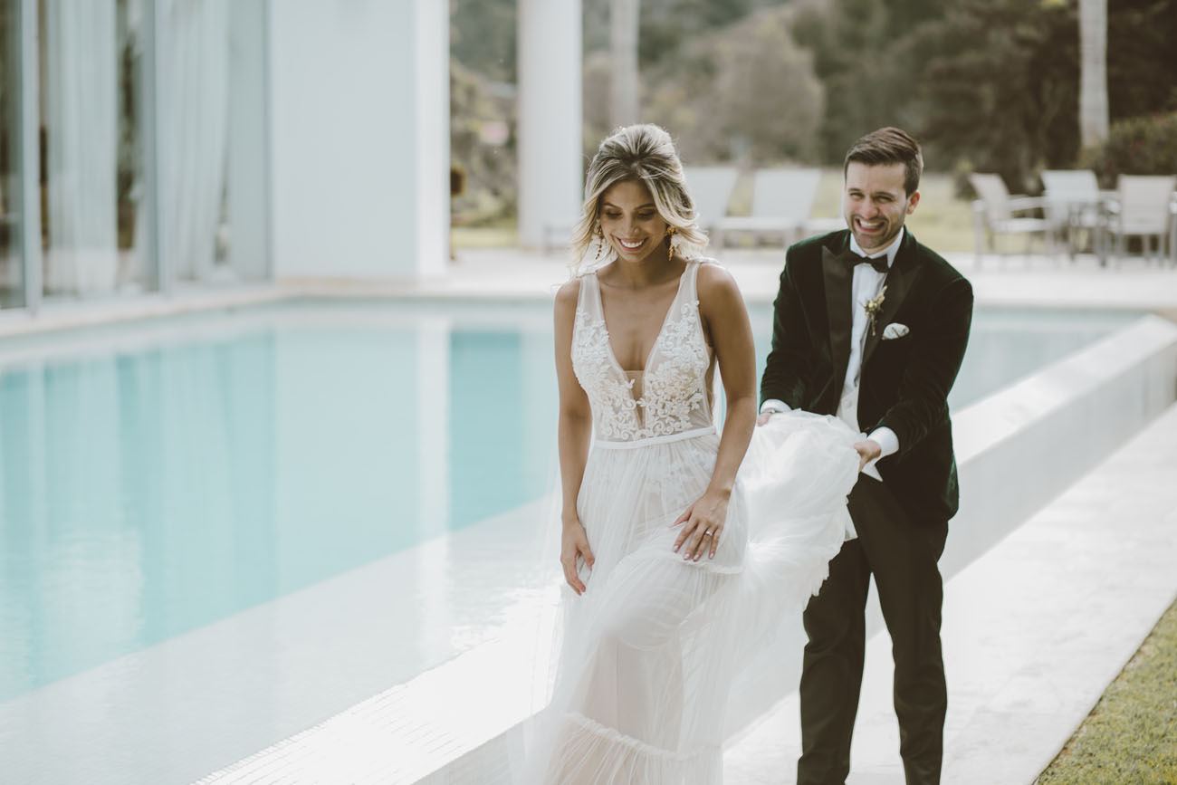 Si para la fiesta Melissa tenía muchas cosas claras, para el vestido no tanto. No sabía si mandarlo a hacer, si alquilarlo, si comprarlo. Le recomendaron varios lugares y se dedicó a buscar su silueta. Con eso listo, se enteró de De Novia a Novia y allí lo encontró: uno de la colección cápsula de Luisa Nicholls. Lo compró y se reunió con ella para ajustar detalles. Una capa, por ejemplo. Ese vestido que Luisa diseñó pensando en alguna novia se convirtió en el vestido de Melissa. En el que se sintió ella, en el que se disfrutó como sin afanes.