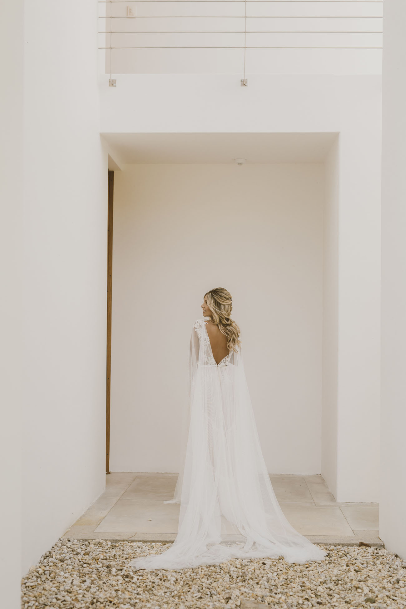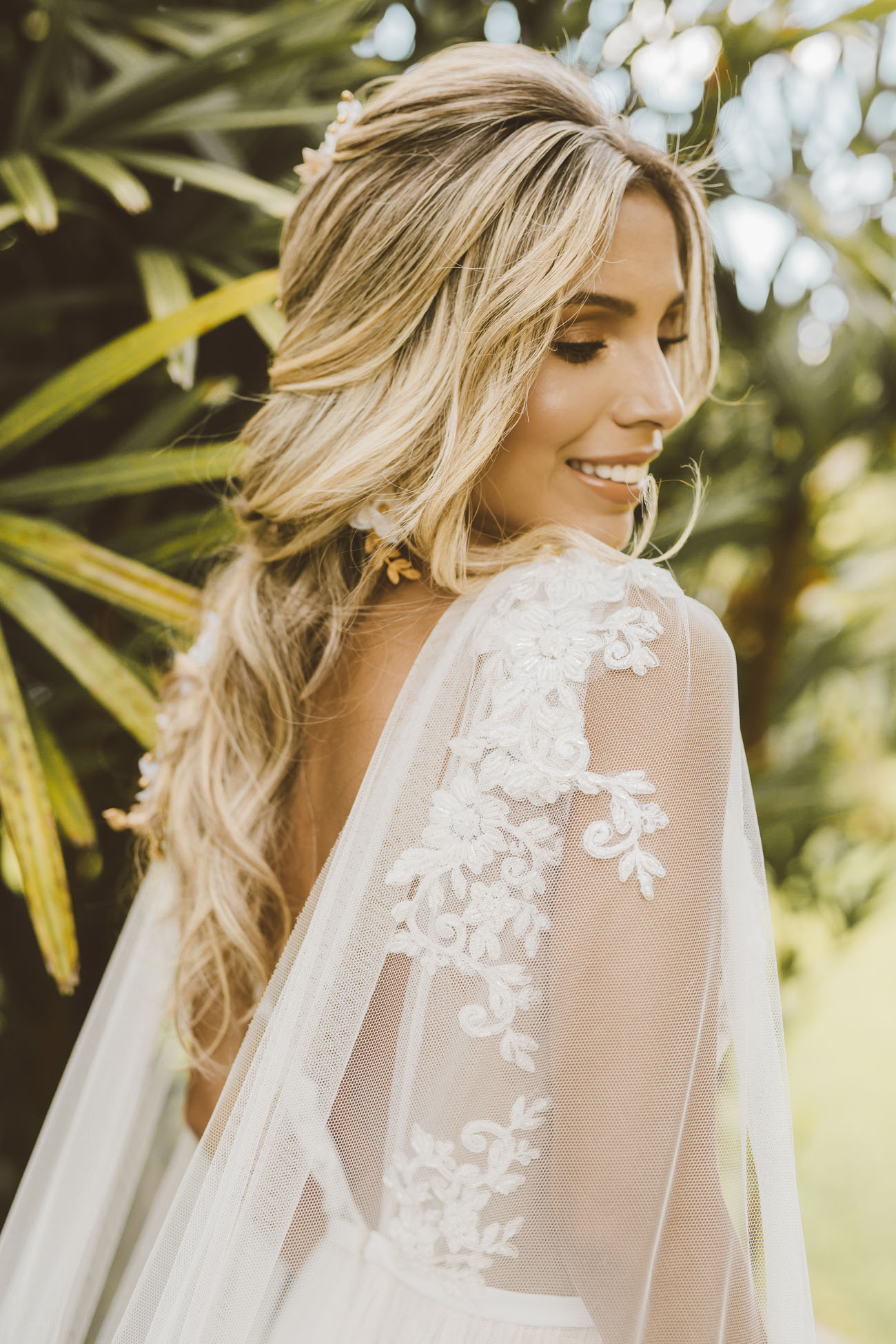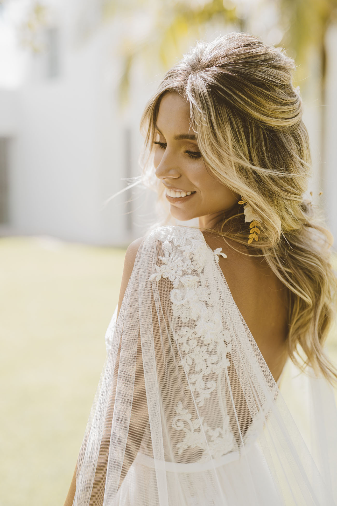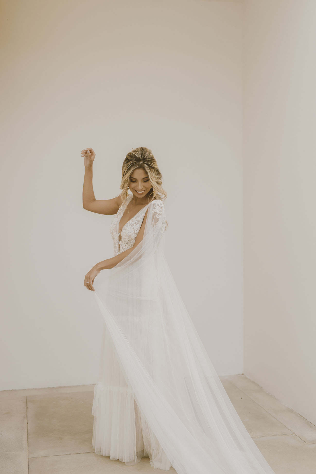 Si para la fiesta Melissa tenía muchas cosas claras, para el vestido no tanto. No sabía si mandarlo a hacer, si alquilarlo, si comprarlo. Le recomendaron varios lugares y se dedicó a buscar su silueta. Con eso listo, se enteró de De Novia a Novia y allí lo encontró: uno de la colección cápsula de Luisa Nicholls. Lo compró y se reunió con ella para ajustar detalles. Una capa, por ejemplo. Ese vestido que Luisa diseñó pensando en alguna novia se convirtió en el vestido de Melissa. En el que se sintió ella, en el que se disfrutó como sin afanes.