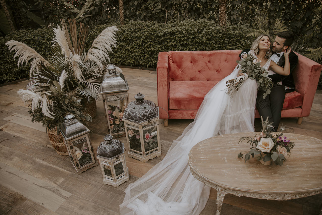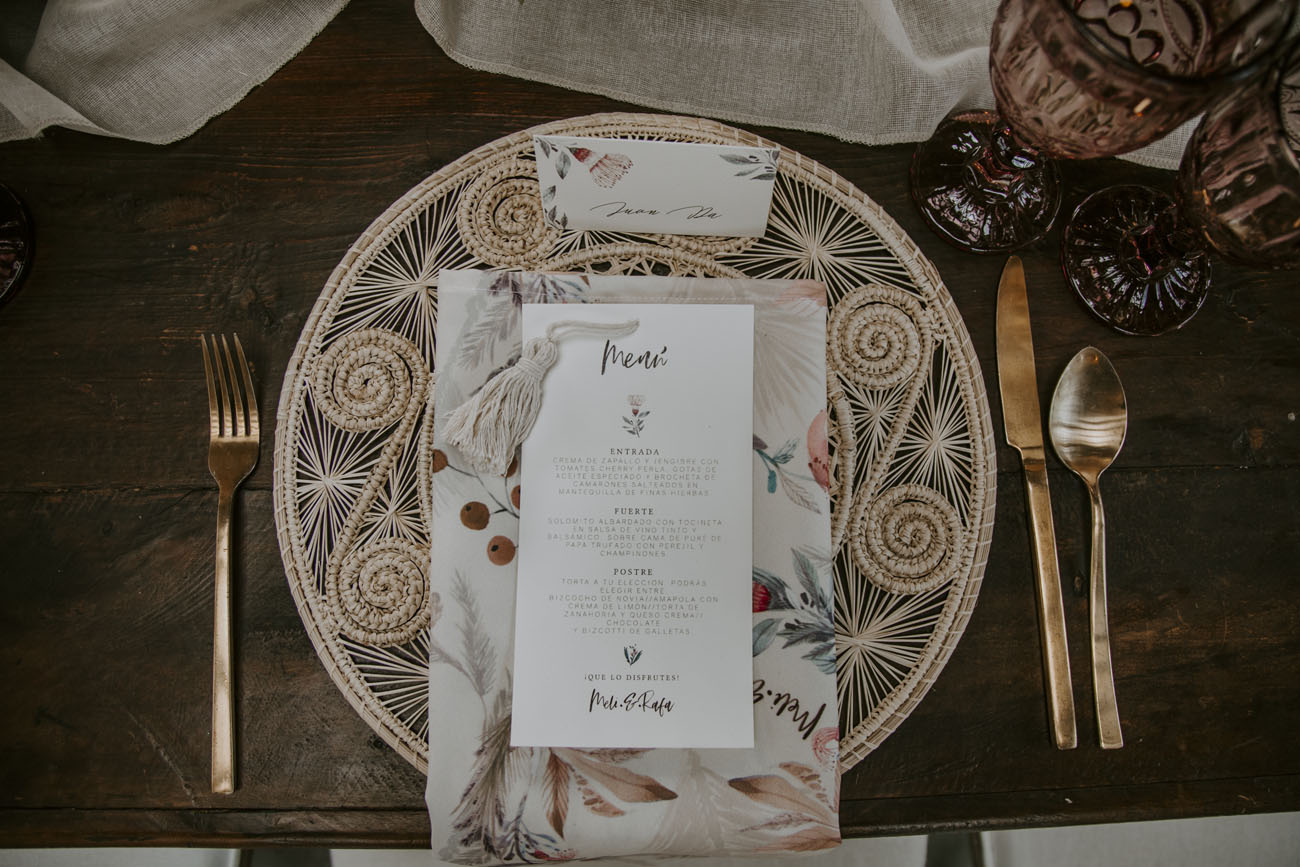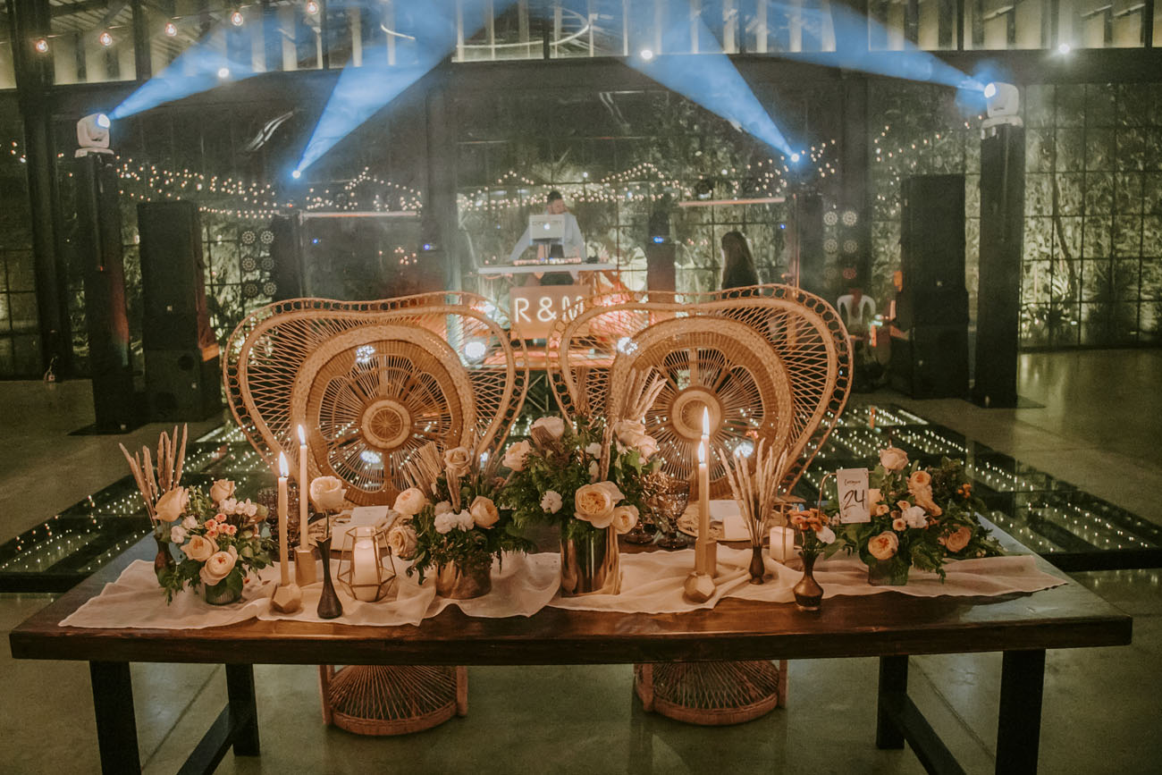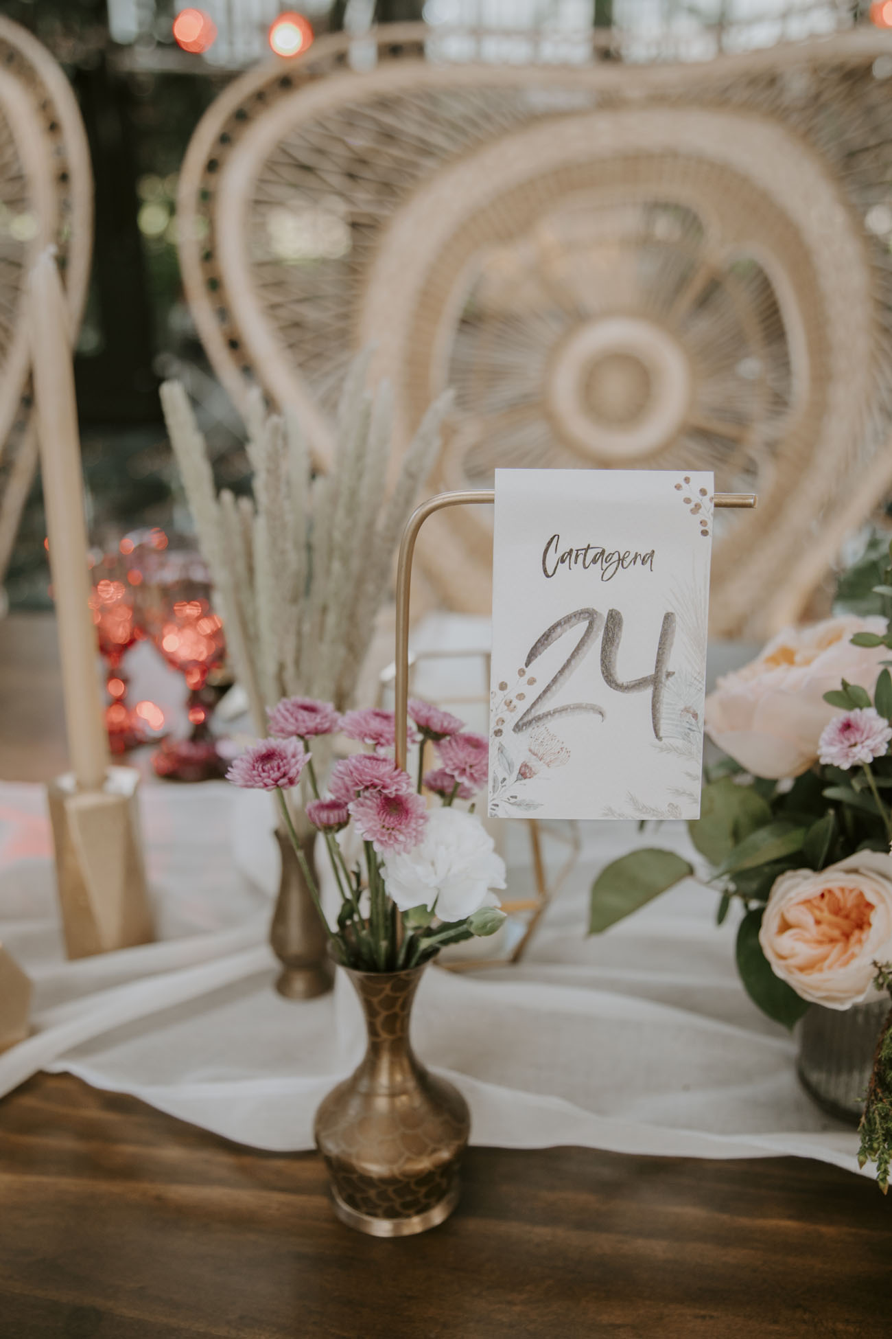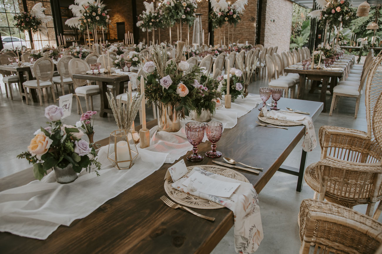 Querían una decoración que incluyera plumas, colores pasteles, que prestara mucha atención a los detalles. Un tanto natural sin perder el foco de la elegancia. Melissa lo tenía claro: llegó a la oficina de Caro Chica con imágenes referentes donde varios elementos (cobre, rosas, colores claros, trigo, rattan) se repetían. Con ellos crearon un concepto que Caro Chica describe como romántico-natural-bohemio.