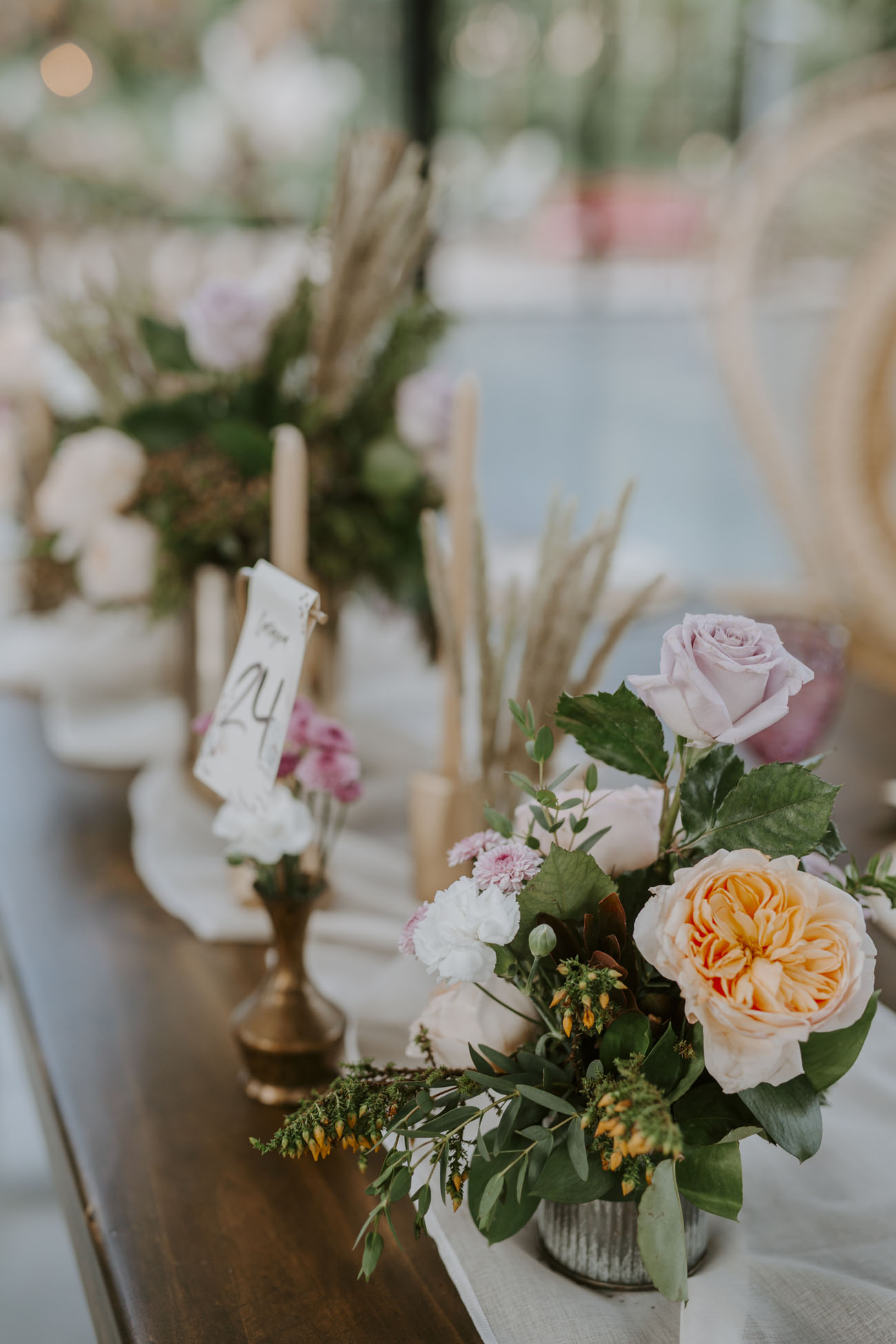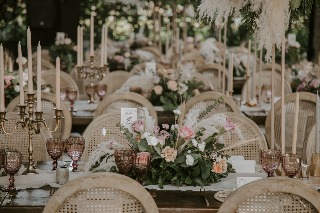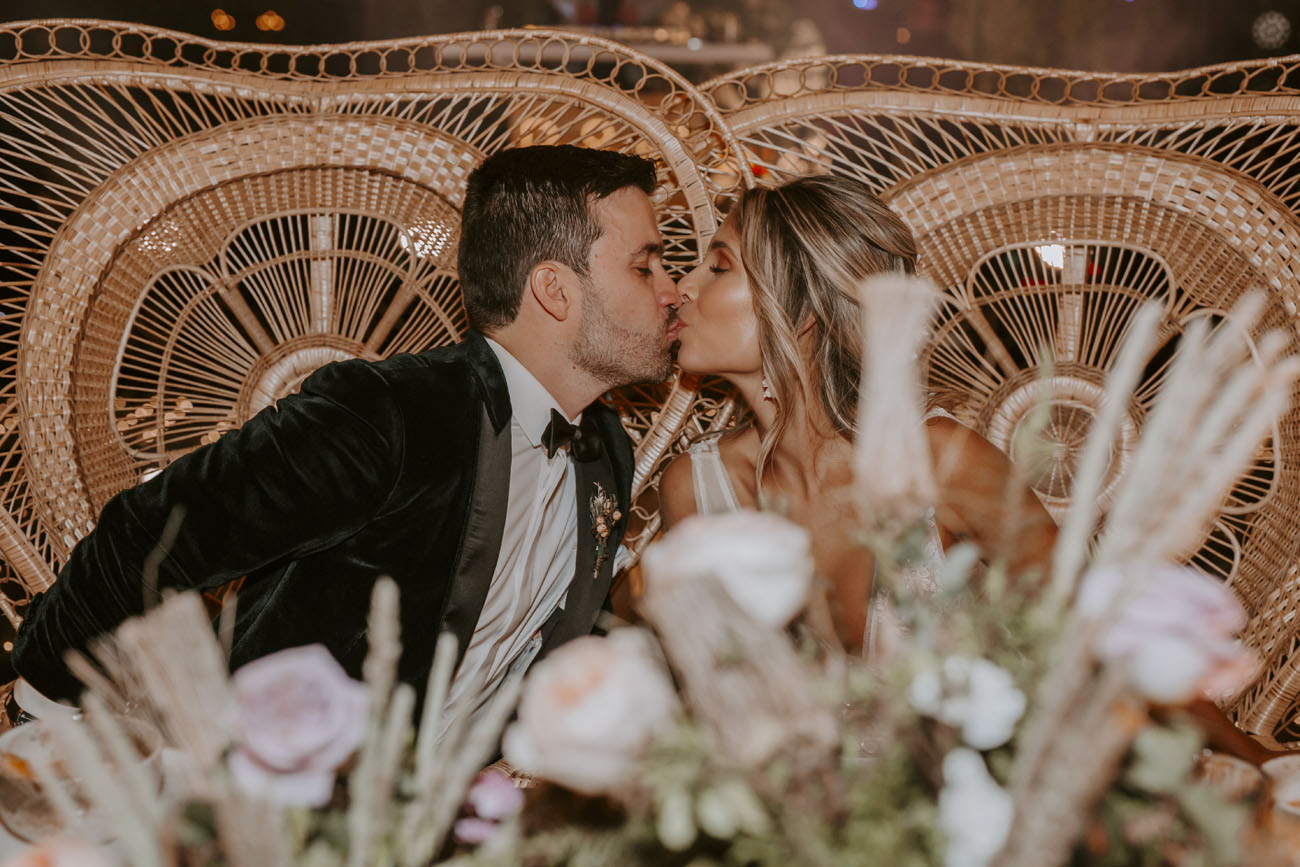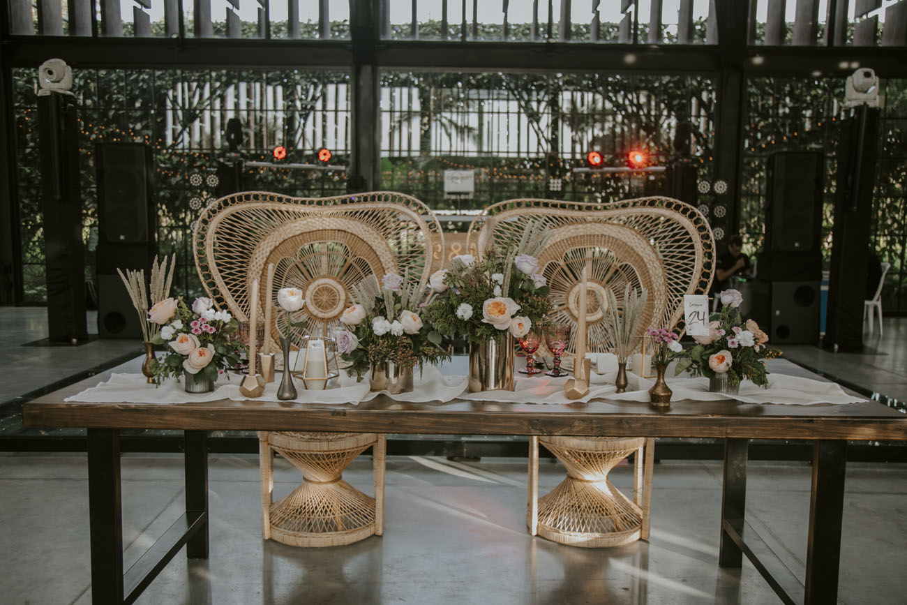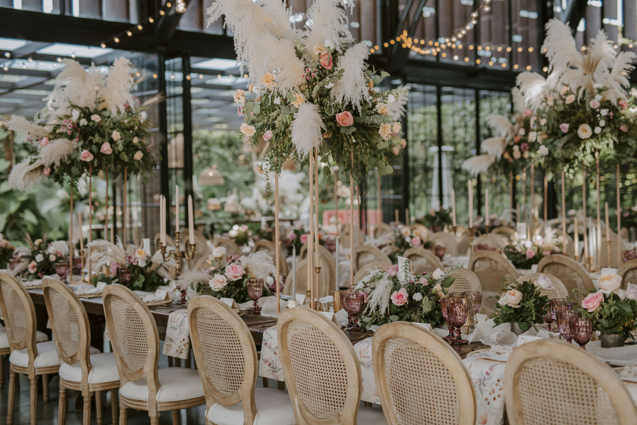 Querían una decoración que incluyera plumas, colores pasteles, que prestara mucha atención a los detalles. Un tanto natural sin perder el foco de la elegancia. Melissa lo tenía claro: llegó a la oficina de Caro Chica con imágenes referentes donde varios elementos (cobre, rosas, colores claros, trigo, rattan) se repetían. Con ellos crearon un concepto que Caro Chica describe como romántico-natural-bohemio.