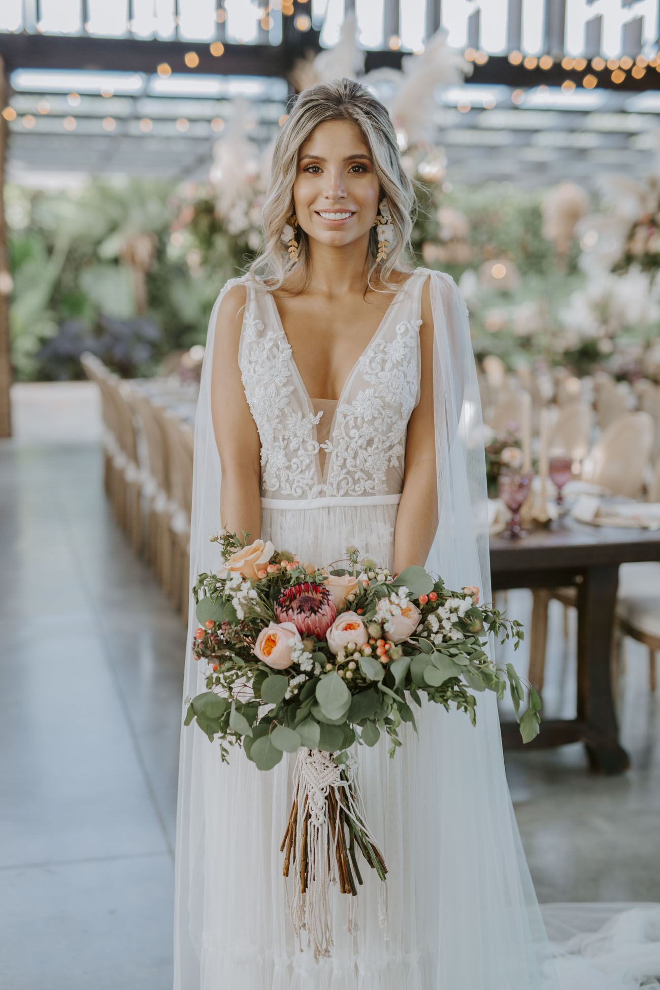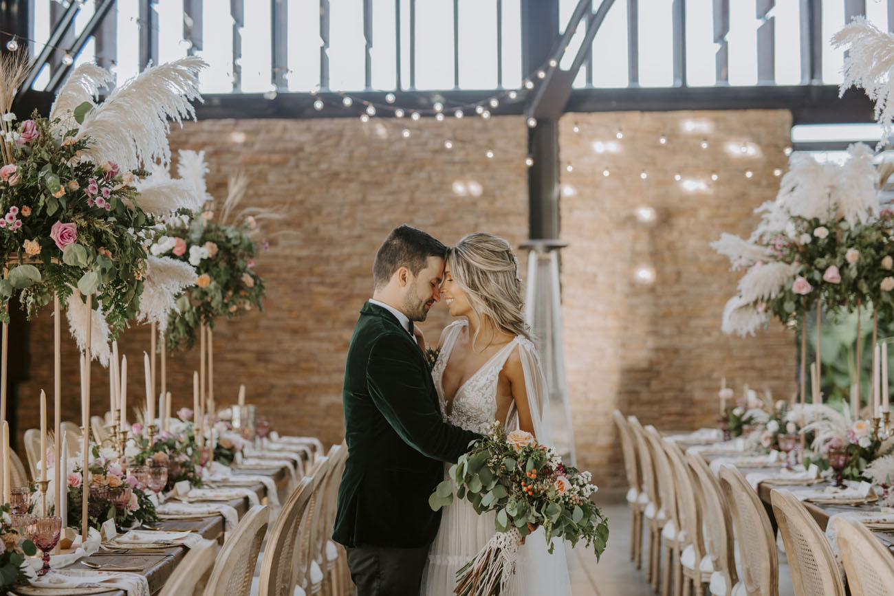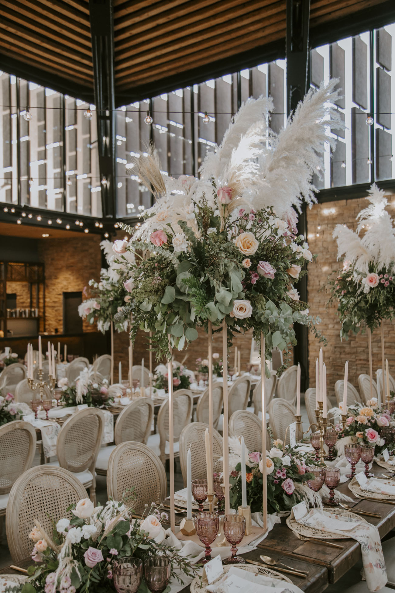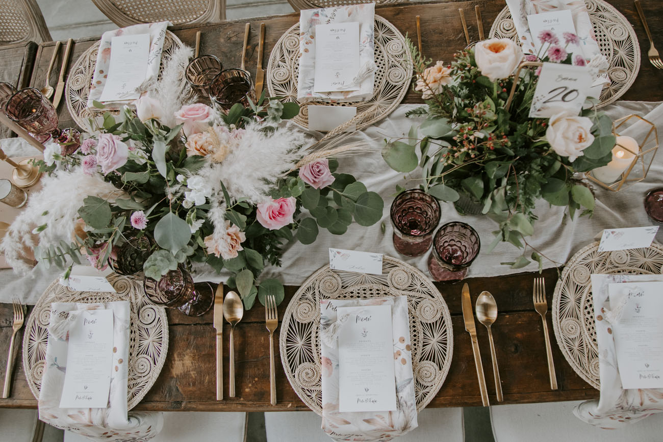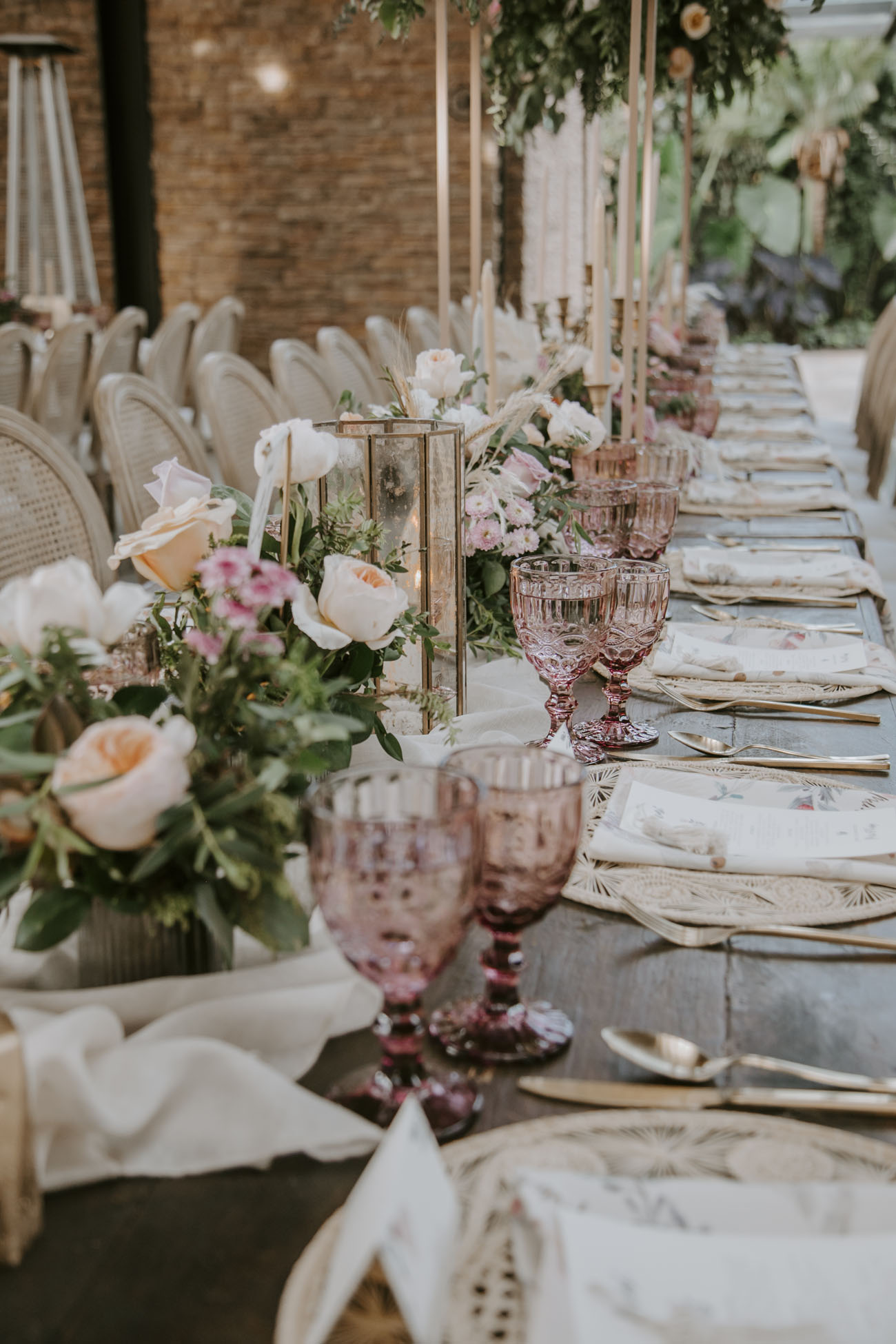 Querían una decoración que incluyera plumas, colores pasteles, que prestara mucha atención a los detalles. Un tanto natural sin perder el foco de la elegancia. Melissa lo tenía claro: llegó a la oficina de Caro Chica con imágenes referentes donde varios elementos (cobre, rosas, colores claros, trigo, rattan) se repetían. Con ellos crearon un concepto que Caro Chica describe como romántico-natural-bohemio.