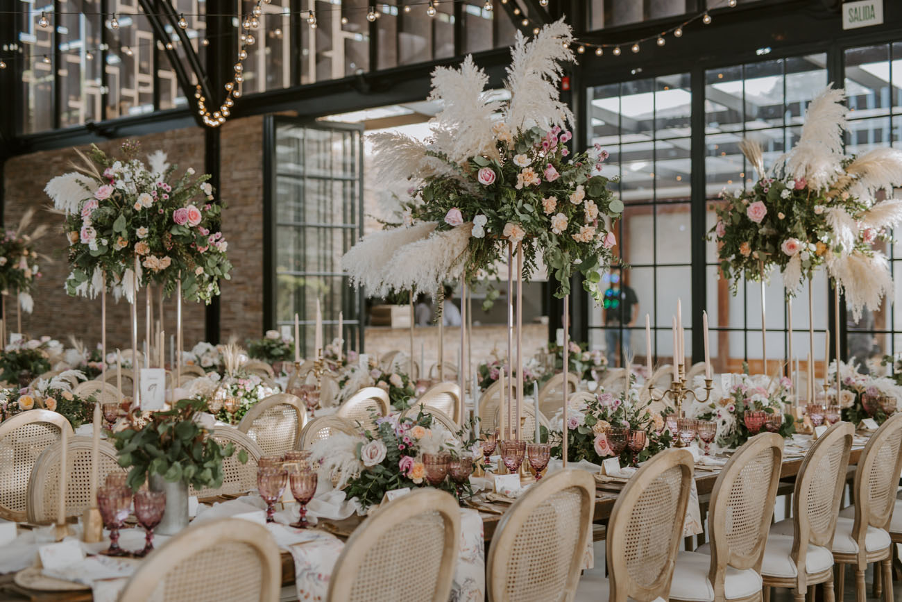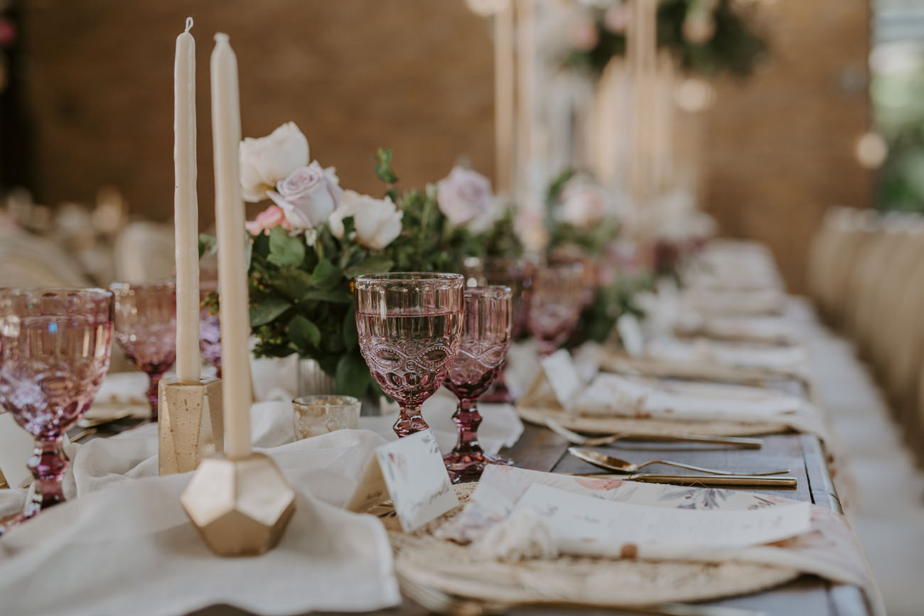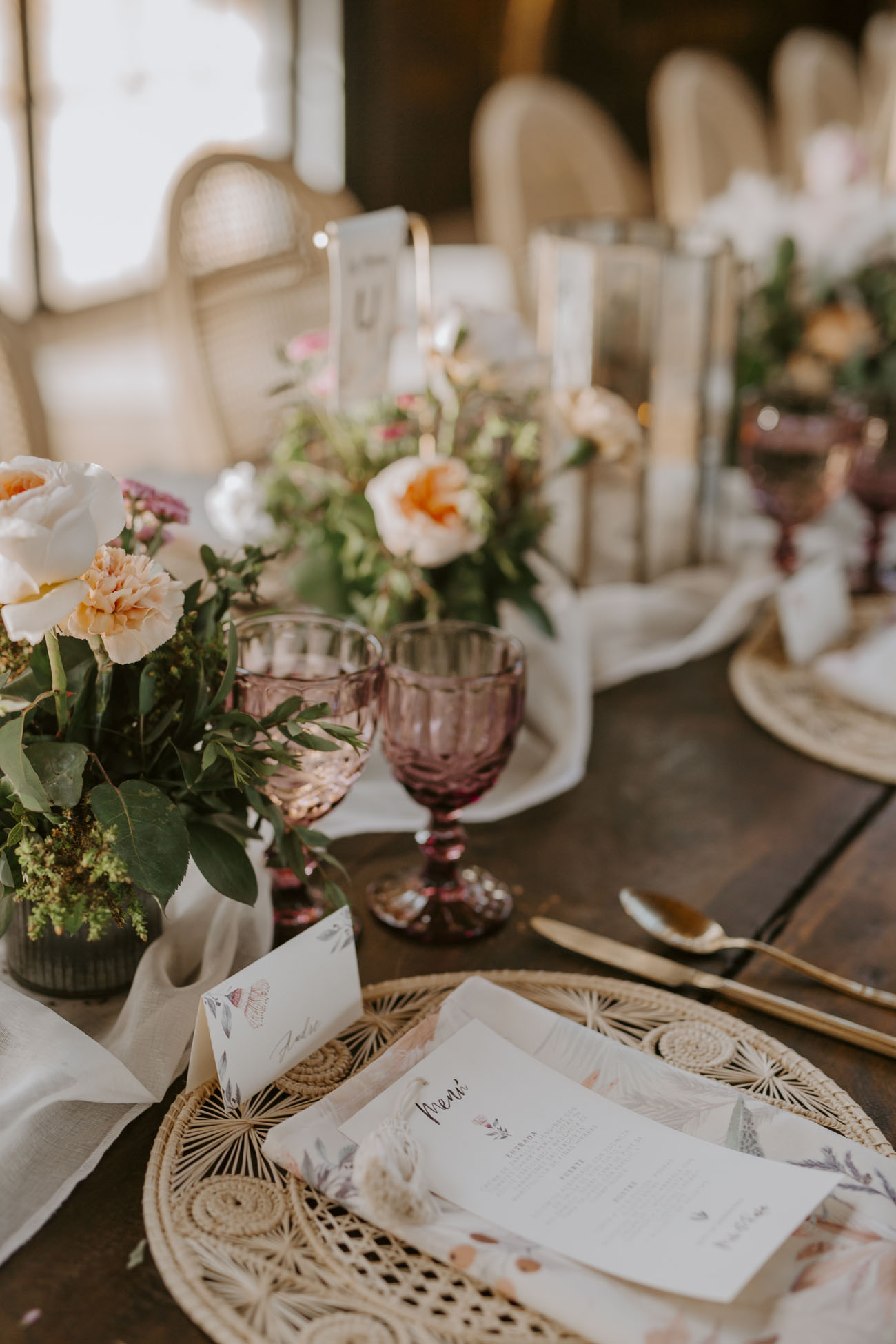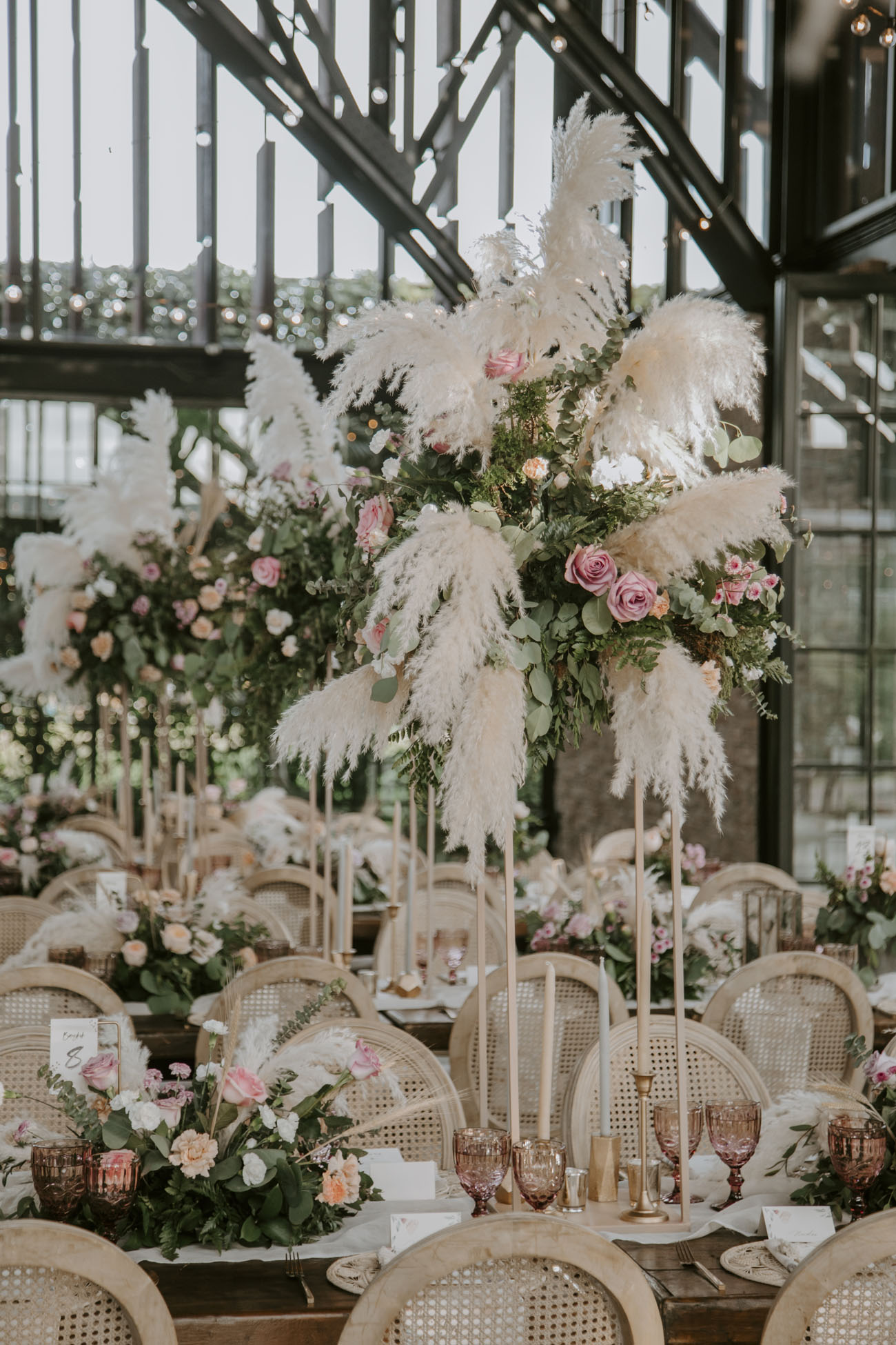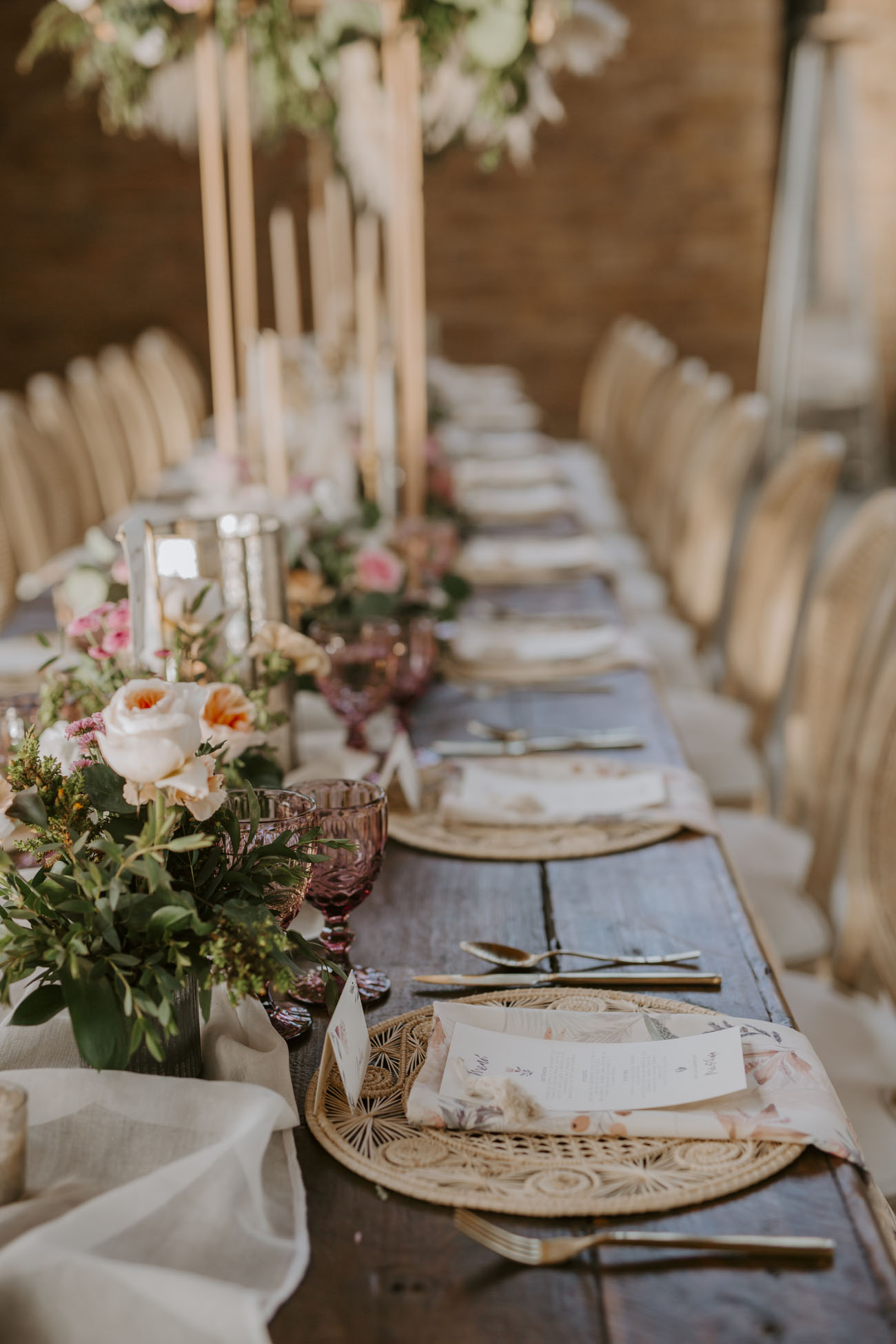 Querían una decoración que incluyera plumas, colores pasteles, que prestara mucha atención a los detalles. Un tanto natural sin perder el foco de la elegancia. Melissa lo tenía claro: llegó a la oficina de Caro Chica con imágenes referentes donde varios elementos (cobre, rosas, colores claros, trigo, rattan) se repetían. Con ellos crearon un concepto que Caro Chica describe como romántico-natural-bohemio.