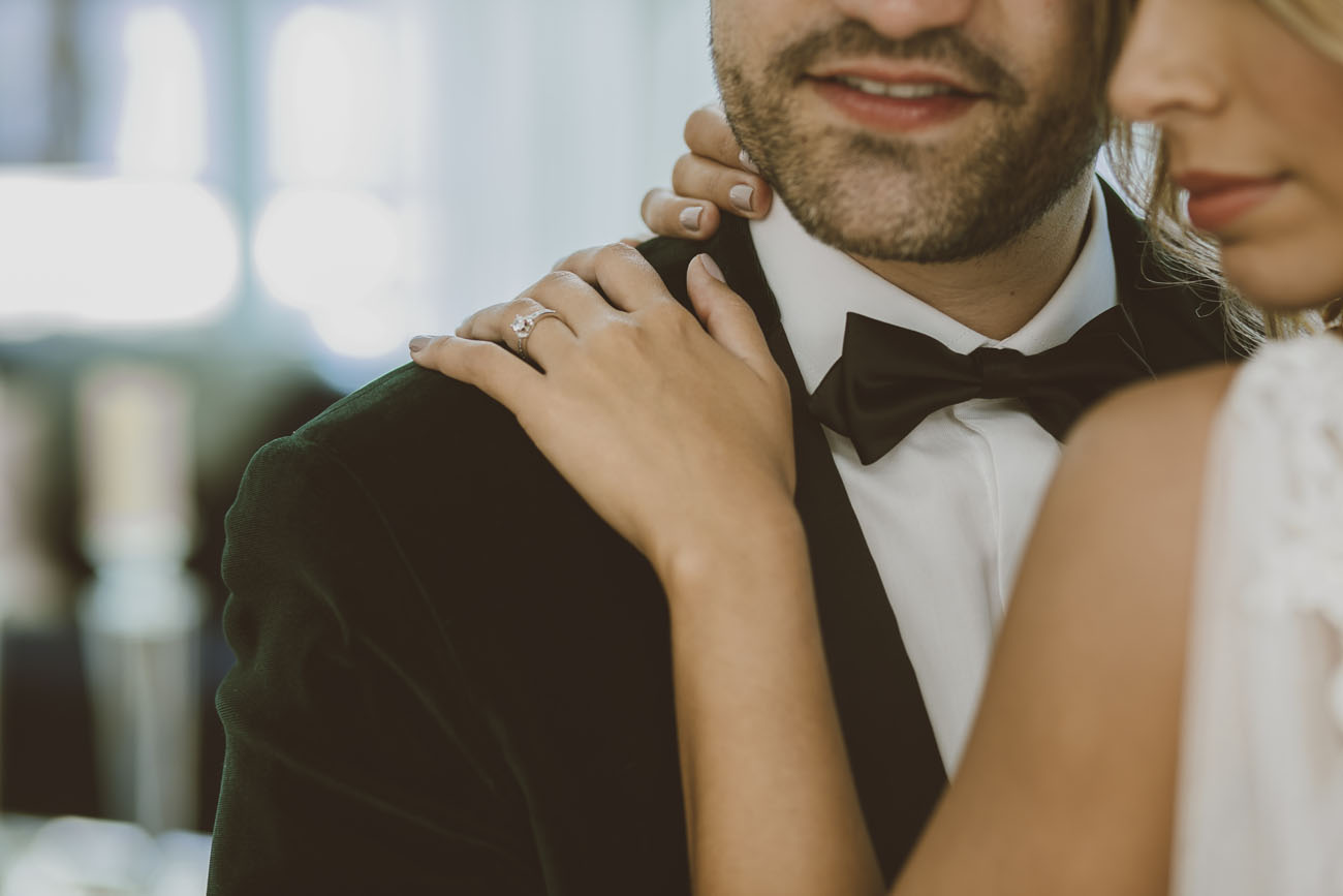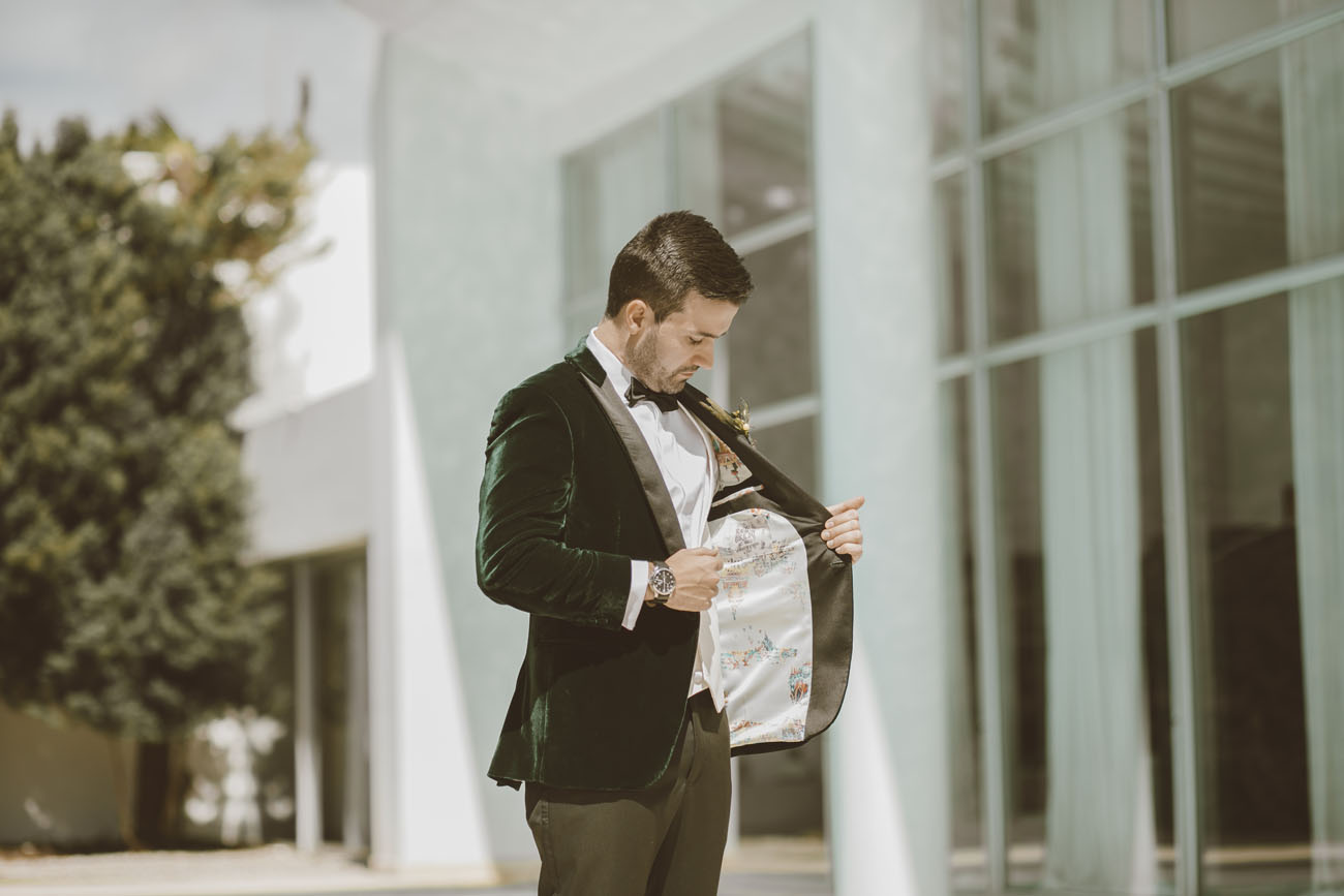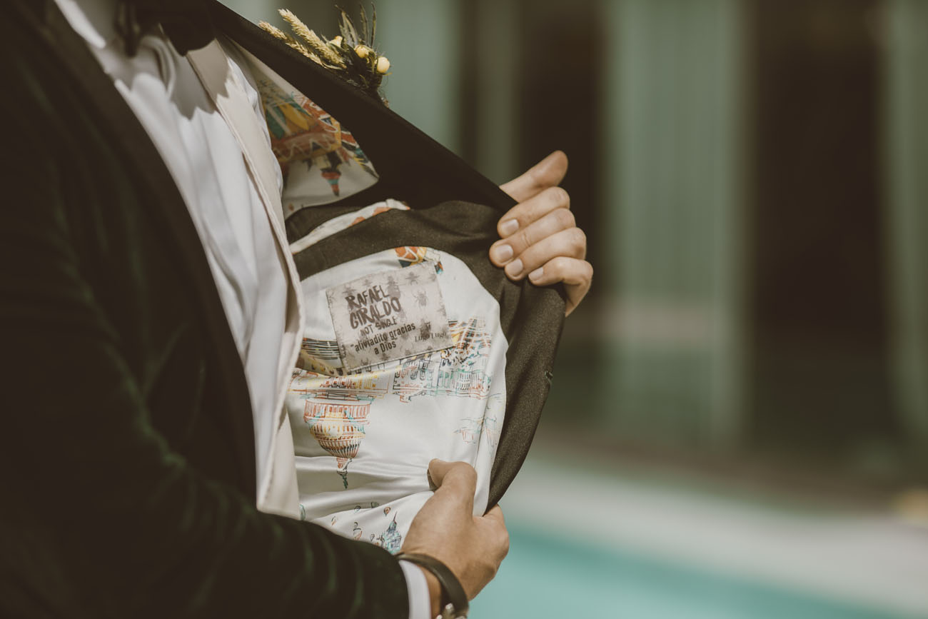 Con el traje de Rafael el turno fue para Lugó Lugó. Lo hicieron especial aquellos forros internos (del chaleco y del blazer) que los hermanos diseñadores personalizaron con una ilustración de los lugares a los que han viajado juntos Rafael y Melissa. Ese anhelo por volver tangibles los recuerdos se repite en ellos una y otra vez, como exigiéndole a la memoria que mantenga intactas las sensaciones que los conectan el uno al otro.