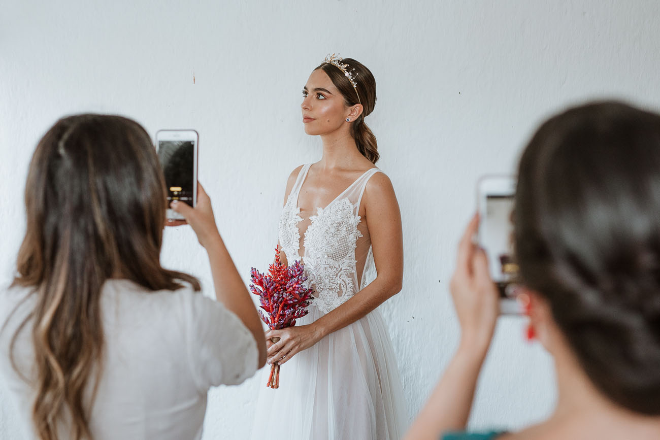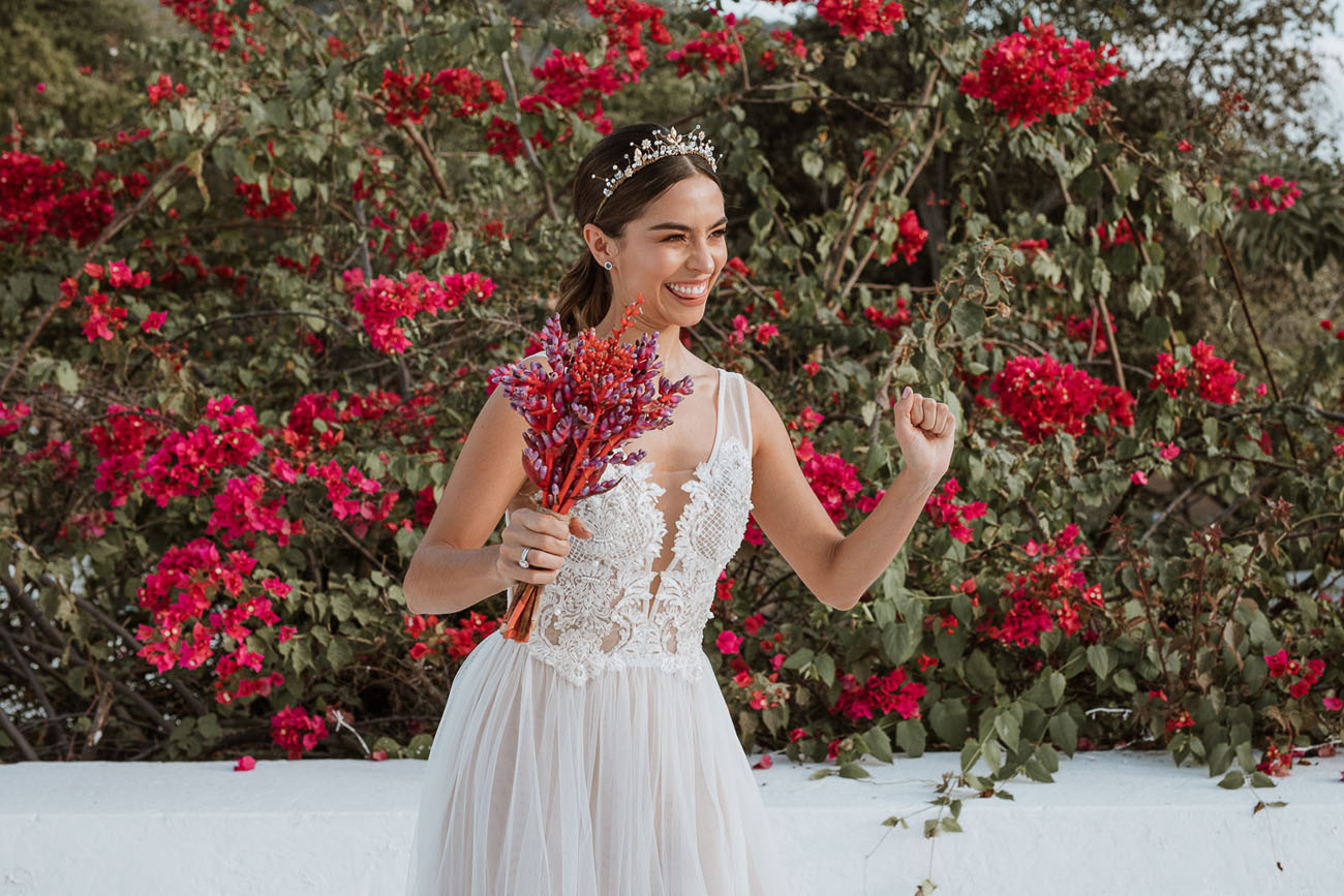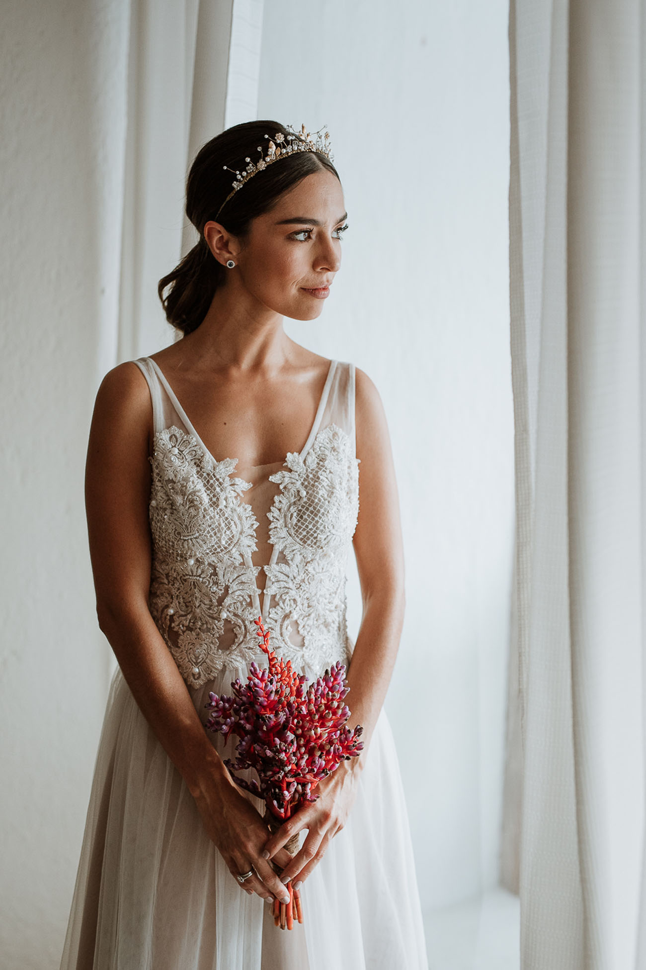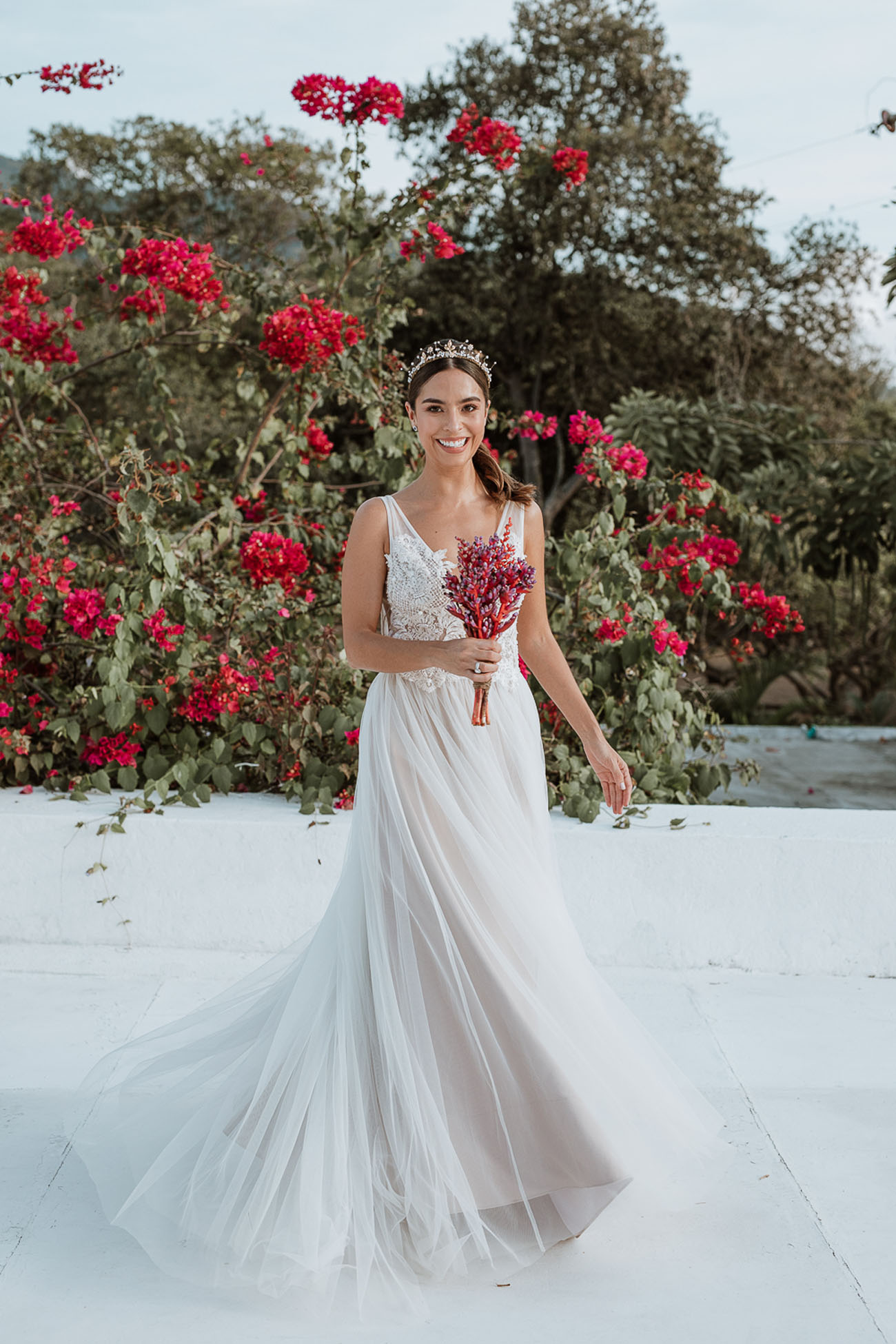 Un vestido fue el que se imaginó y otro el que eligió. Al principio se soñaba uno muy minimalista y blanco. Al final terminó con uno de tul, palo de rosa, de espalda destapada y muchos detalles en la parte superior. Agradeció haber ido a De Novia a Novia y encontrarse con Alejandra. Agradeció que ella la “obligara” a medirse ese vestido de Gina Murillo: ese vestido de “azúcar”, ese vestido perfecto, ese vestido para ella. Agradeció, haber podido conocer a la diseñadora en los días siguientes para que le hiciera algunos ajustes en su atelier de Bogotá. Se encontró con una persona dulce, alegre, generosa en su forma de ser; que la hizo sentir muy segura de que ese vestido, fresco y ligero, llevaba —además— la energía buena de quien lo cosió. Agradeció que no siempre lo que se imagina es lo que pasa, porque a veces hay sorpresas que vienen con la precisión justa.