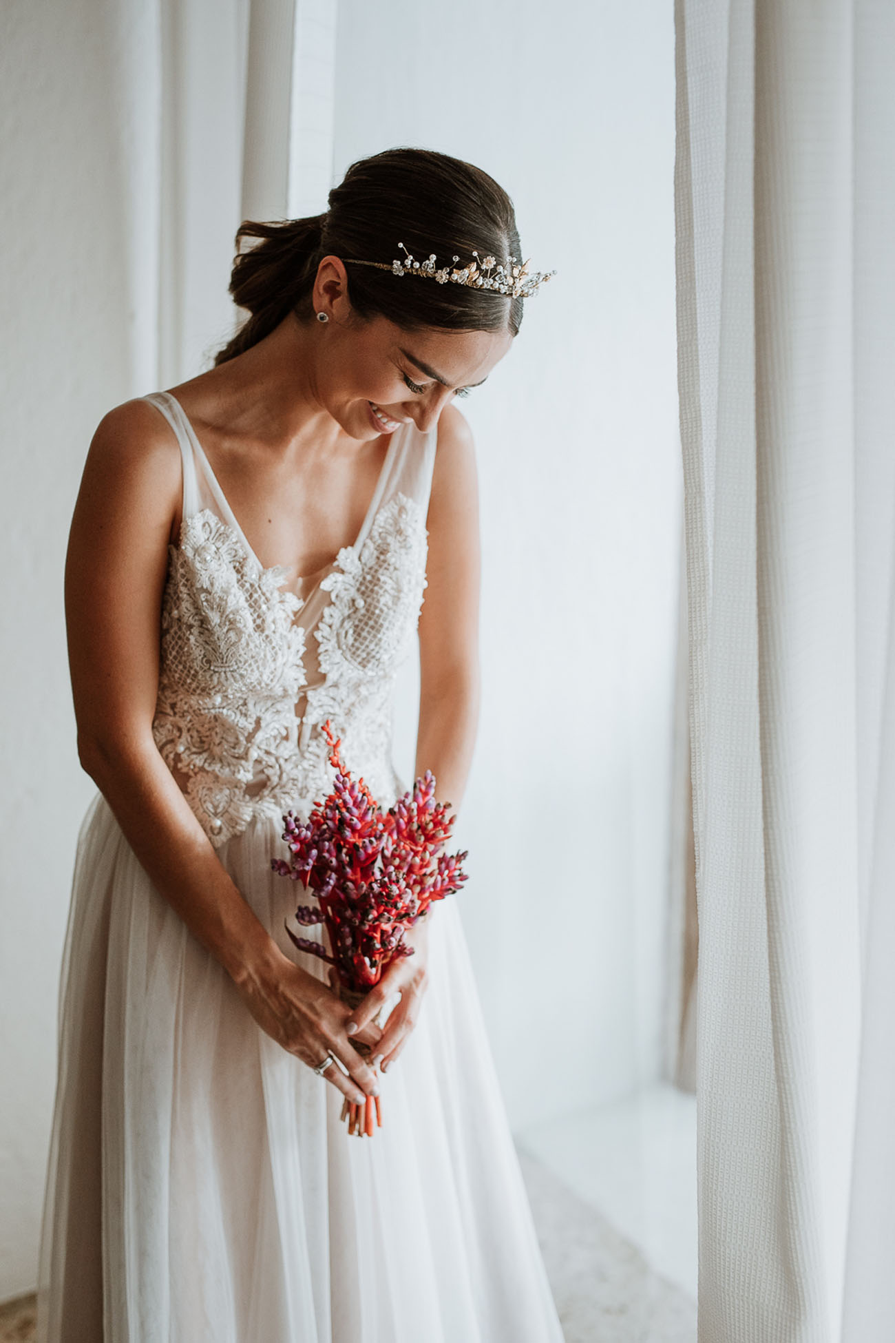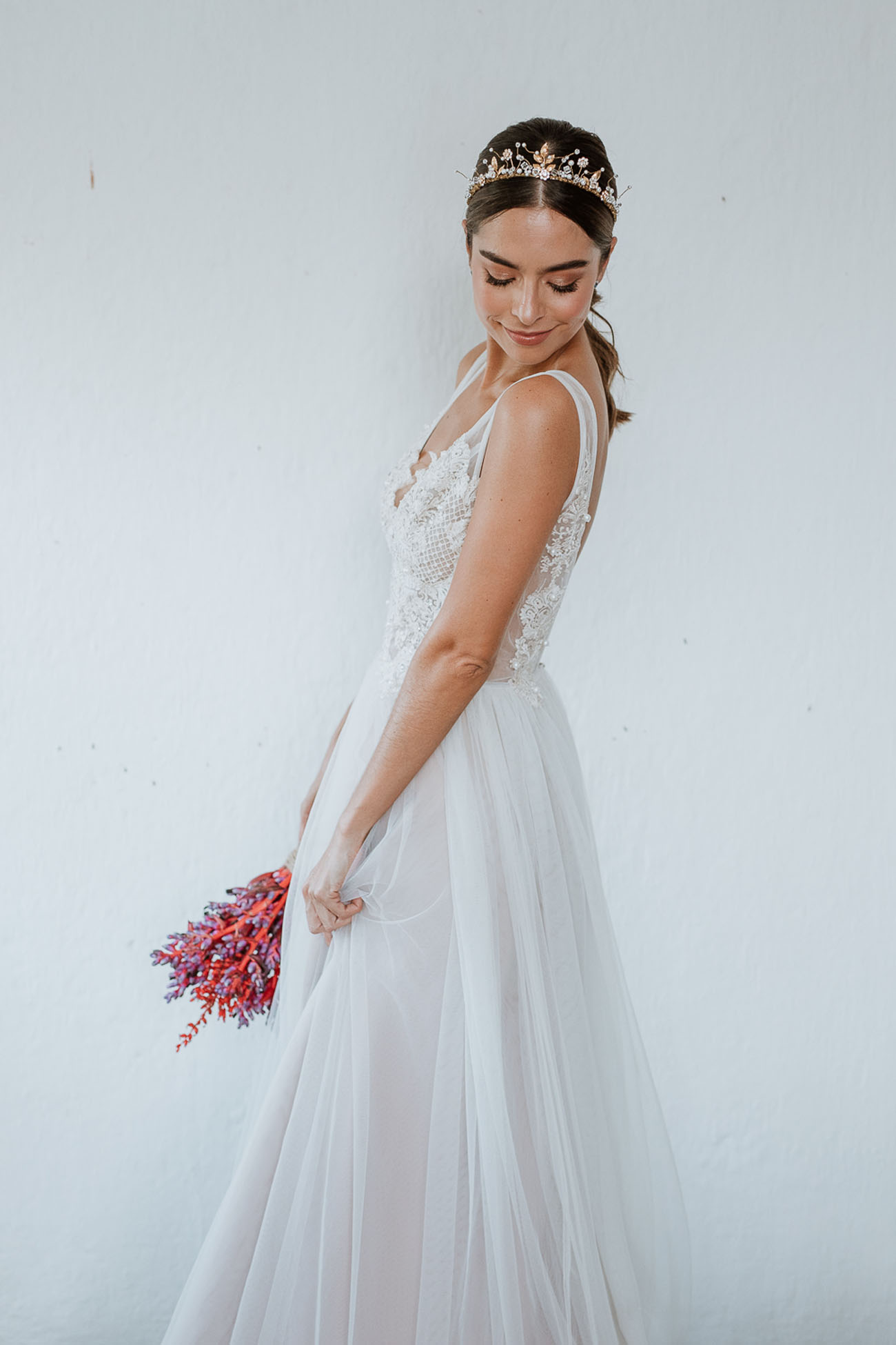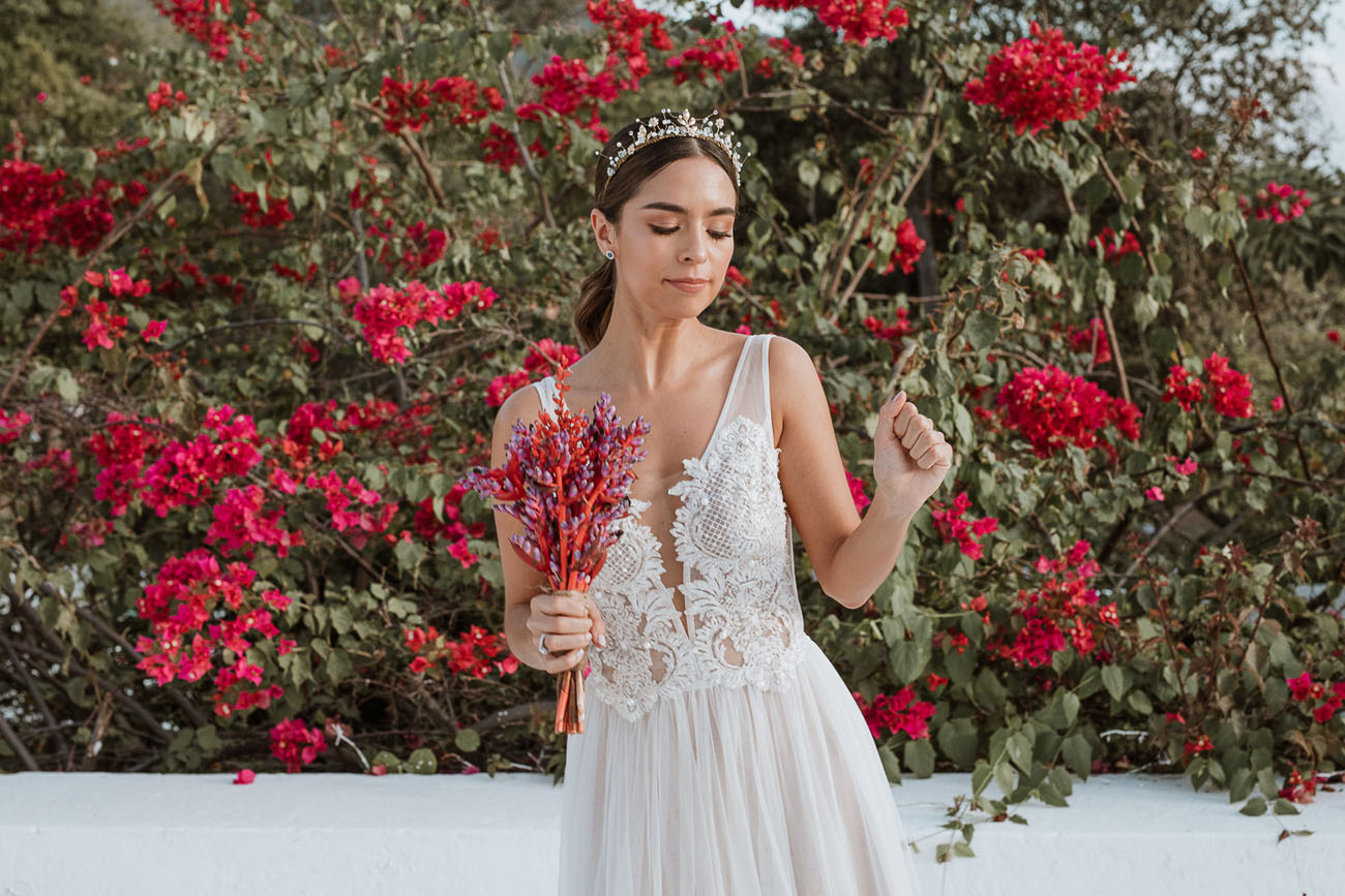 Un vestido fue el que se imaginó y otro el que eligió. Al principio se soñaba uno muy minimalista y blanco. Al final terminó con uno de tul, palo de rosa, de espalda destapada y muchos detalles en la parte superior. Agradeció haber ido a De Novia a Novia y encontrarse con Alejandra. Agradeció que ella la “obligara” a medirse ese vestido de Gina Murillo: ese vestido de “azúcar”, ese vestido perfecto, ese vestido para ella. Agradeció, haber podido conocer a la diseñadora en los días siguientes para que le hiciera algunos ajustes en su atelier de Bogotá. Se encontró con una persona dulce, alegre, generosa en su forma de ser; que la hizo sentir muy segura de que ese vestido, fresco y ligero, llevaba —además— la energía buena de quien lo cosió. Agradeció que no siempre lo que se imagina es lo que pasa, porque a veces hay sorpresas que vienen con la precisión justa.