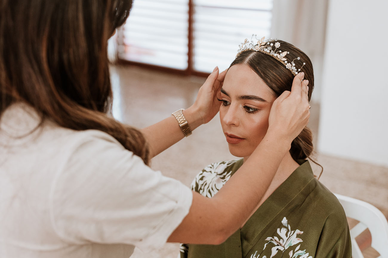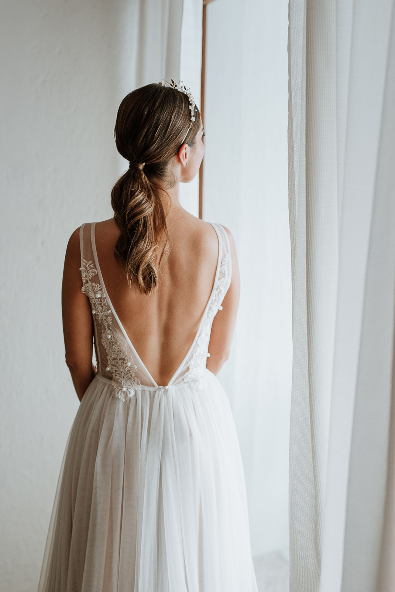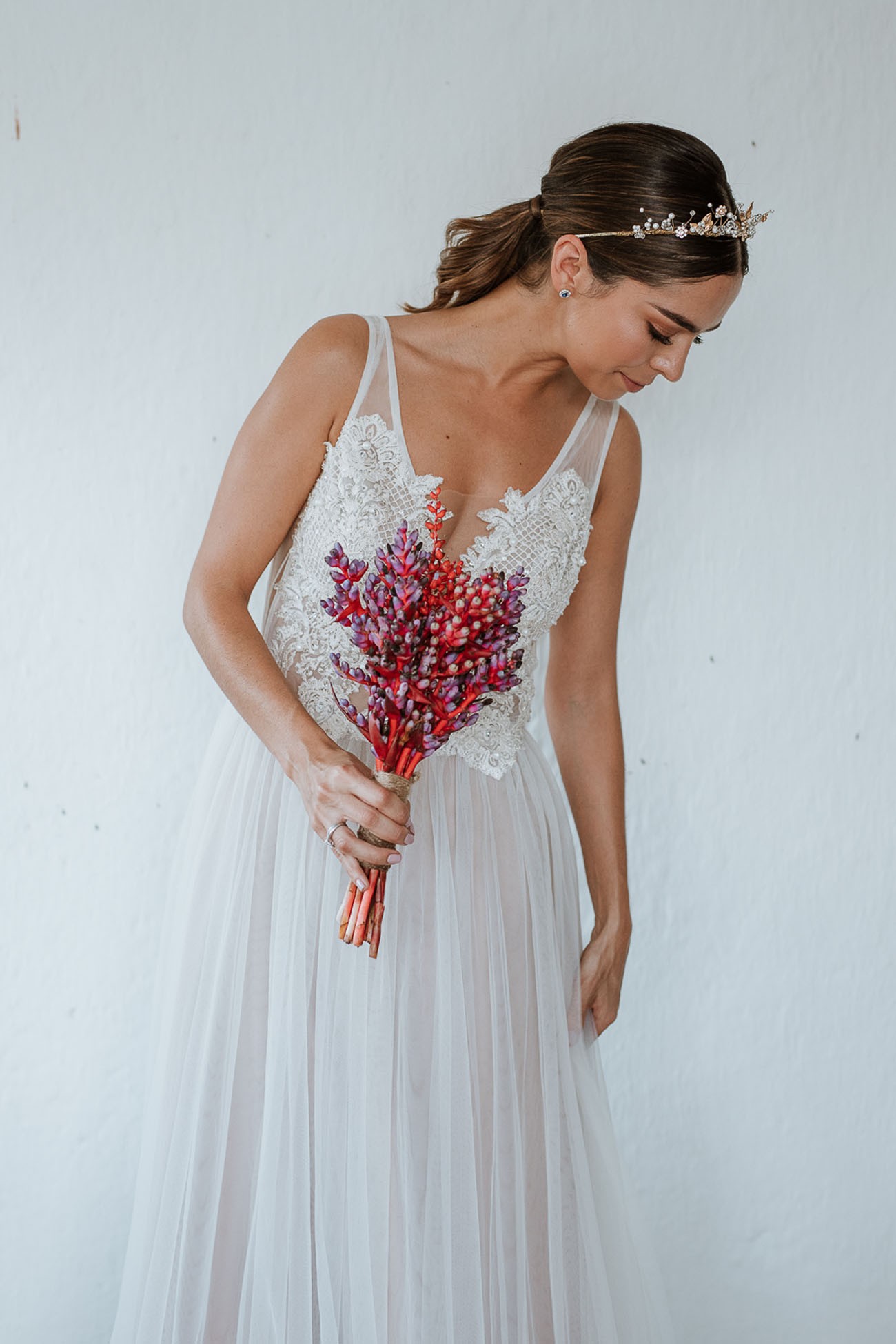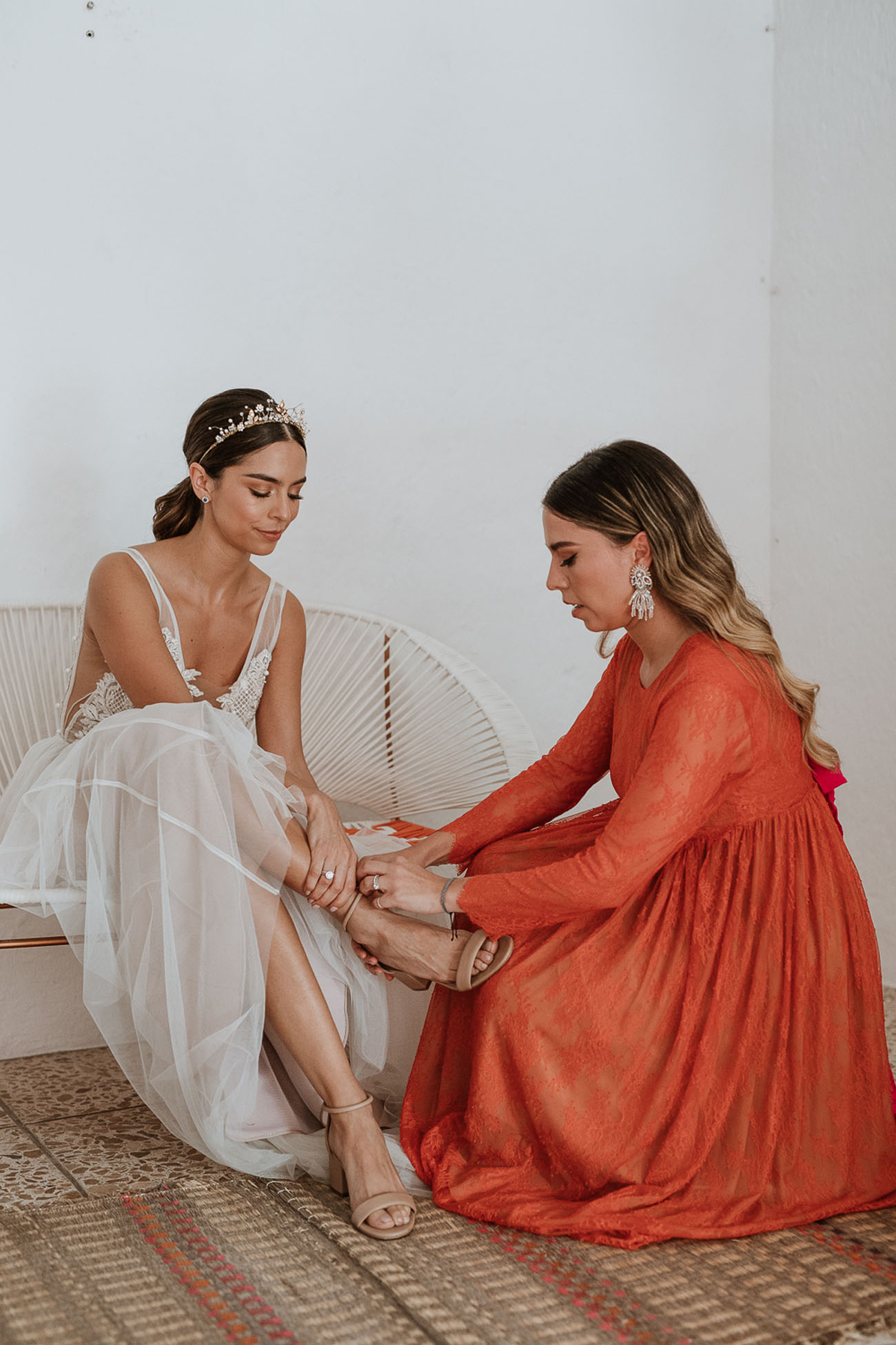 Un vestido fue el que se imaginó y otro el que eligió. Al principio se soñaba uno muy minimalista y blanco. Al final terminó con uno de tul, palo de rosa, de espalda destapada y muchos detalles en la parte superior. Agradeció haber ido a De Novia a Novia y encontrarse con Alejandra. Agradeció que ella la “obligara” a medirse ese vestido de Gina Murillo: ese vestido de “azúcar”, ese vestido perfecto, ese vestido para ella. Agradeció, haber podido conocer a la diseñadora en los días siguientes para que le hiciera algunos ajustes en su atelier de Bogotá. Se encontró con una persona dulce, alegre, generosa en su forma de ser; que la hizo sentir muy segura de que ese vestido, fresco y ligero, llevaba —además— la energía buena de quien lo cosió. Agradeció que no siempre lo que se imagina es lo que pasa, porque a veces hay sorpresas que vienen con la precisión justa.