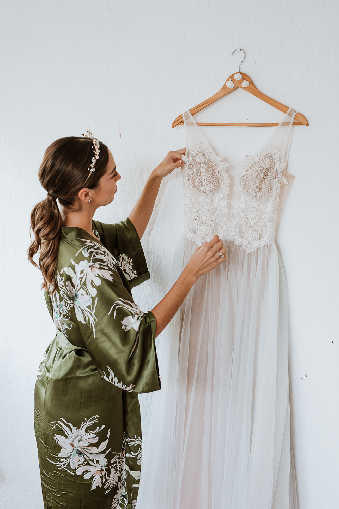 Un vestido fue el que se imaginó y otro el que eligió. Al principio se soñaba uno muy minimalista y blanco. Al final terminó con uno de tul, palo de rosa, de espalda destapada y muchos detalles en la parte superior