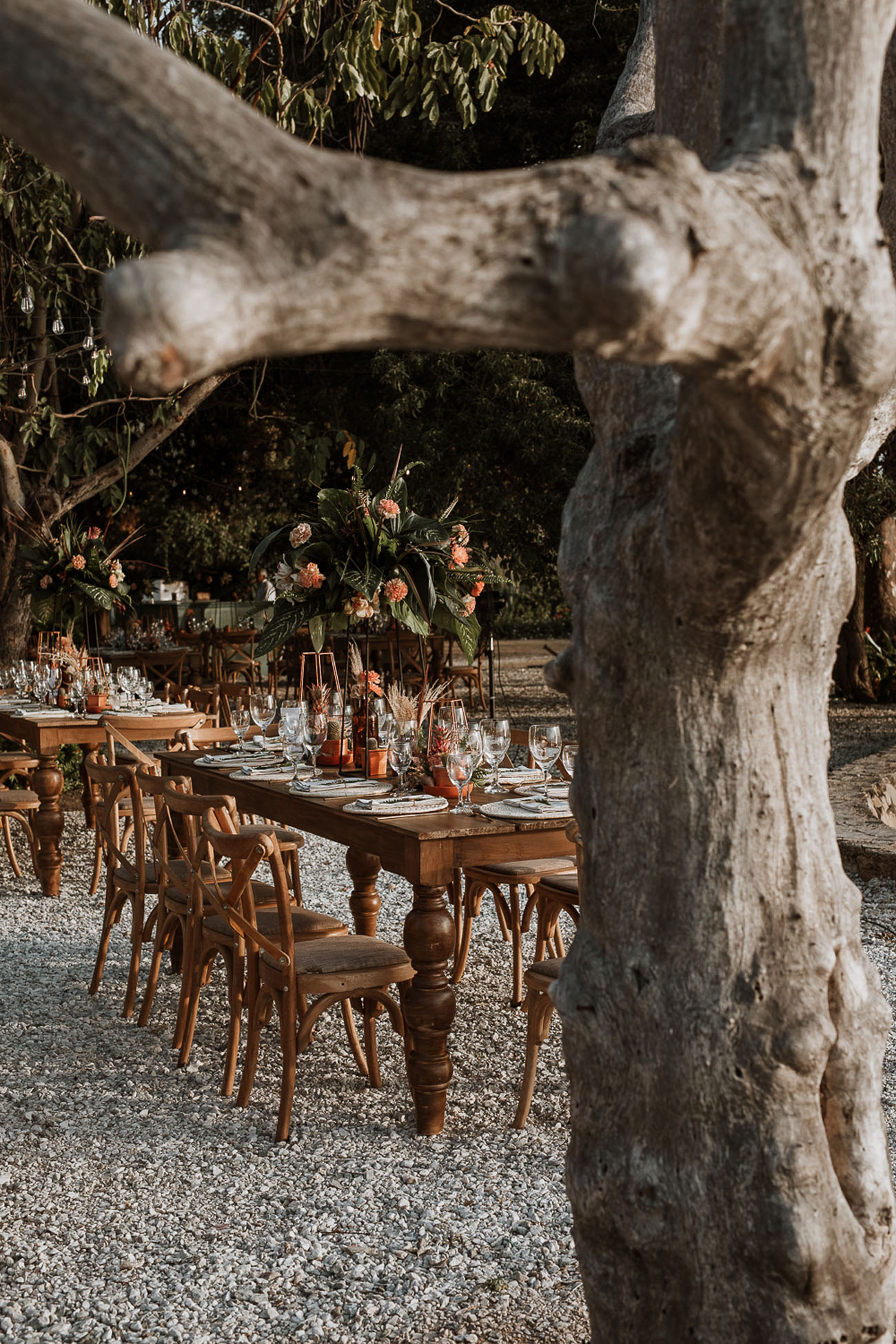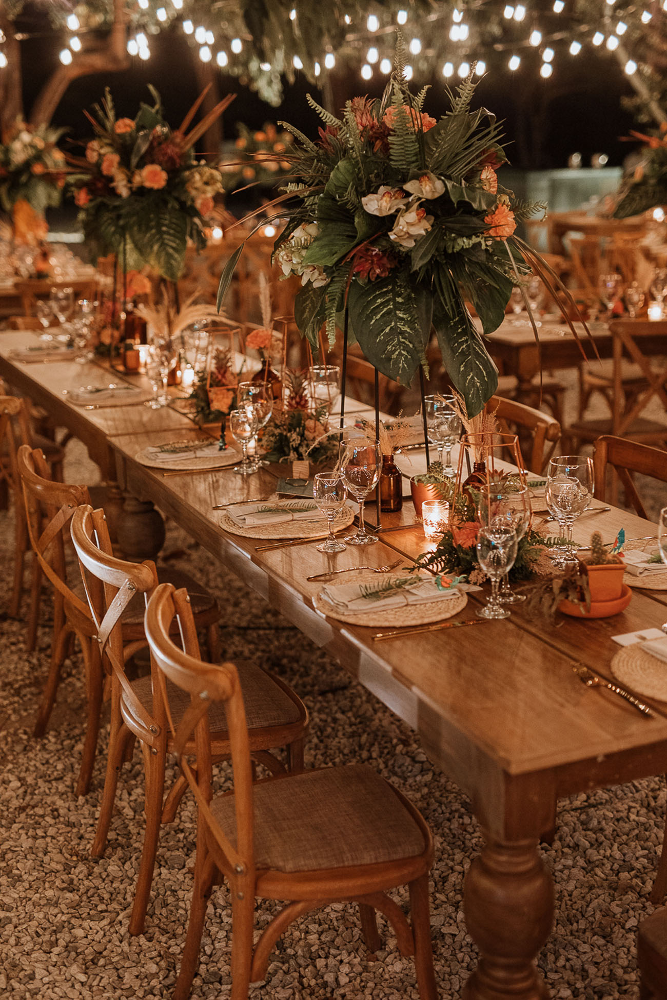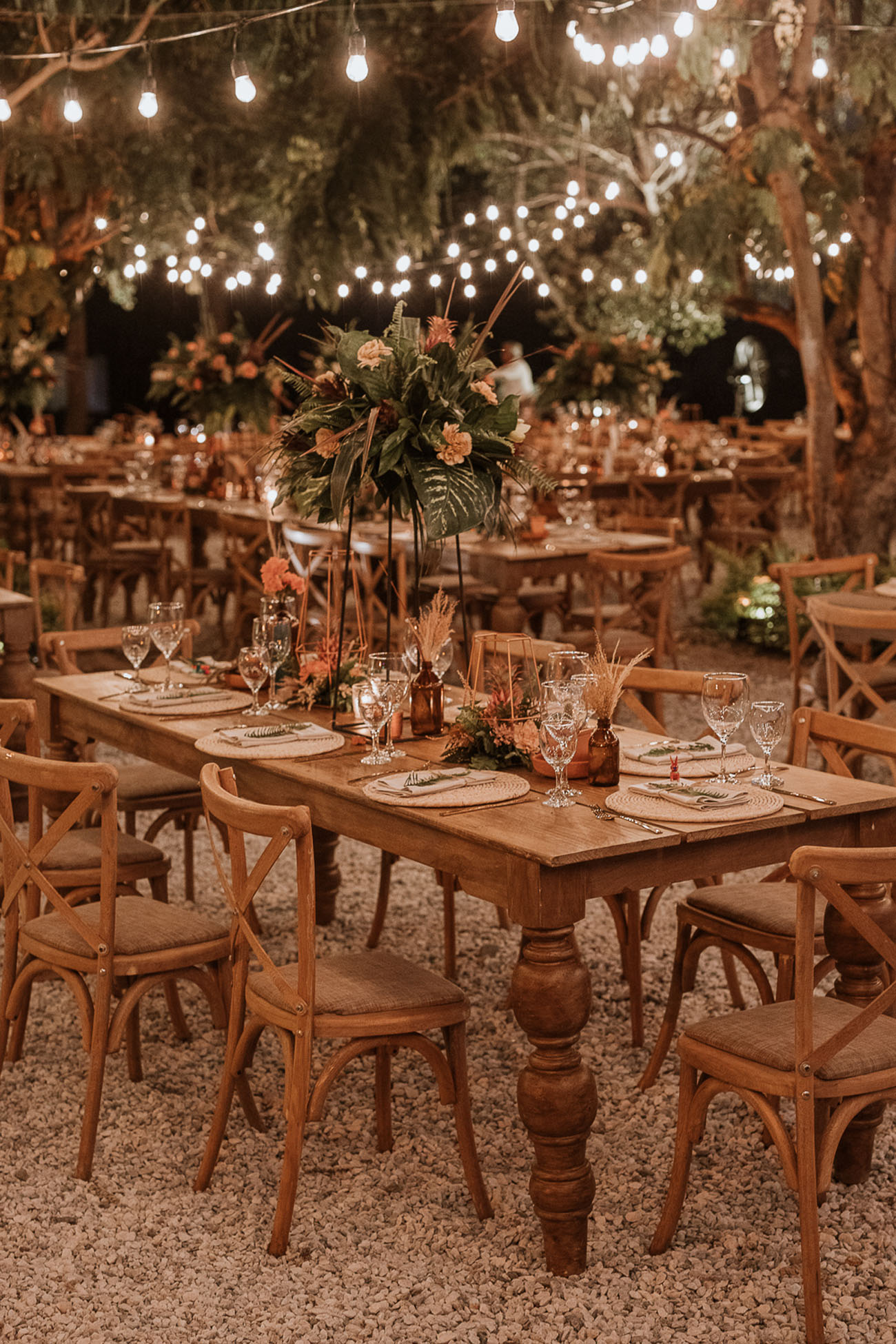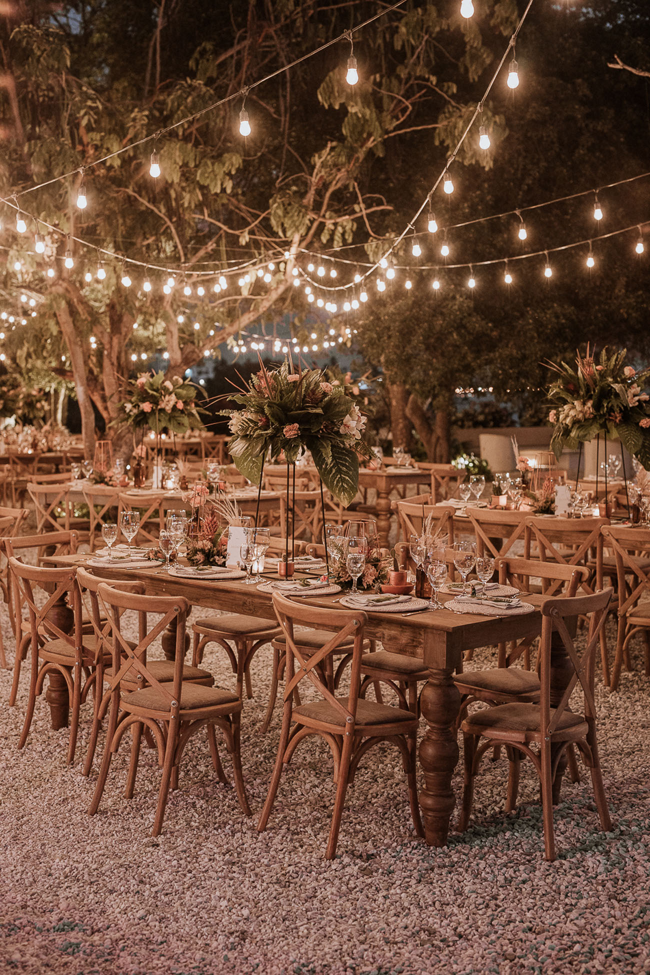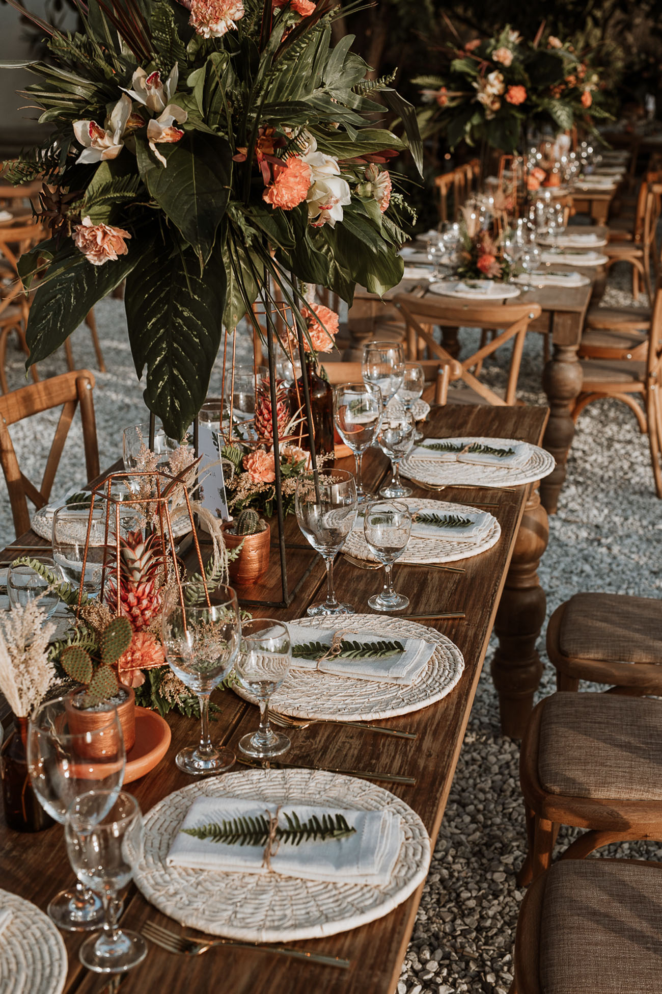 Quisieron un ambiente tropical, que narrara la belleza folclórica de Colombia, que le permitiera a esa playa, ese mar y ese cielo lucir su naturaleza acaparadora y voraz. Los tonos verdes y cobres los contrastaron con los colores de las frutas. A eso le sumaron un mobiliario en madera, individuales artesanales, follaje, mini materas en barro y muchos bombillitos que atravesaban los árboles. El atardecer de ese día supo sacar sus mejores combinaciones; desde ocres y naranjas hasta violetas y azules, como queriendo hacer parte de esa luz nostálgica del caribe, de esa energía mística que guardan los amores que no se apagan con el tiempo.