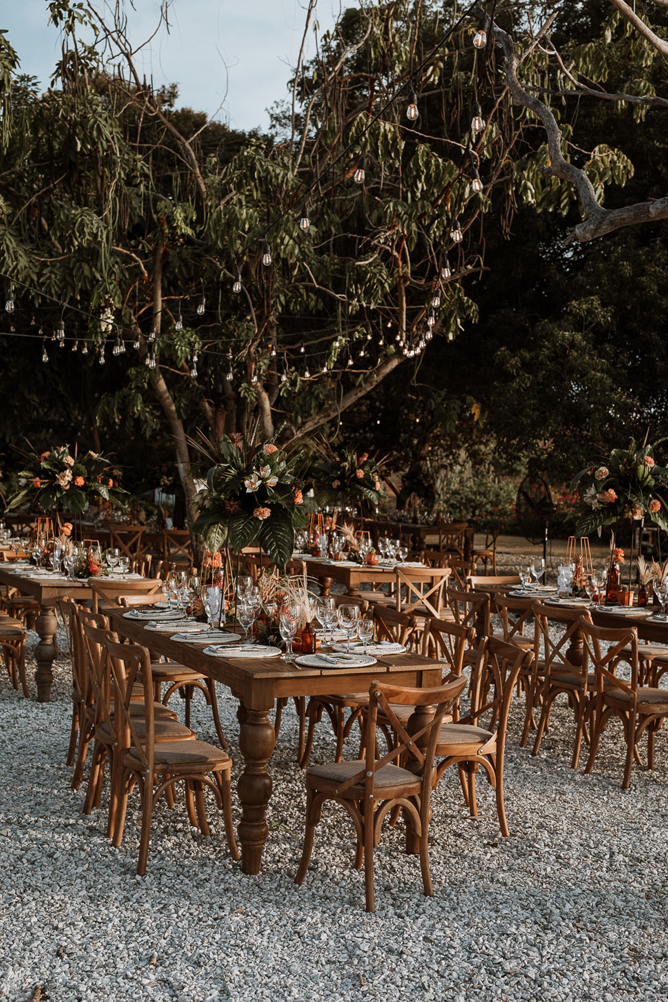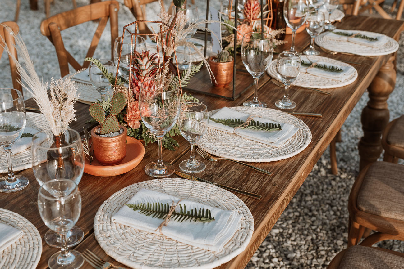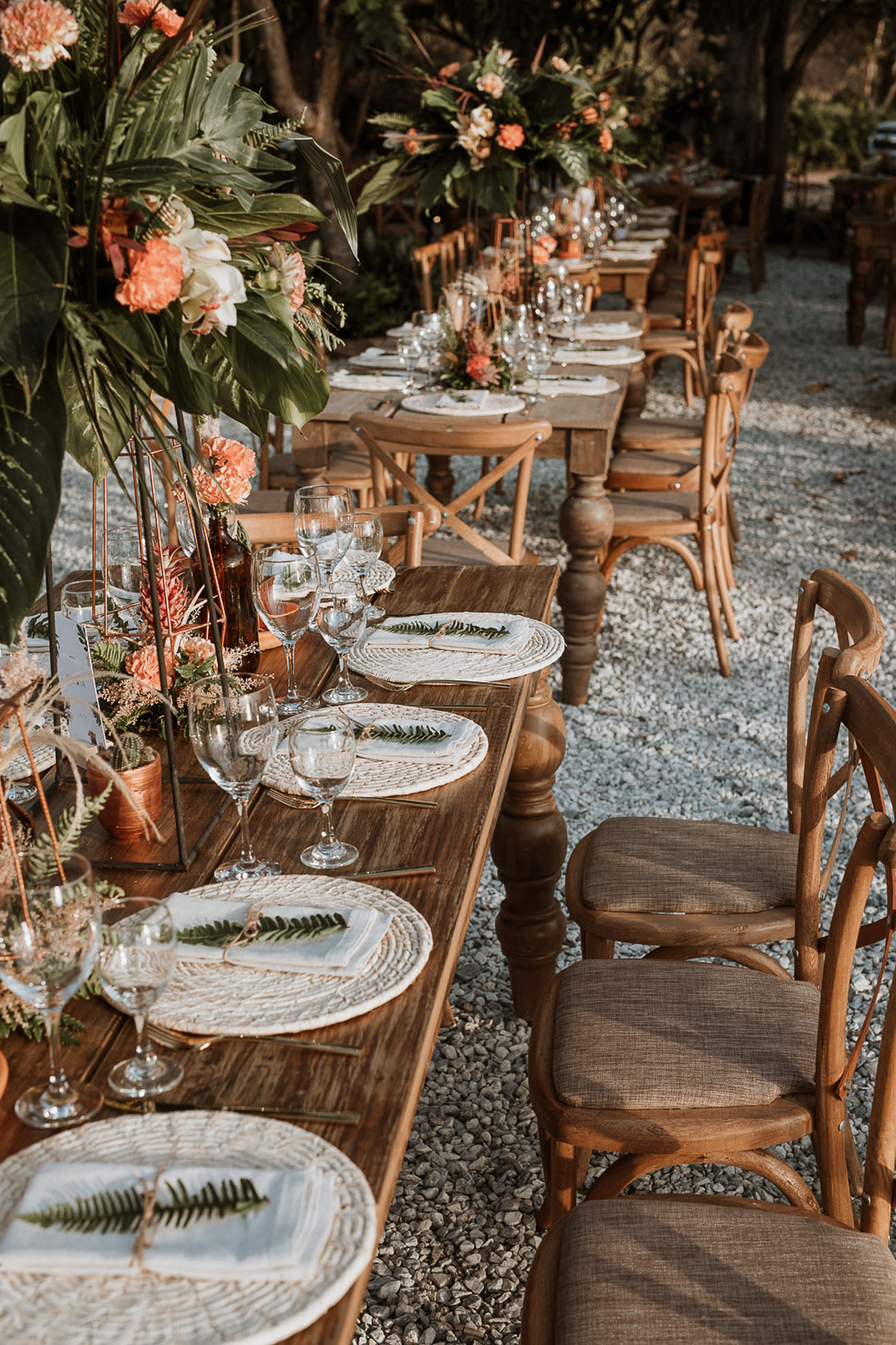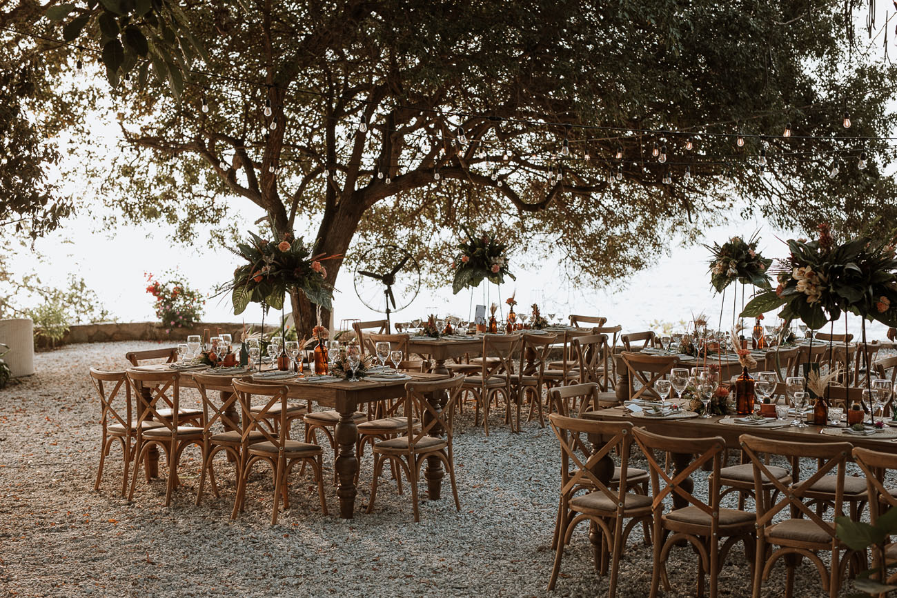 Quisieron un ambiente tropical, que narrara la belleza folclórica de Colombia, que le permitiera a esa playa, ese mar y ese cielo lucir su naturaleza acaparadora y voraz. Los tonos verdes y cobres los contrastaron con los colores de las frutas. A eso le sumaron un mobiliario en madera, individuales artesanales, follaje, mini materas en barro y muchos bombillitos que atravesaban los árboles. El atardecer de ese día supo sacar sus mejores combinaciones; desde ocres y naranjas hasta violetas y azules, como queriendo hacer parte de esa luz nostálgica del caribe, de esa energía mística que guardan los amores que no se apagan con el tiempo.