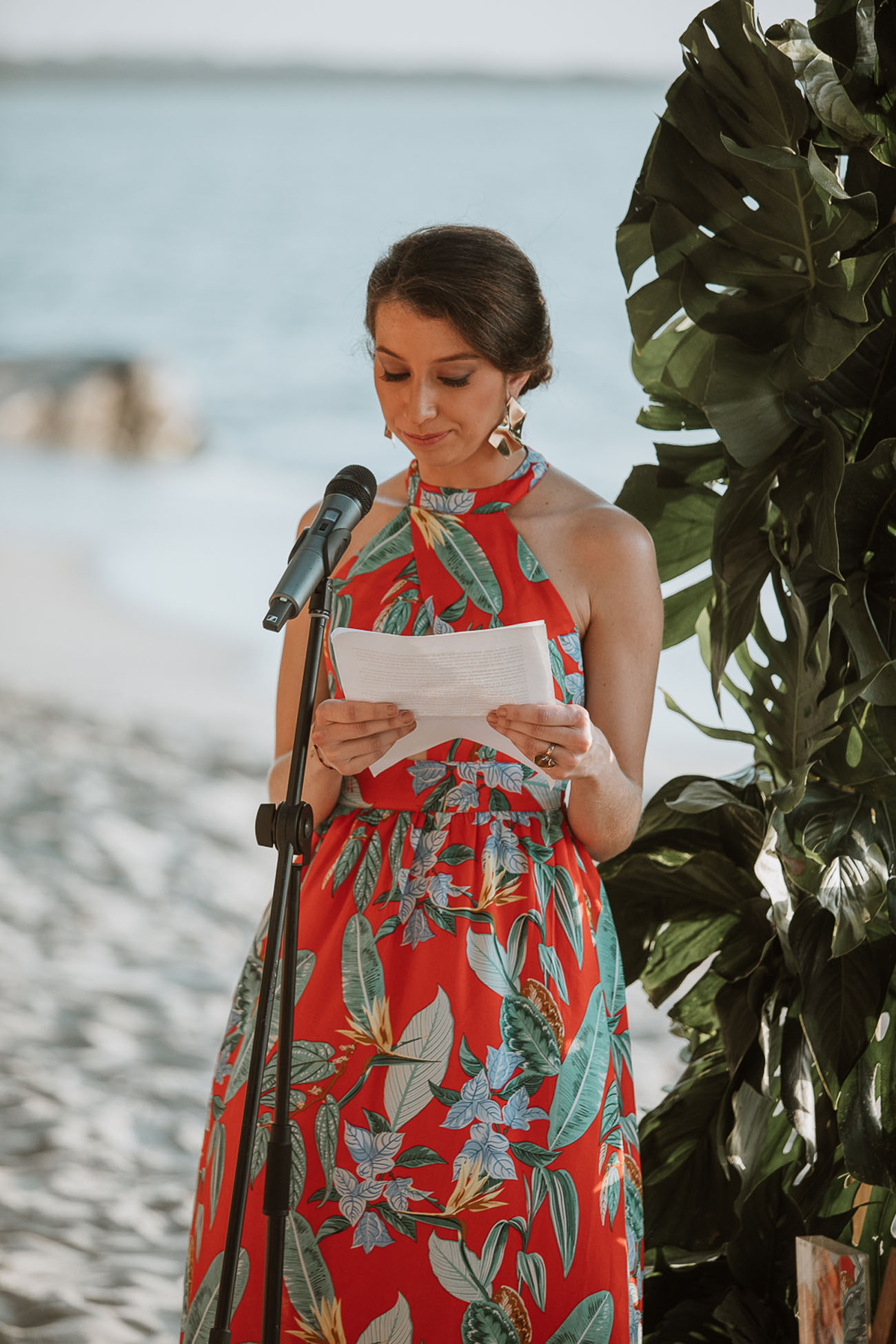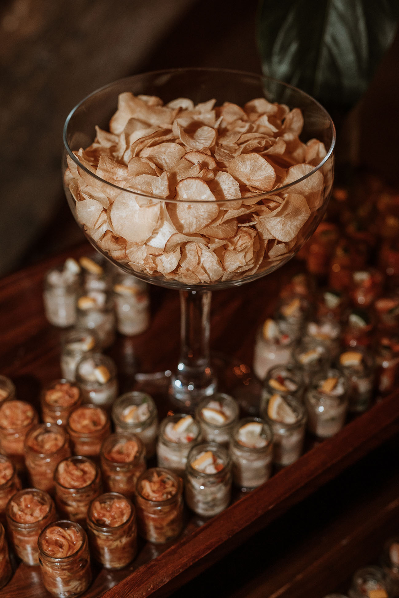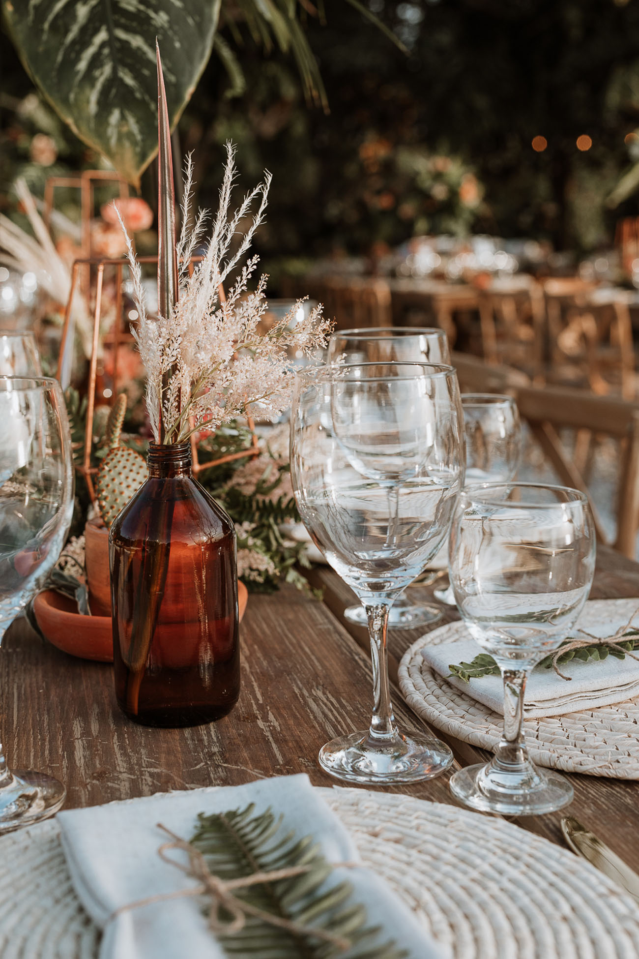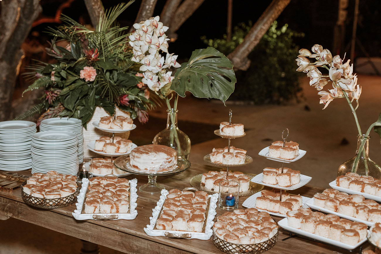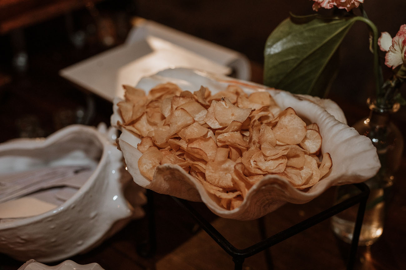 Quisieron un ambiente tropical, que narrara la belleza folclórica de Colombia, que le permitiera a esa playa, ese mar y ese cielo lucir su naturaleza acaparadora y voraz. Los tonos verdes y cobres los contrastaron con los colores de las frutas. A eso le sumaron un mobiliario en madera, individuales artesanales, follaje, mini materas en barro y muchos bombillitos que atravesaban los árboles. El atardecer de ese día supo sacar sus mejores combinaciones; desde ocres y naranjas hasta violetas y azules, como queriendo hacer parte de esa luz nostálgica del caribe, de esa energía mística que guardan los amores que no se apagan con el tiempo.