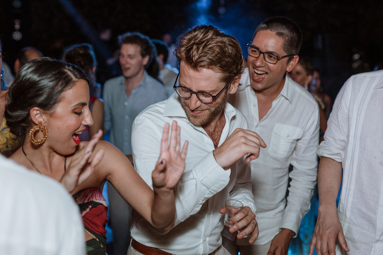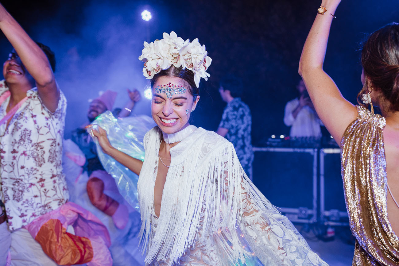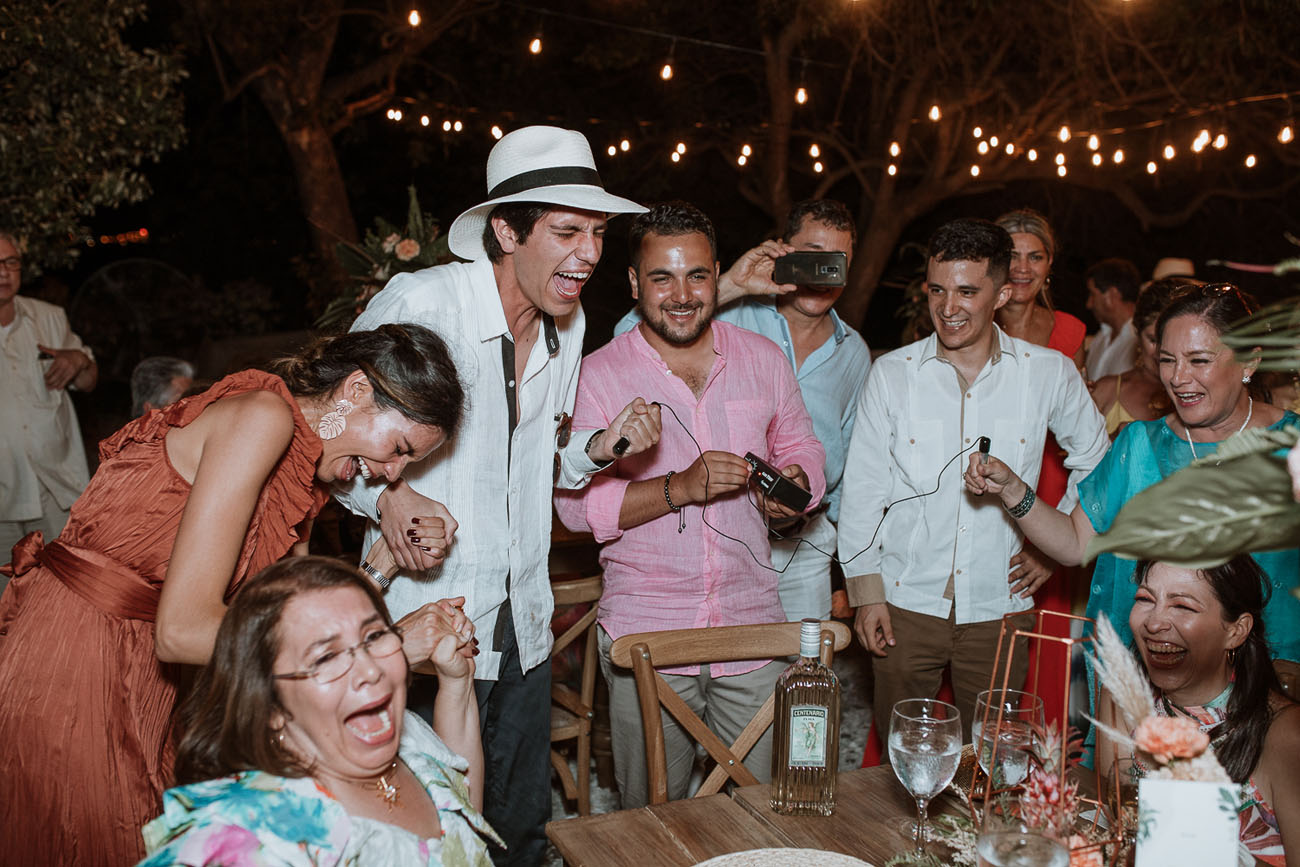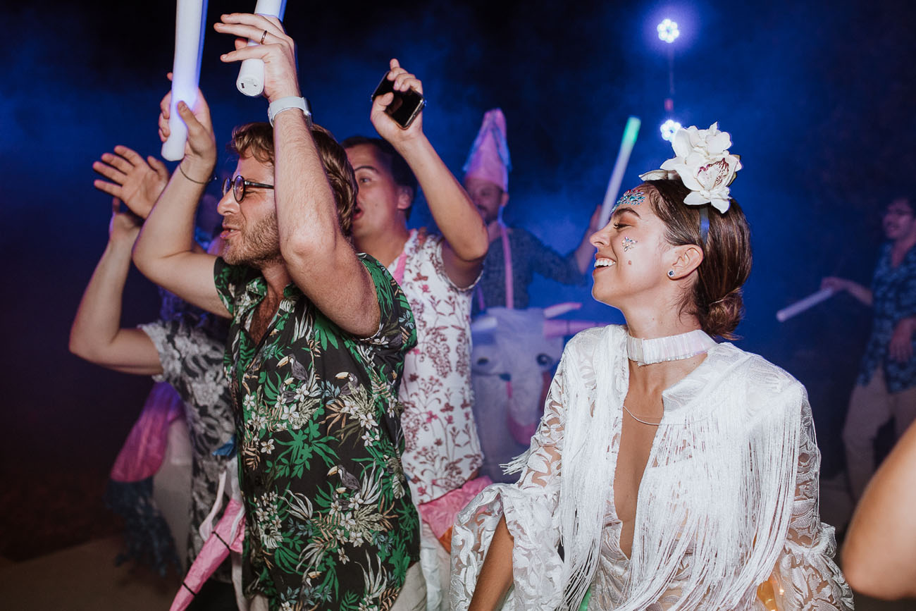 Y entonces, después de algunas lágrimas, después de hacerse saber que a pesar de todo y de tanto, estarán en los adentros, después de que la música supiera ser antesala de abrazos, desorden de tripas y amante de dicha, llegó la fiesta. Con playa y con mar, de nuevo, con Alejandro Forero como dj, con baile, con brindis, con risas… y cuando todo era eso, una maraña de alegría, llegó el momento inolvidable, el show, la energía, la cúspide: se apagaron las luces y la música y, de pronto, salieron Paula (con unas alas de colores y luces y un vestido más fresco de flequillos) y José mientras de fondo sonaba Vibras, de JBalvin. Hubo humo, pólvora y palos con luces. De fondo siguió sonando JBalvin, esta vez con Mi gente, que fue la chispa final para que nadie parara de bailar, cantar, sonreír. Hubo disfraces de unicornios inflables y cristales para decorar la cara. El sueño de José, una hora loca de verdad estaba sucediendo, sucedió.