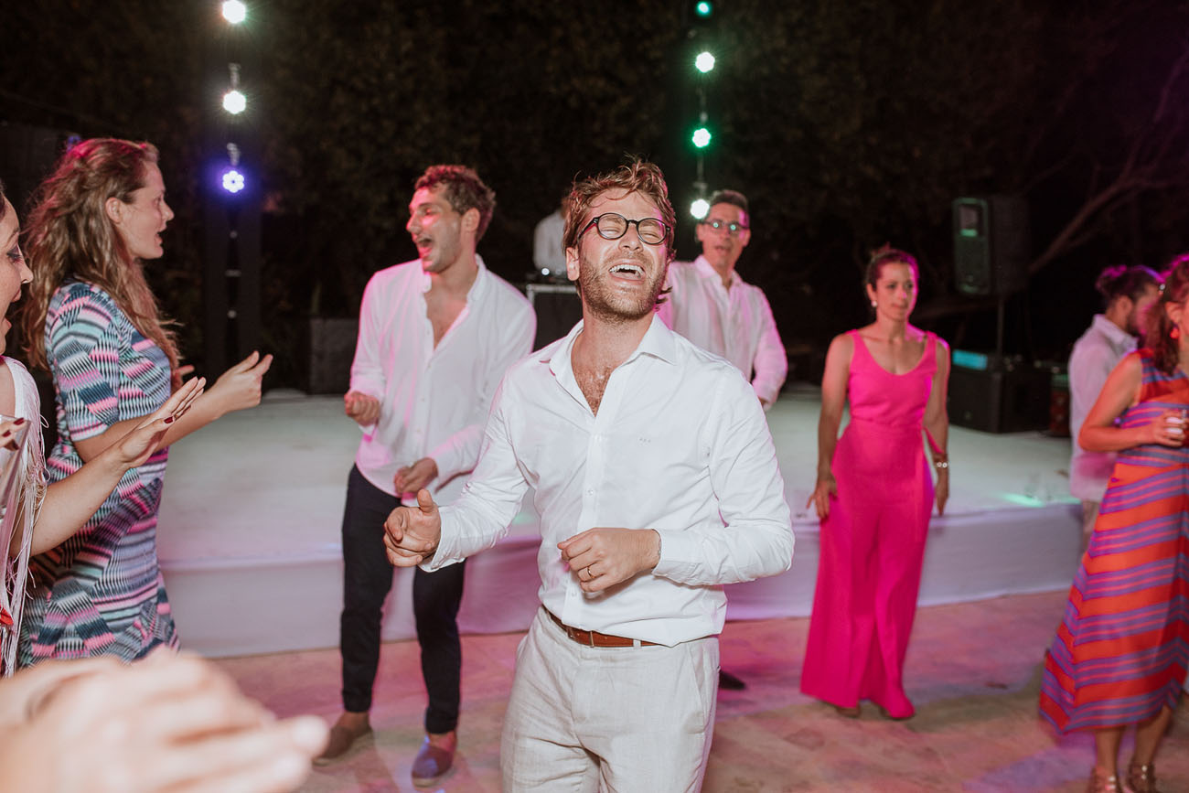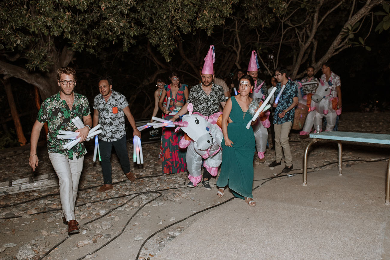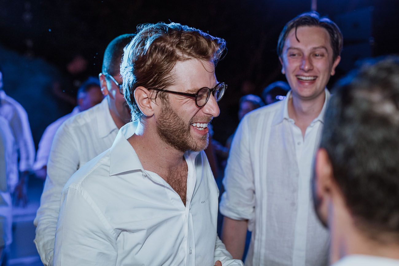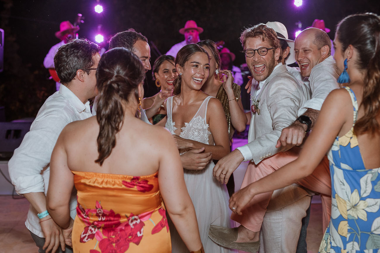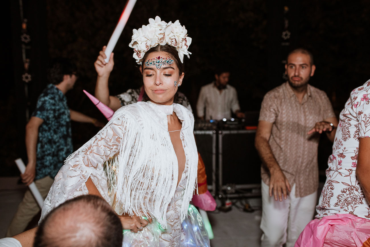 Y entonces, después de algunas lágrimas, después de hacerse saber que a pesar de todo y de tanto, estarán en los adentros, después de que la música supiera ser antesala de abrazos, desorden de tripas y amante de dicha, llegó la fiesta. Con playa y con mar, de nuevo, con Alejandro Forero como dj, con baile, con brindis, con risas… y cuando todo era eso, una maraña de alegría, llegó el momento inolvidable, el show, la energía, la cúspide: se apagaron las luces y la música y, de pronto, salieron Paula (con unas alas de colores y luces y un vestido más fresco de flequillos) y José mientras de fondo sonaba Vibras, de JBalvin. Hubo humo, pólvora y palos con luces. De fondo siguió sonando JBalvin, esta vez con Mi gente, que fue la chispa final para que nadie parara de bailar, cantar, sonreír. Hubo disfraces de unicornios inflables y cristales para decorar la cara. El sueño de José, una hora loca de verdad estaba sucediendo, sucedió.