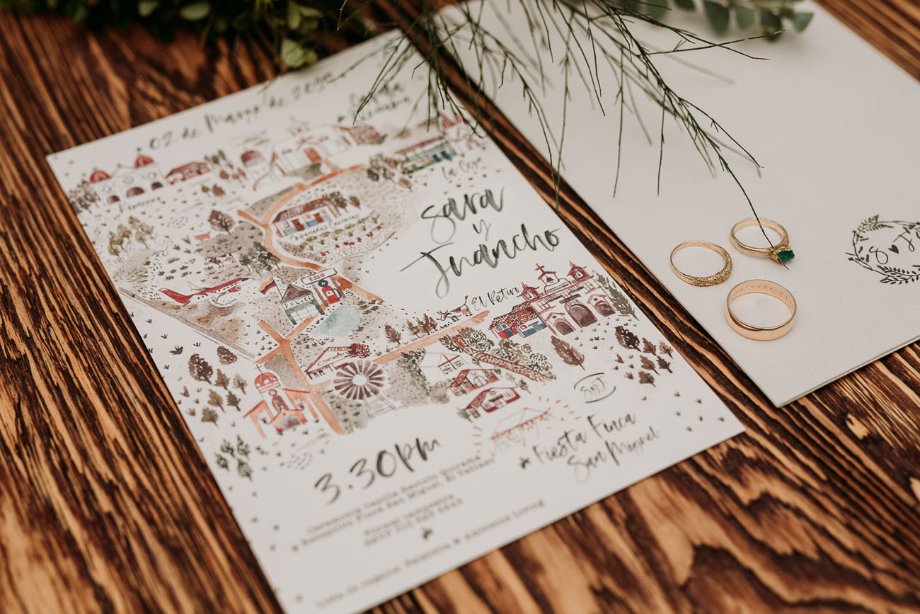 Las invitaciones fueron ilustraciones en acuarela de Valeria Montoya, de Más que tinta taller. El resultado: una obra de arte, un pequeño cuadro con el paisaje de un pueblito, una ilustración autóctona y detallada
