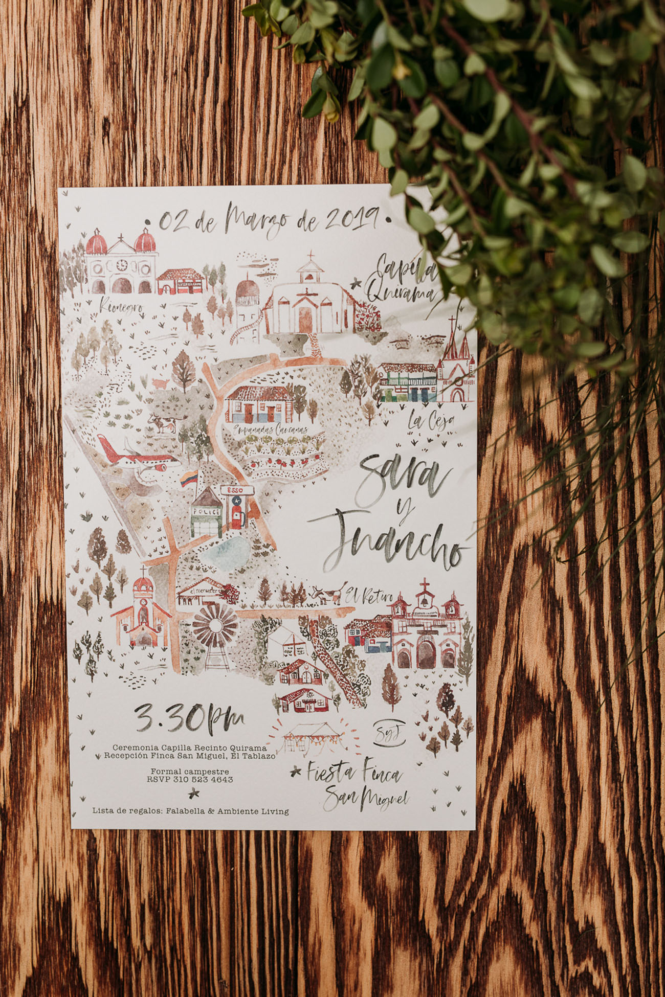 El reto, entonces, para Valeria era ilustrar un mapa desde Quirama (donde fue la ceremonia) hasta la finca. Les gustó tanto que contrario a enviarlas digitalmente (como pensaban hacerlo), las imprimieron. El resultado final es una obra de arte, un pequeño cuadro con el paisaje de un pueblito, una ilustración autóctona y detallada.