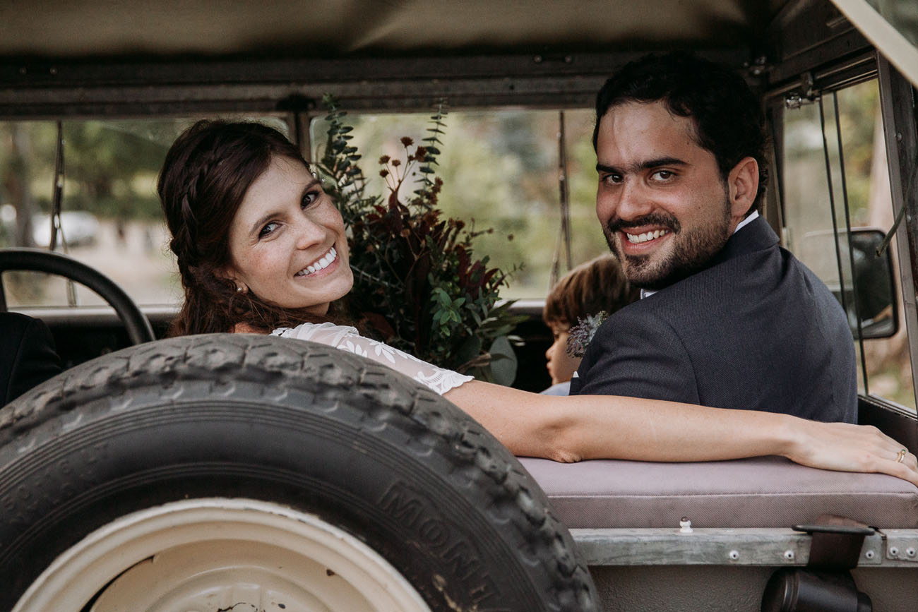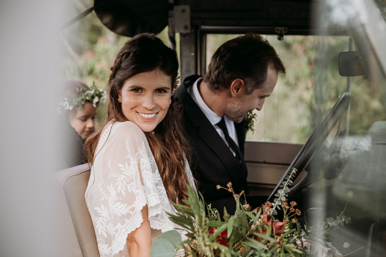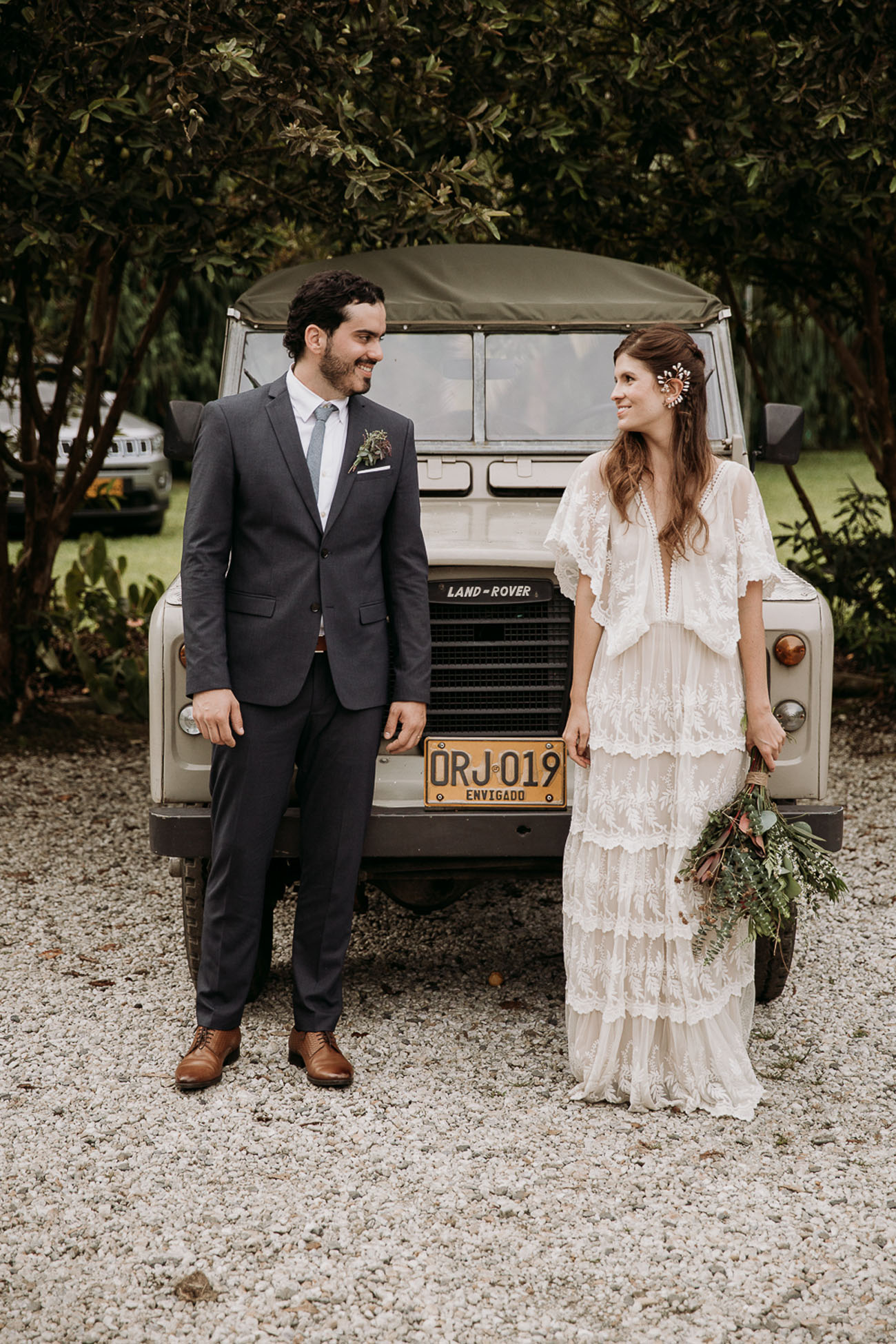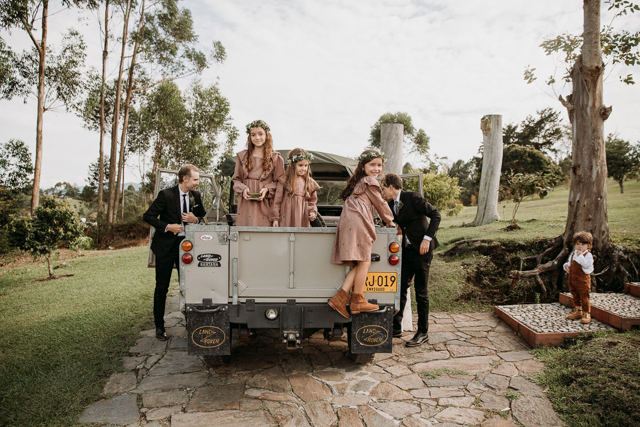 Se montaron en un Land Rover con volco. Atrás iban los cinco pajecitos, todos sobrinos de Juancho que, por cierto, fueron el hit de toda la ceremonia. Y con razón: sus looks bohemios y auténticos cautivaron.