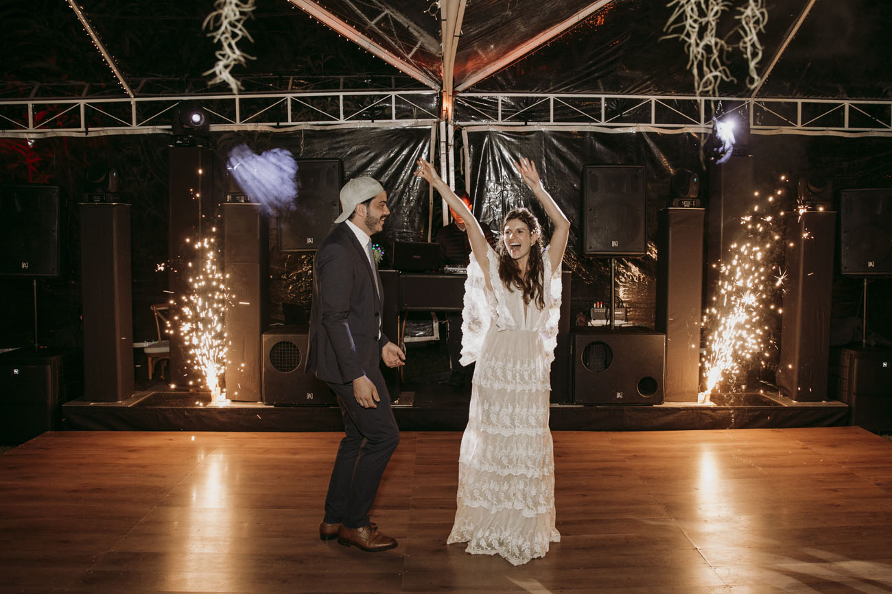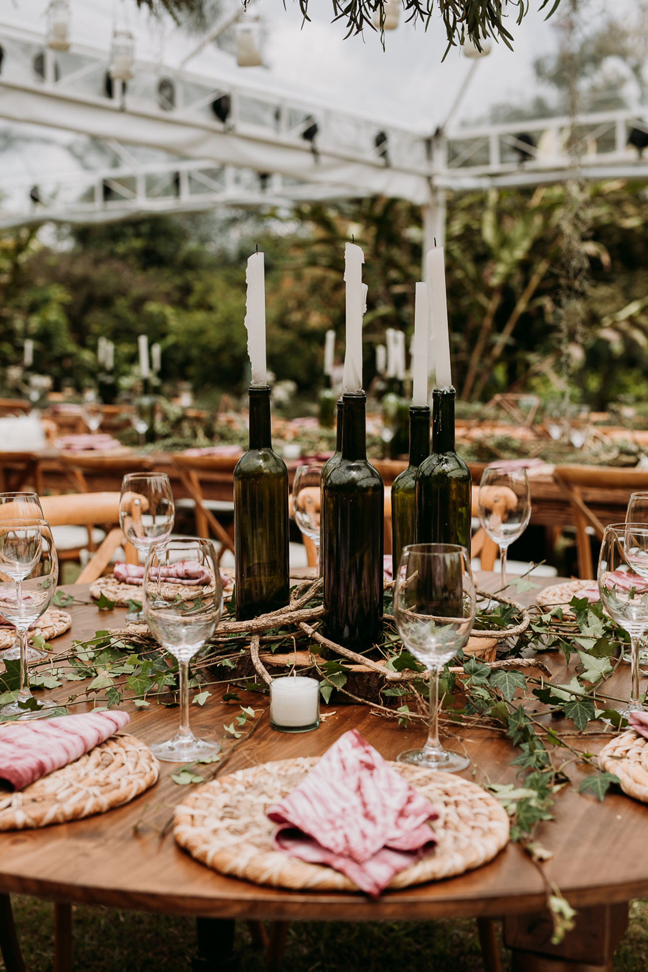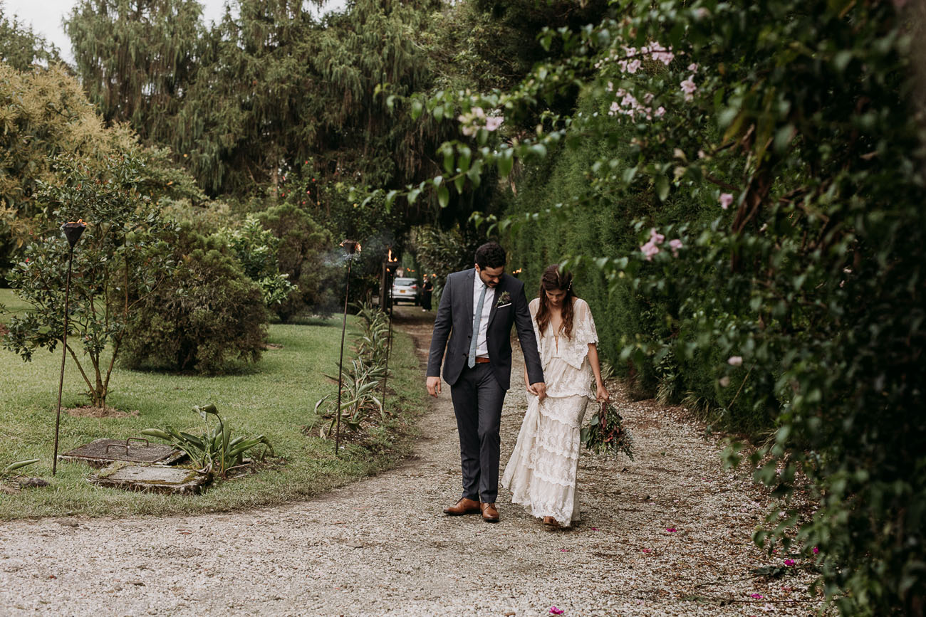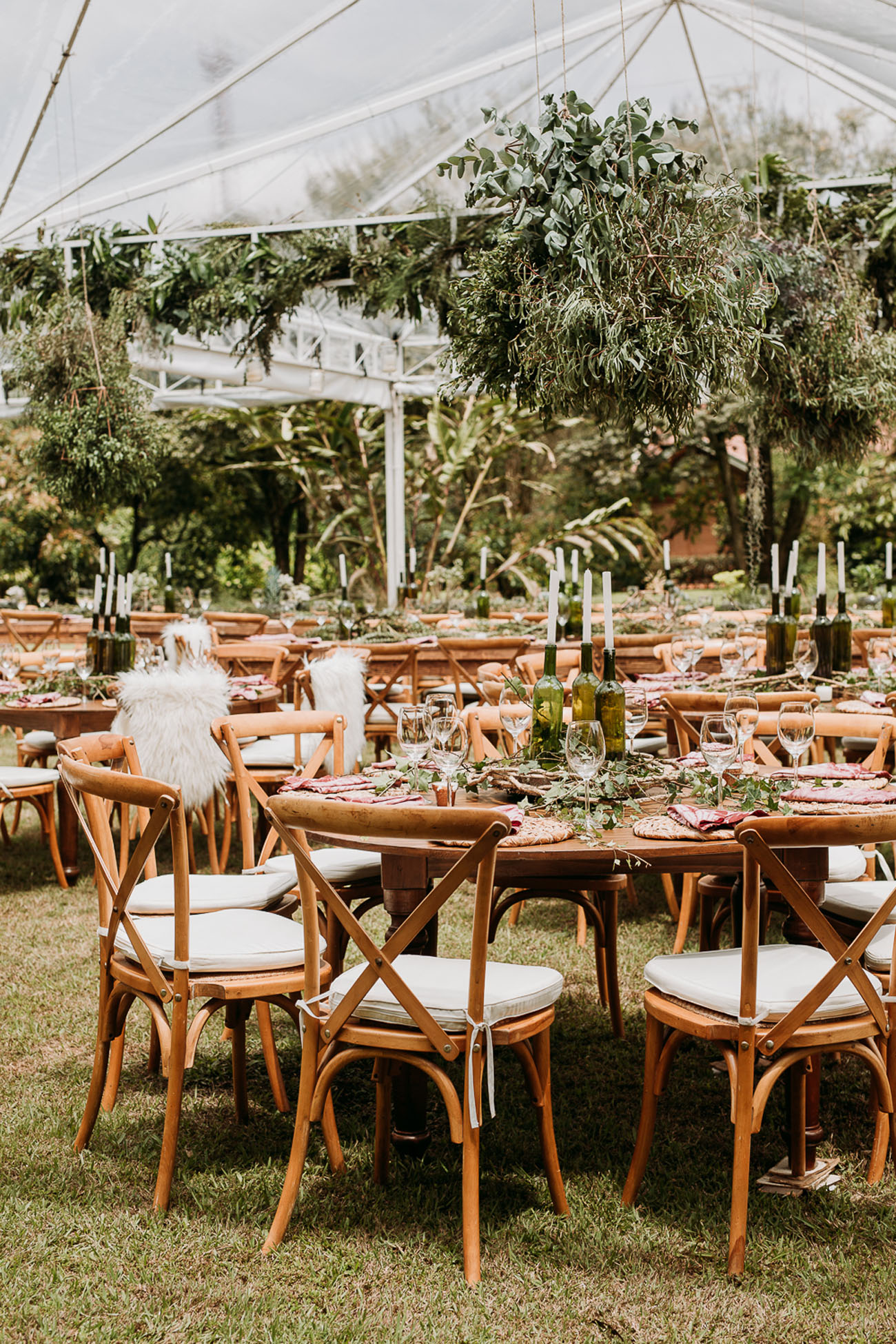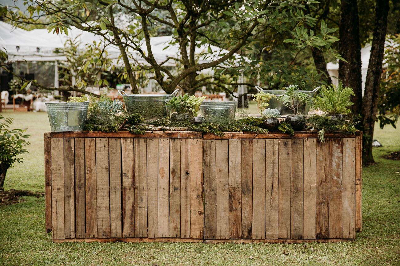 Lo primero: carpas al aire libre. Madera para la pista de baile y los baños; para el resto del piso: la manga, lo natural uniéndose a la celebración. Después, se unieron todos. La familia de su mejor amiga, le regaló todo el follaje verde para la decoración, la mamá de Juancho se encargó de los pasantes, los postres fueron de Bakeat (de una amiga de ella), la comida fueron hamburguesas Grillé (de un primo de él) y las cervezas del coctel fueron otro regalo de su hermano, que tiene una cervecería artesanal. Tuvieron un nombre especial “los contrayentes”, una etiqueta especial (que Sara diseñó), un sello especial: S&J y dos sabores especiales.