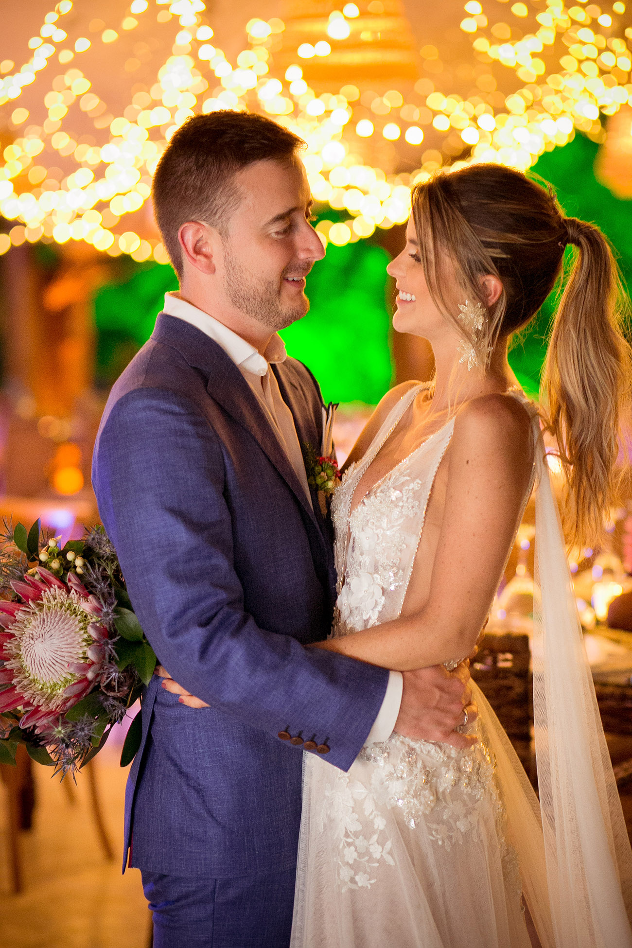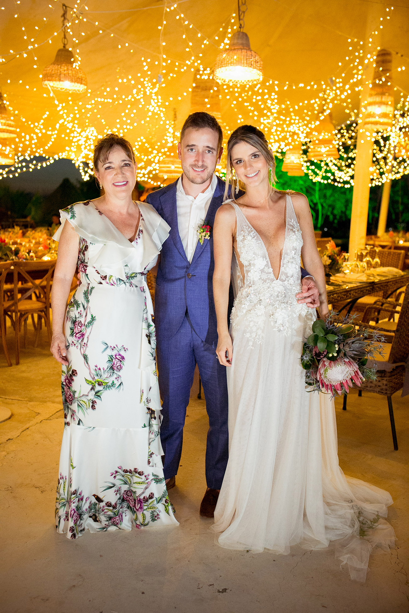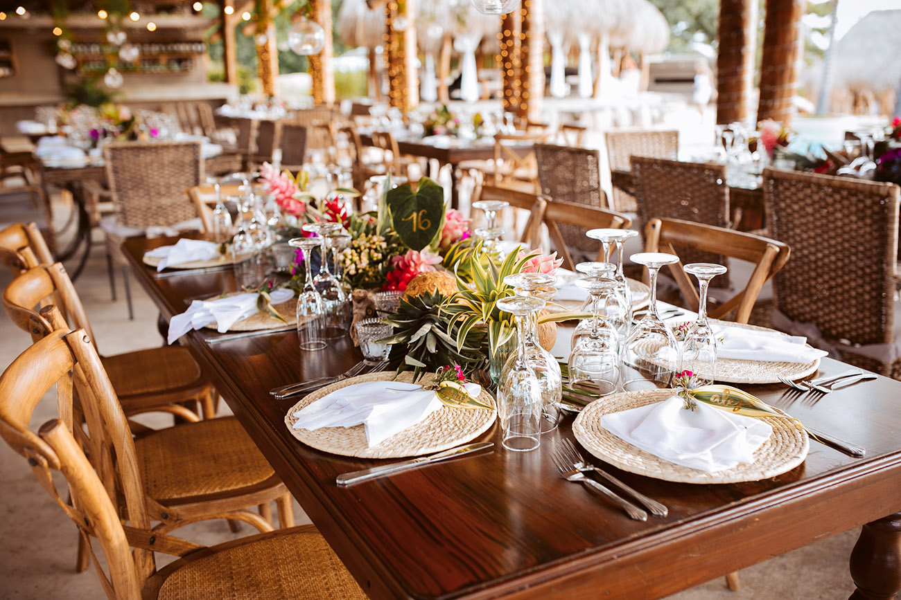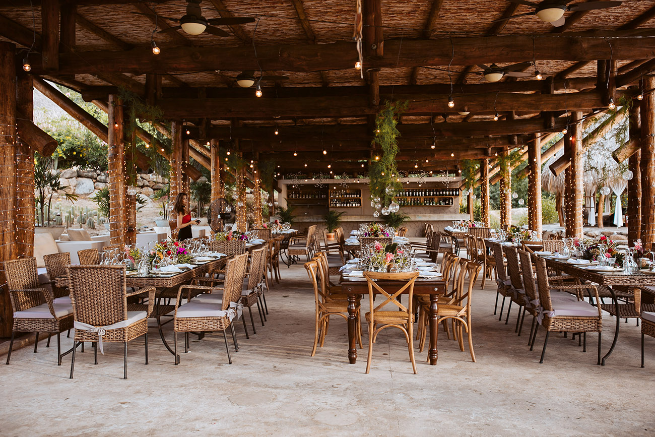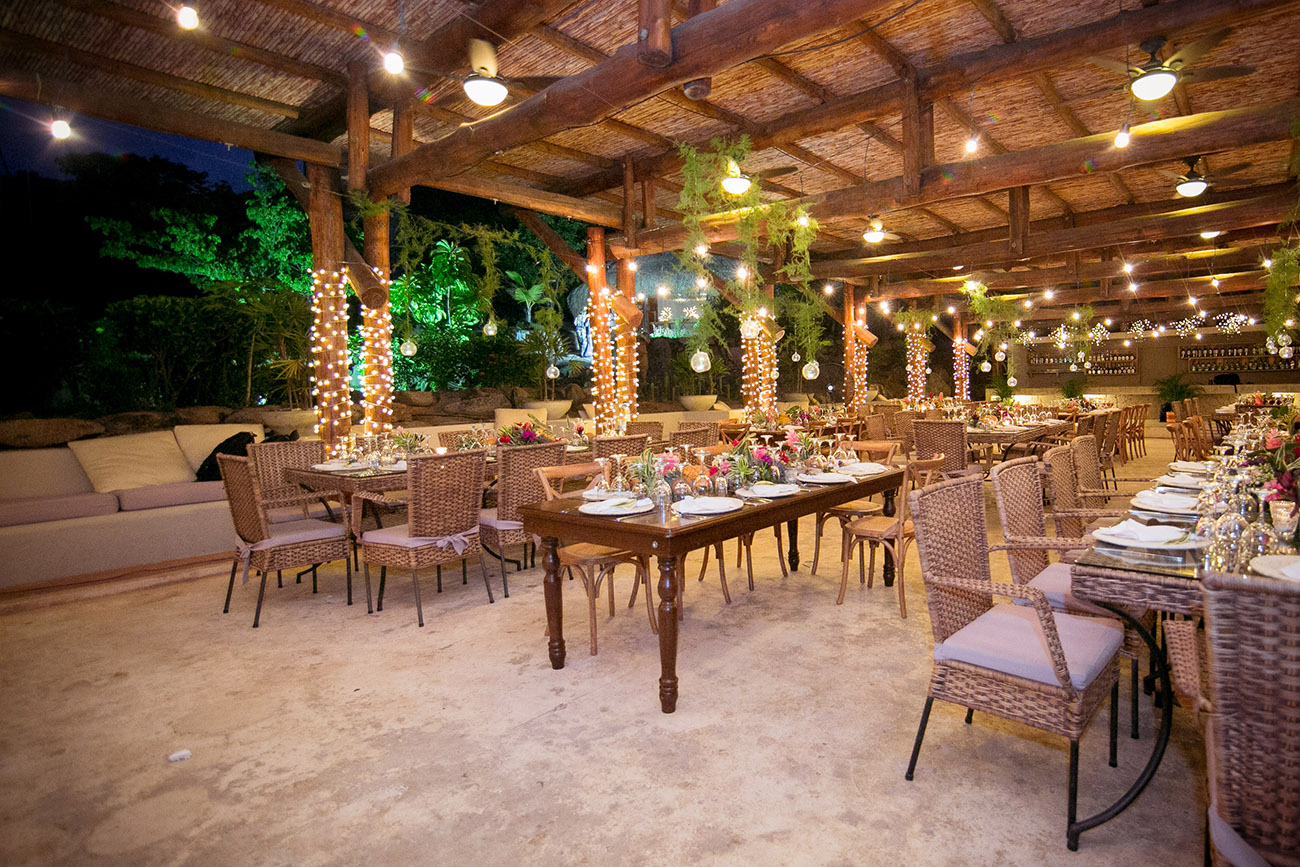 El piso con grietas naturales, la piscina sin fin y los kioskos de Mamancana eran suficientes para decorar el ambiente, pero un arco con follaje, flores y macramé como “altar”, muchas piñas, palmeras, centros de mesa tropicales, lucecitas, lámparas artesanales, platos tejidos y marcadores de mesa en hojas grandes, supieron agregarle el encanto exacto, reflejo de esa alegría desbordante que tiene este amor. La creadora: Marianela Moreno, de Verdementa Style.