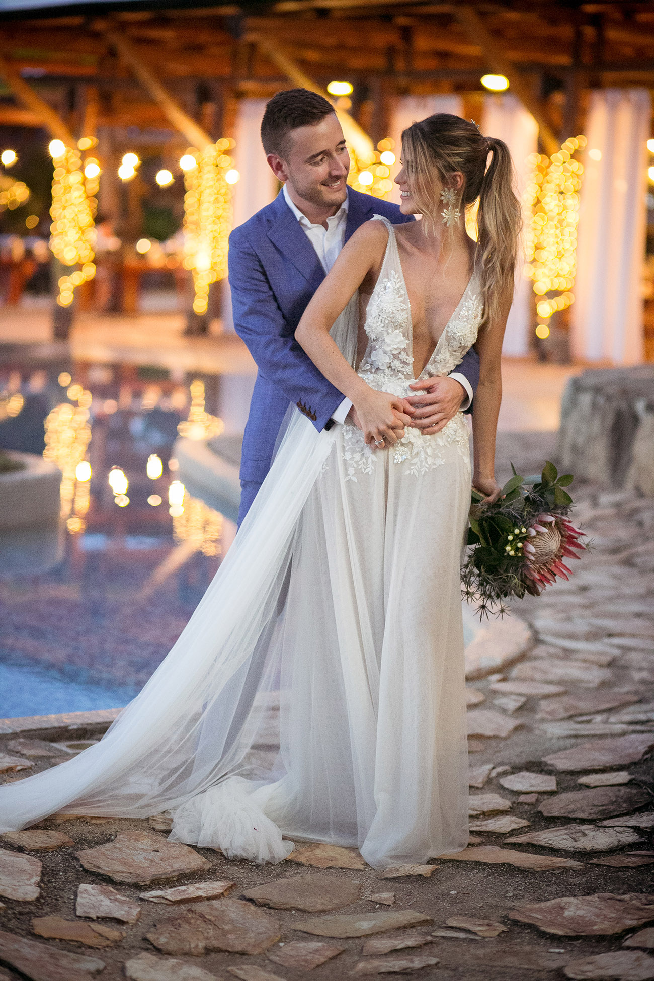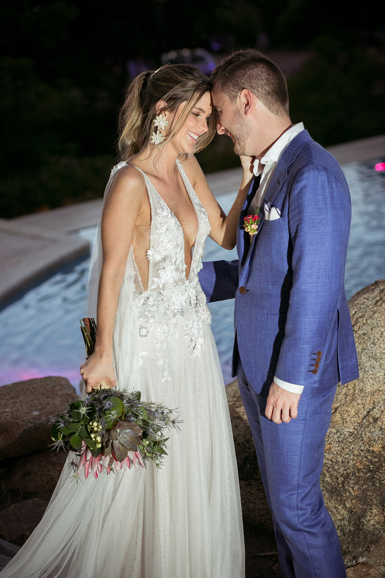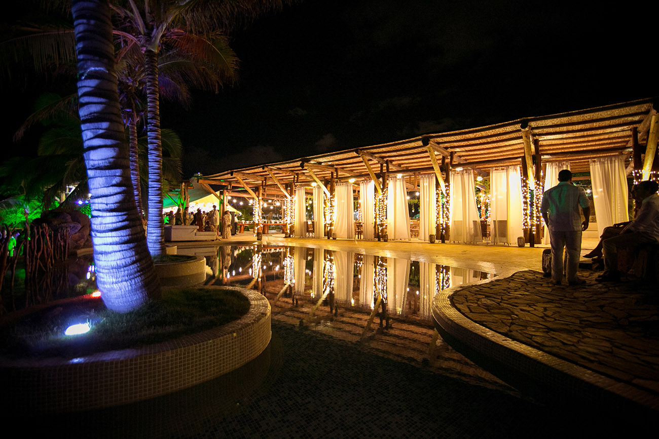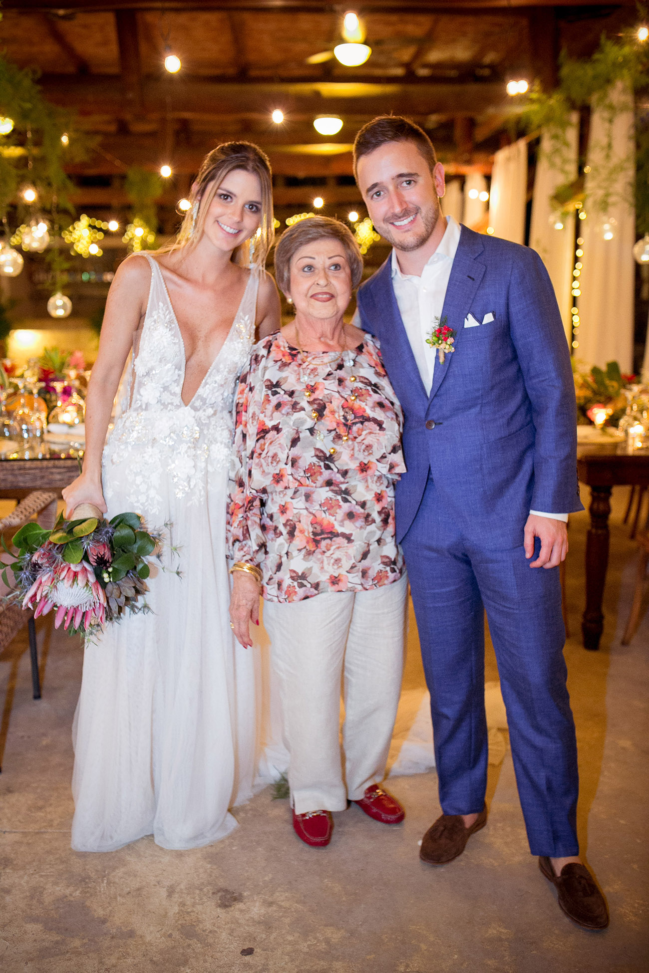 El piso con grietas naturales, la piscina sin fin y los kioskos de Mamancana eran suficientes para decorar el ambiente, pero un arco con follaje, flores y macramé como “altar”, muchas piñas, palmeras, centros de mesa tropicales, lucecitas, lámparas artesanales, platos tejidos y marcadores de mesa en hojas grandes, supieron agregarle el encanto exacto, reflejo de esa alegría desbordante que tiene este amor. La creadora: Marianela Moreno, de Verdementa Style.