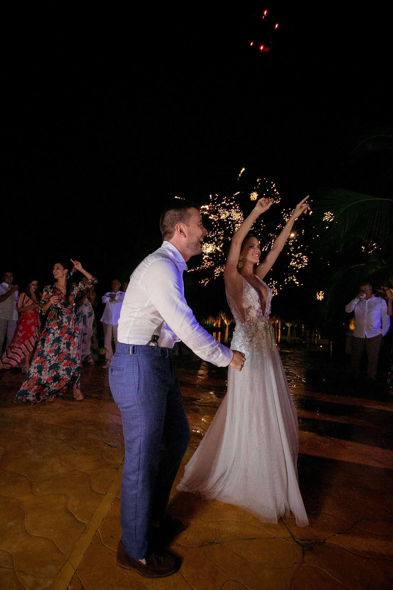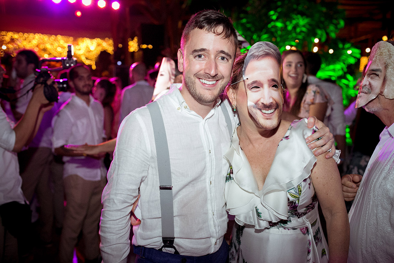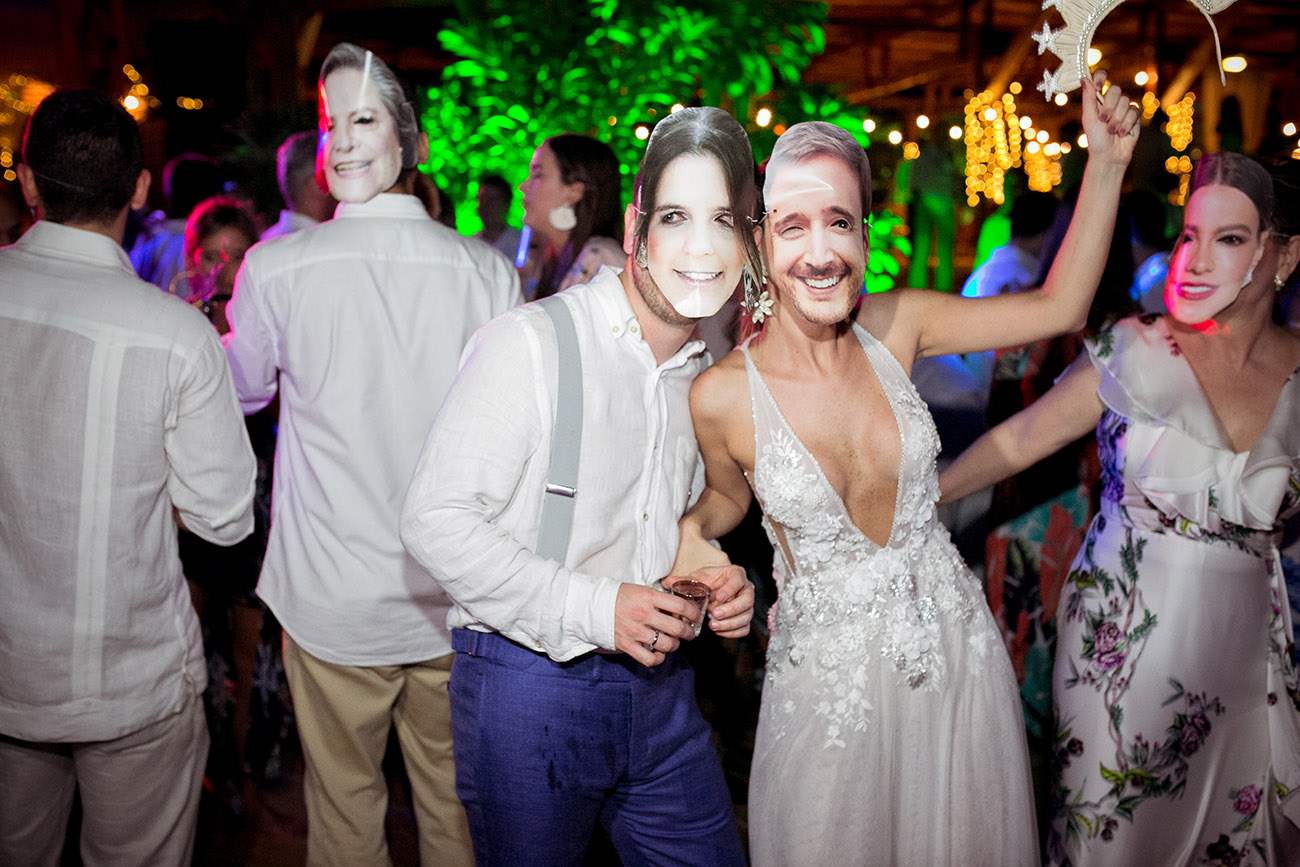 Quién más que el Caribe para otorgar sabrosura con su comida. De entrada: ceviche con aguacate servido en medio coco. De fuerte: posta cartagenera con arroz de coco. ¡Delicioso, sencillo y a la fija! Y luego, cuando el sabor estuvo en su punto, Sara y Mateo bailaron Magia, de Andrés Cepeda, para darle comienzo a una noche donde no faltó nada: hubo máscaras de famosos, hubo postres en Jars de la Repostería Maguichis (¡que fueron un éxito!), hubo pólvora y juegos pirotécnicos, hubo bailes, risas, hubo lluvia (que no logró opacar tanta energía), hubo fotos, muchas fotos, hubo amor, abrazos… El dj (dj Jova), que fue una de las elecciones más difíciles para Sara, no la defraudó. ¡Hubo fiesta, mucha fiesta!